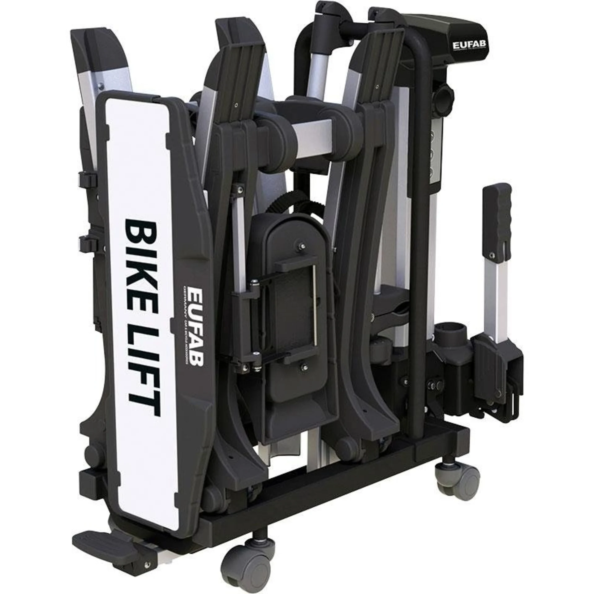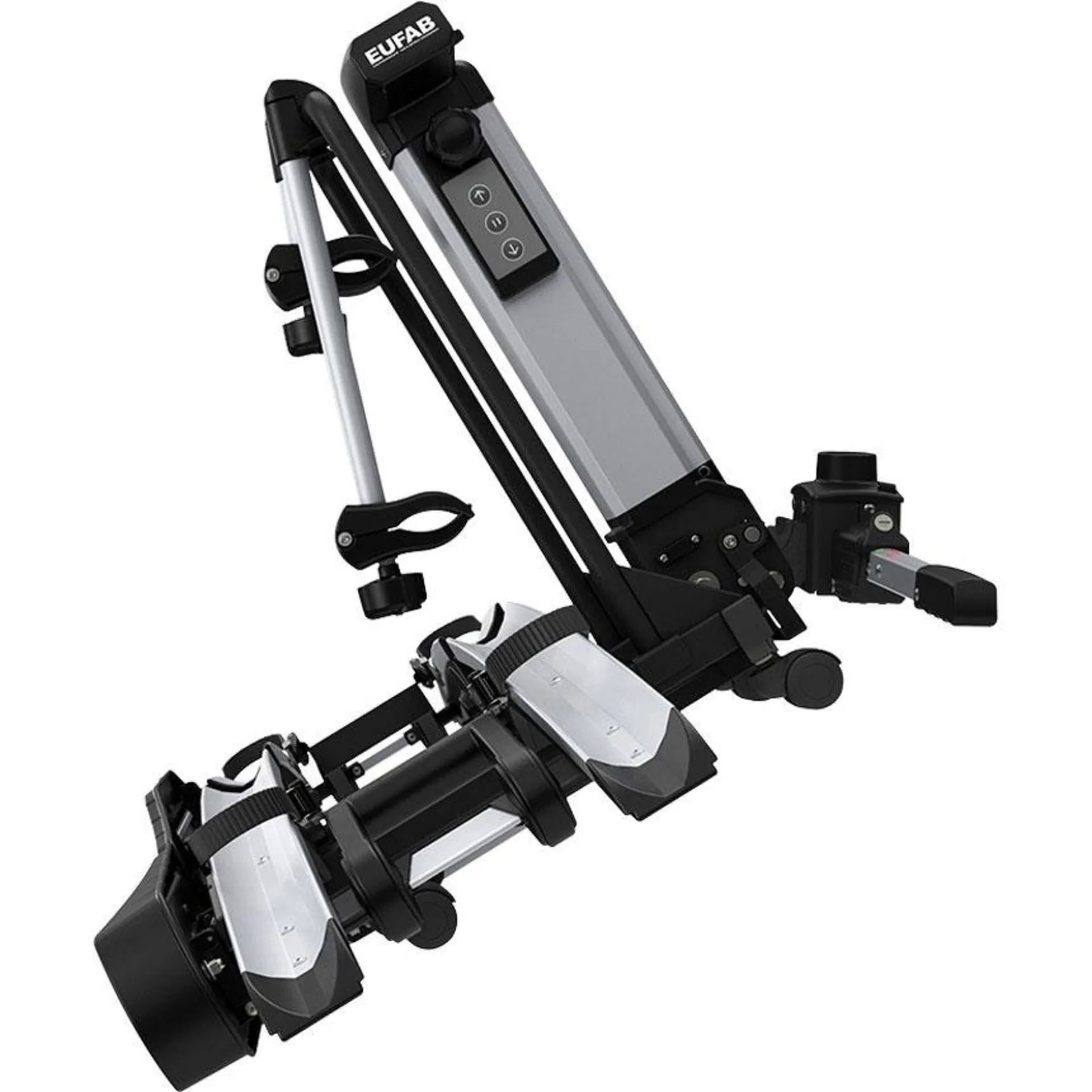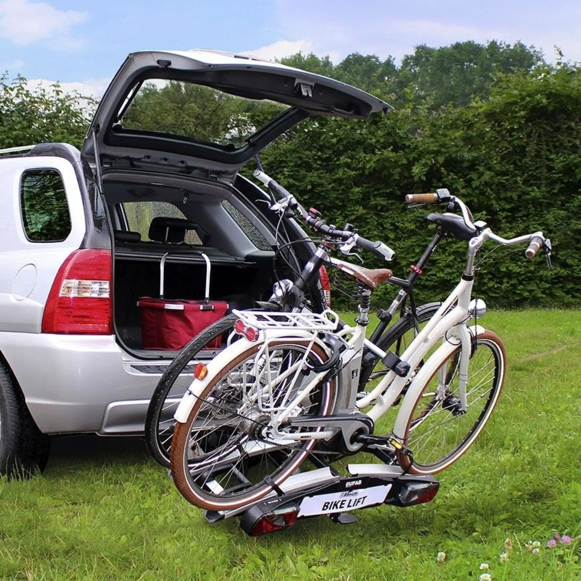Der Eufab Bike Lift ist ein Anhängerkupplungsträger für bis zu 2 Fahrräder. Der Fahrradträger ist ausgestattet mit einem Schnellverschluss und einem Abklappmechanismus, welcher mit einem Fußpedal bedient wird. Der Abklappmechanismus mit Zusatzsicherung ermöglicht in der Regel das Öffnen des Kofferraums auch mit montierten Fahrrädern. Die Fahrräder werden sicher befestigt mit Hilfe von abnehm- und abschließbaren Rahmenhaltern und Spanngurten mit Ratschen.
