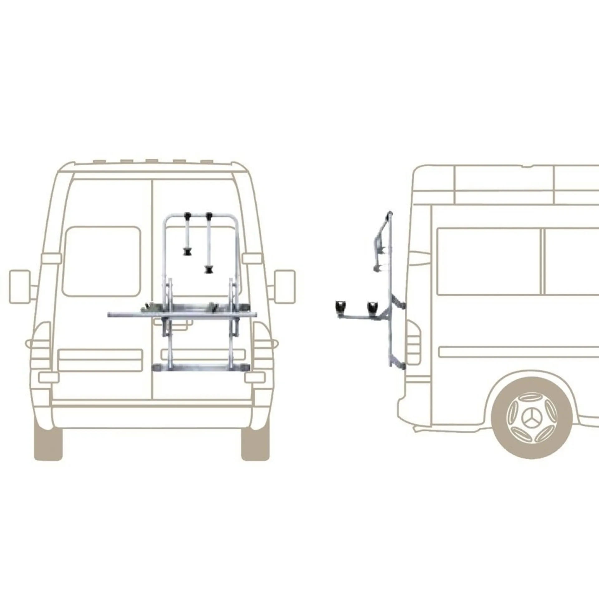 Vormontierter Fahrradträger für die rechte Hecktüre. Grundrahmen aus eloxiertem Aluminiumrohr.
