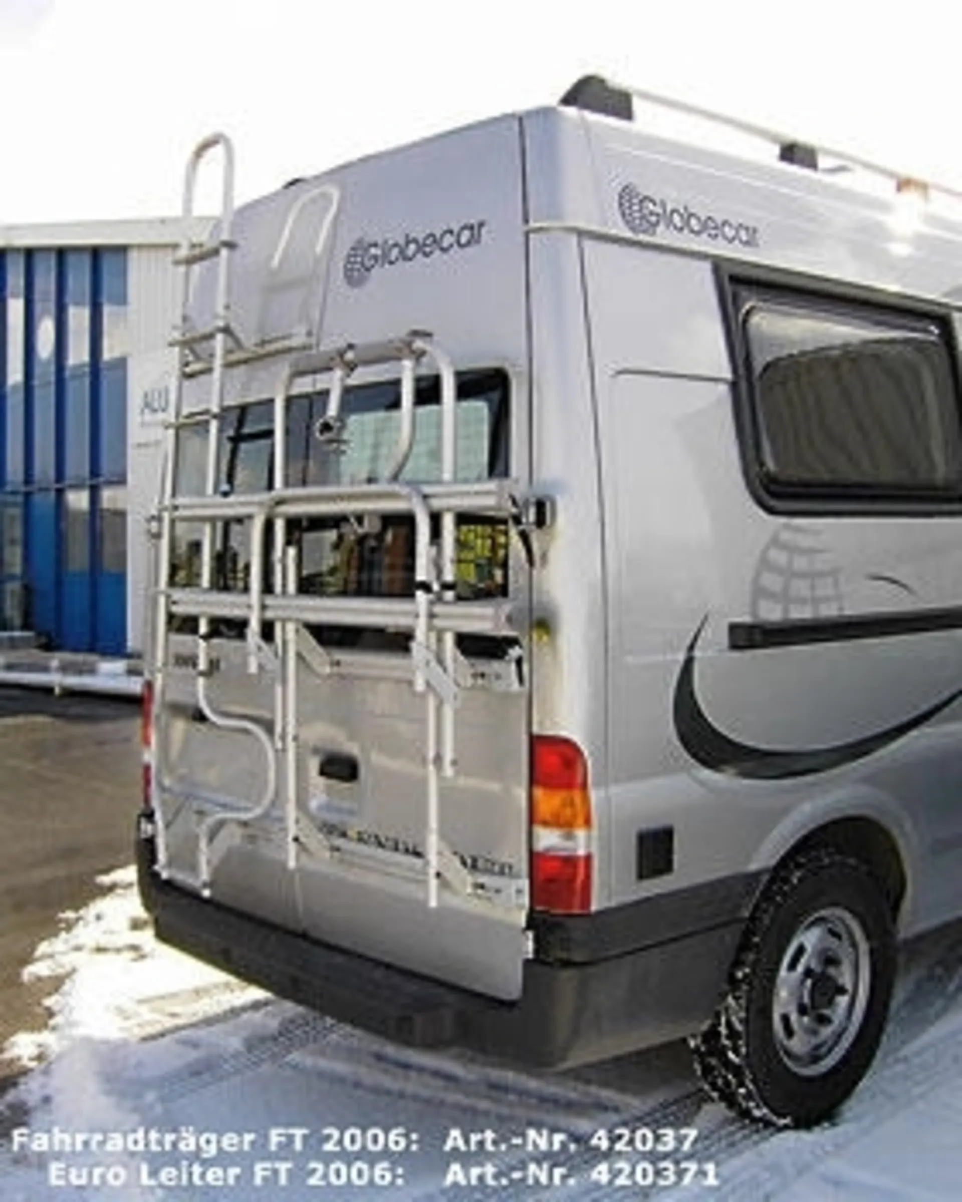 Aluminium-Fahrradträger für den Transport für max. 2 Rädern. Für fast alle Räder geeignet. 2 Fahrradabstandhalter für sichere Befestigung der Räder. Alu-Fahrradschienen mit verstellbaren Befestigungsblöcken für die Felgen. Breite Aufnahmeschienen verteilen die Last großflächig auf das Blech. Für Ford Transit Modell 2000 (bis 2013). Aufgrund der hochgezogenen Träger kann der Fahrradträger sowohl als Hochlader als auch als Tieflader mit Rückleuchtensatz und Kennzeichenwiederholung eingesetzt werden.