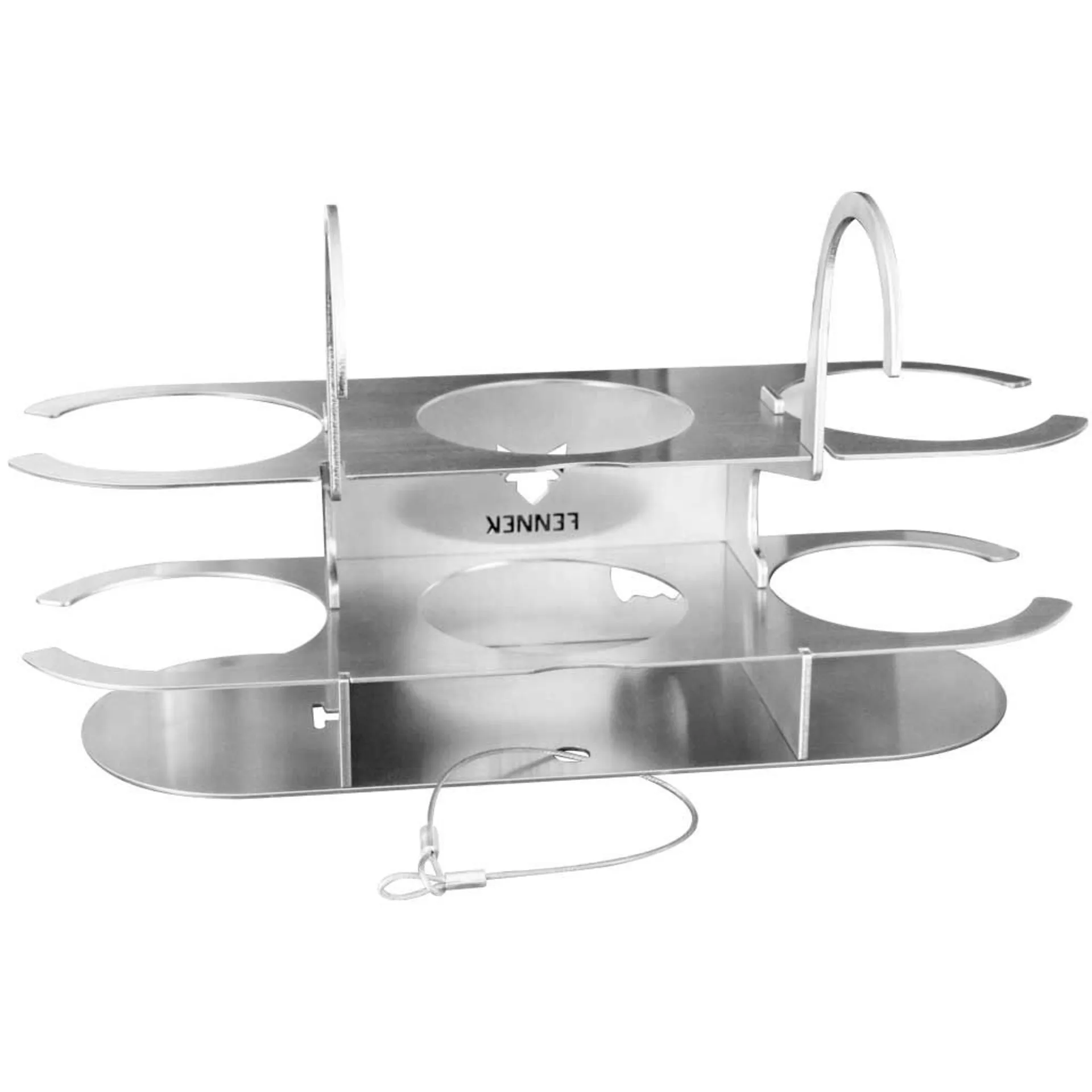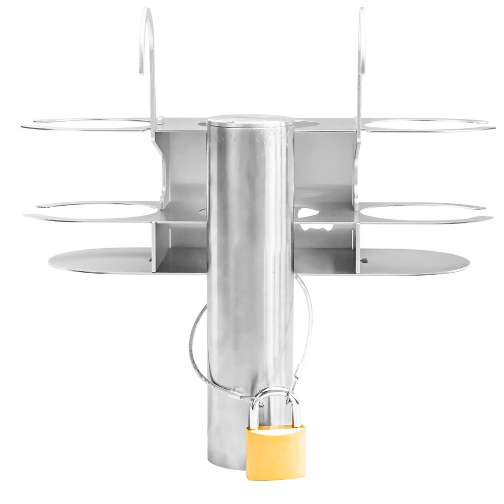 Der Getränkehalter besteht vollständig aus Edelstahl, wird zusammengesteckt und trotzt Wind und Wetter. Die durchdachte Sicherung, verhindert unerlaubtes Entfernen indem der Getränkehalter mit einem Stahlkabel und einem Schloss abgeschlossen werden kann. (Das Schloss ist nicht im Lieferumfang enthalten!)
