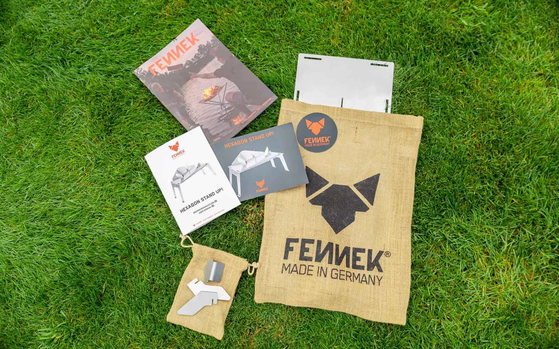 - Lieferumfang: 1 Bodenplatte x 2 Standfüße x 2 Seitenflügel x 6 Sicherungshalter für Hexagon x 4 Sicherungshalter für Grillrost 4Fire x 1 Beutel für Kleinteile x 1 Jute Beutel zum Verstauen