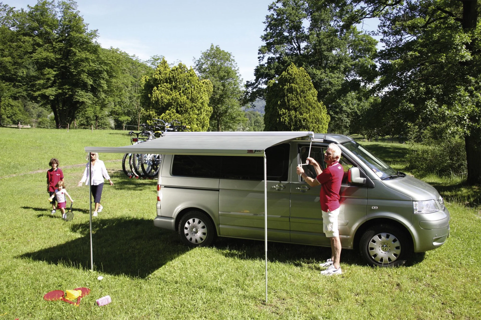 Wichtig: Beim T5/T6 Multivan/Transporter ist die originale Aluschiene von VW erforderlich. Öffnung und Verschluss der Fiamma F45s erfolgt mit Kurbel.