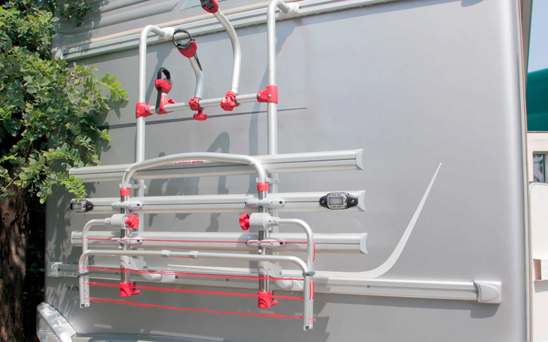 Wäscheständer, der sich an den Auflagebügel der Fahrradträger mit Ø 35 mm Rohre anbringen lässt. Wird ohne Bohren an die Carry-Bike mit einem Achsenabstand von 60 cm auf 80 cm angebracht. Die Endstücke haken sich an den Rohren des Auflagebügels ein und der Ständer lässt sich durch Einrasten ohne Mühe montieren. Das Reisen mit dem Ständer ist dank der klappbaren, innovativen Struktur im geschlossenen Zustand möglich. Ausgeliefert mit Kunststoffseilen für die aufzuhängenden Textilien und mit Feststellschraube zum Fixieren. Aus widerstandsfähigem und leichtem Rohr aus eloxiertem Aluminium mit Ø 22 mm.