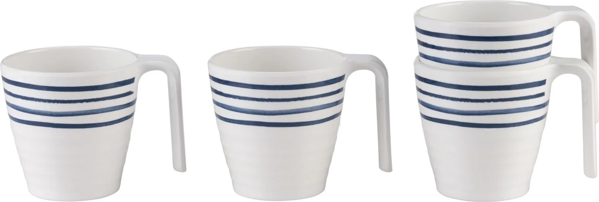 Praktische Tassen in toller Steingut-Optik passend zum Geschirrset Azure. Bruchstabil, spülmaschinengeeignet und temperaturbeständig bis + 70° C. Nicht für die Mikrowelle geeignet. Volumen: 300 ml. Material: 100 % Melamin.