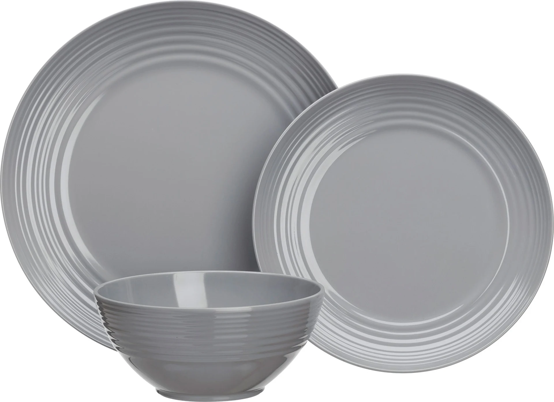 4 Müslischalen (Ø 15,5 cm), 4 Dessertteller (Ø 22,5 cm), 4 Essteller (Ø 26,5 cm)