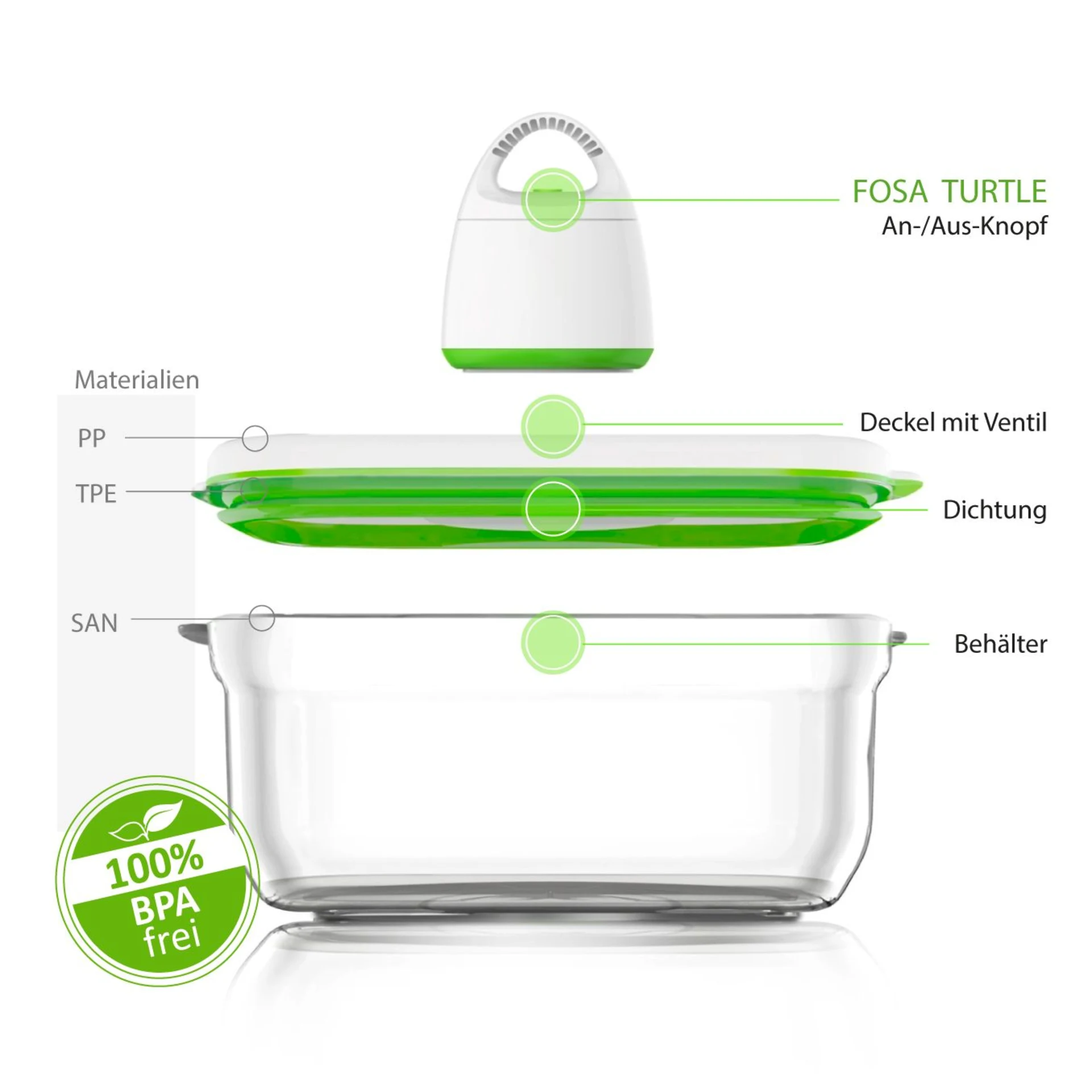 FOSA BARCELONA hält Lebensmittel im Vakuum 5x länger frisch als herkömmliche Aufbewahrungsdosen. Eine leistungsstarke Vakuumpumpe 'TURTLE', nicht größer als ein Kaffeebecher, zieht die rechteckigen Behälter aus hochwertigem, kristallklarem Kunststoff ins Vakuum. Sobald der Inhalt in der Aufbewahrungsdose platziert wurde ist der Deckel bündig aufzulegen. Der TURTLE ist auf der Aussparung im Ventildeckel zu positionieren. Mit nur 4 handelsüblichen AA-Batterien arbeitet der TURTLE mit nur einem Knopfdruck. Sie können den TURTLE loslassen, denn sobald das Vakuum erreicht ist stoppt der TURTLE automatisch. Die Aufbewahrungsdose ist nun hermetisch abgeschlossen und lässt sich nun nicht mehr unbemerkt öffnen. Gerüche können weder in das Gefäss ein- oder austreten, somit bleiben auch empfindliche Lebensmittel geruchsgeschützt. Hierfür sorgt der einzigartige Siegelverschluss mit aufwendiger Dichtungstechnologie, ein Wunderwerk der Technik! Die Aufbewahurngsdose können Sie ganz einfach per Knopfdruck wieder 'entsiegeln', mit den gegenläufigen Taben am Deckel lässt sich dieser einfach anheben, um den Inhalt zu entnehmen. Überzeugen Sie sich selbst, wie einfach und effektiv das FOSA Vakuumsystem ist!