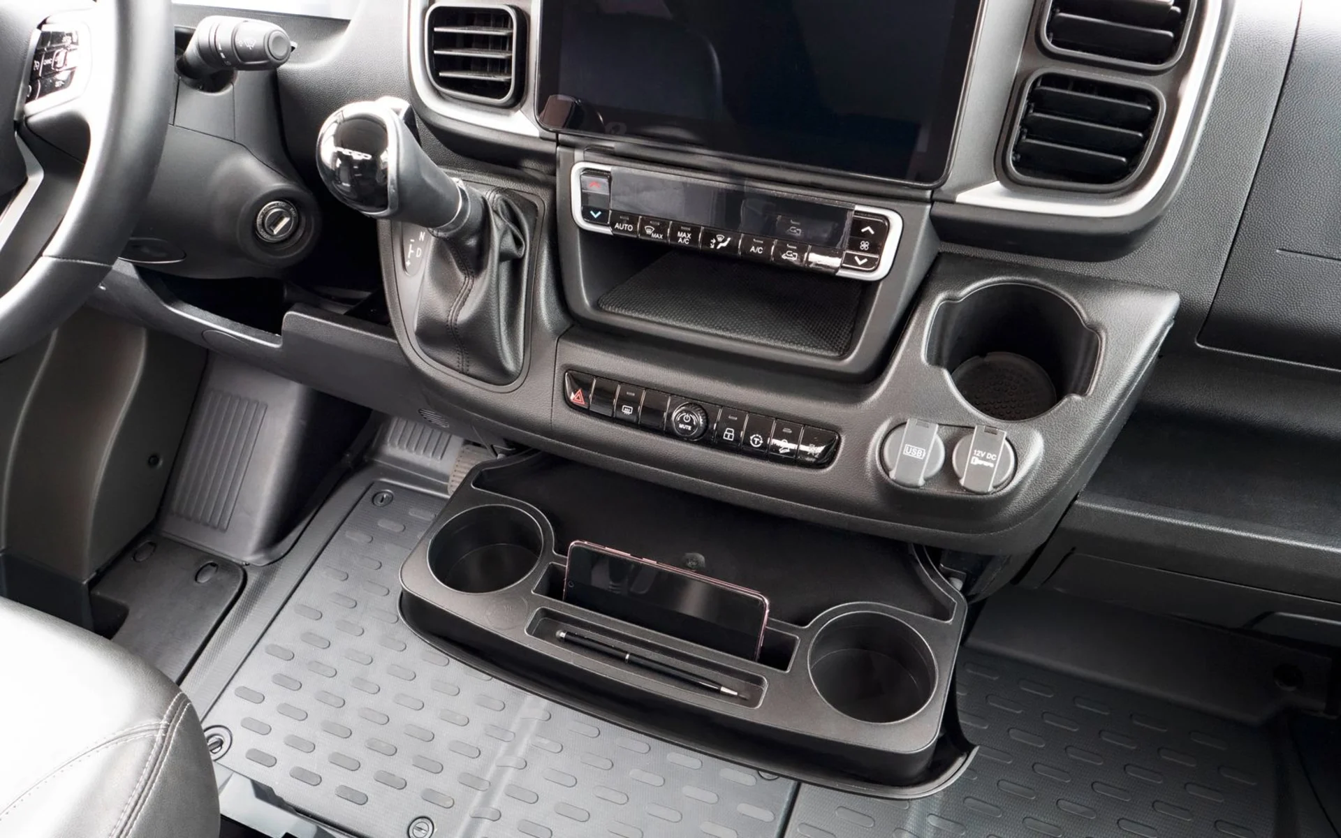 Ablage mit 2 Cupholder und der Möglichkeit Mobiltelefon(e) oder Tablet sicher abzustellen (Mobiltelefon kann schräg abgestellt werden um die Navigation abzulesen).