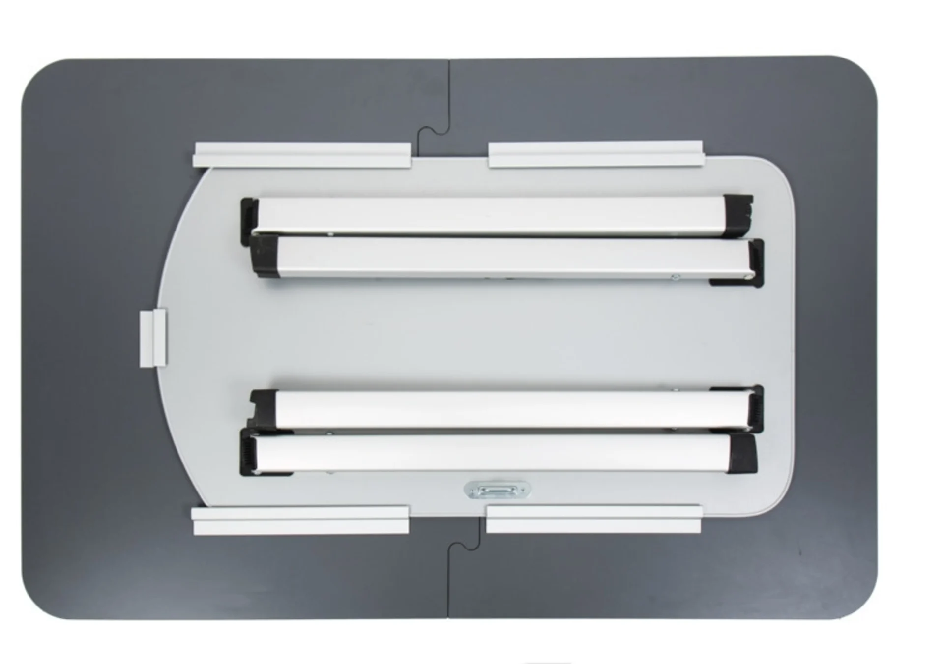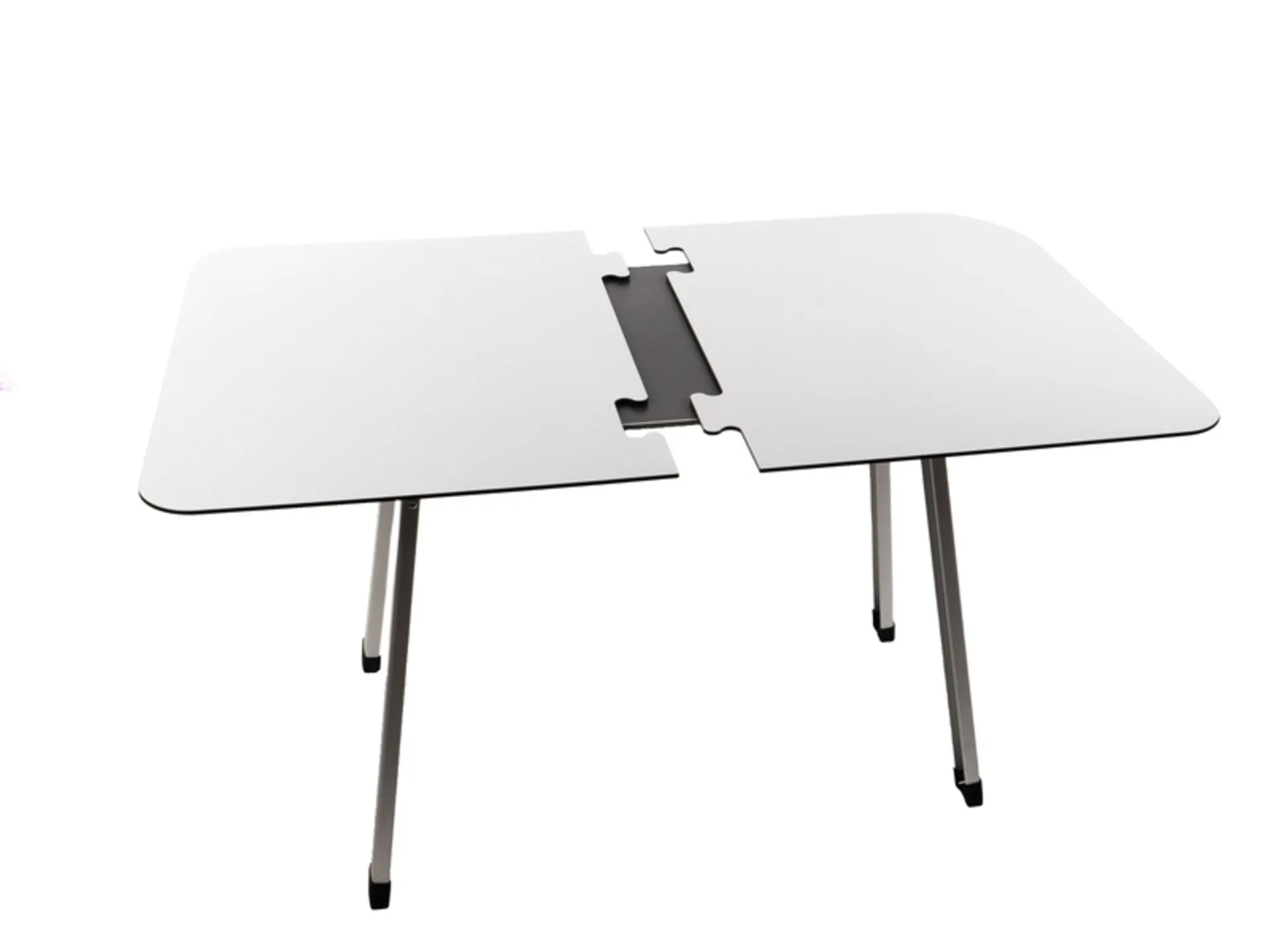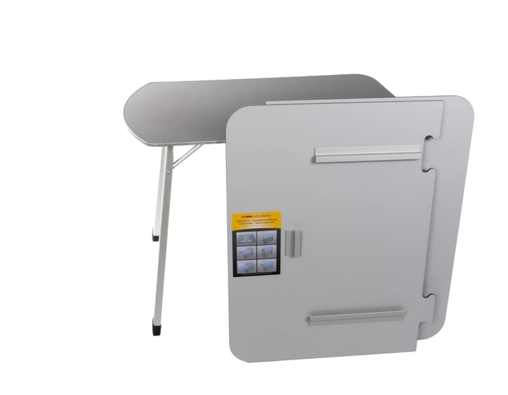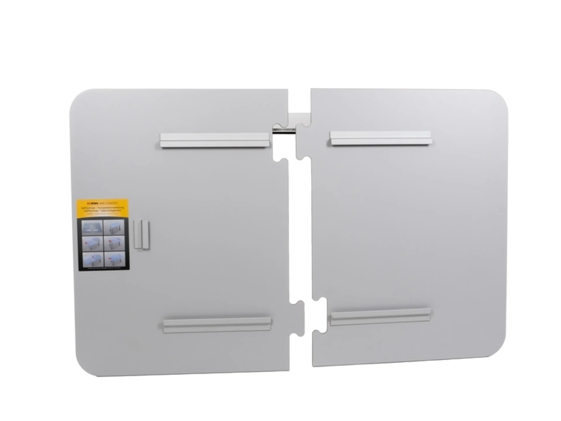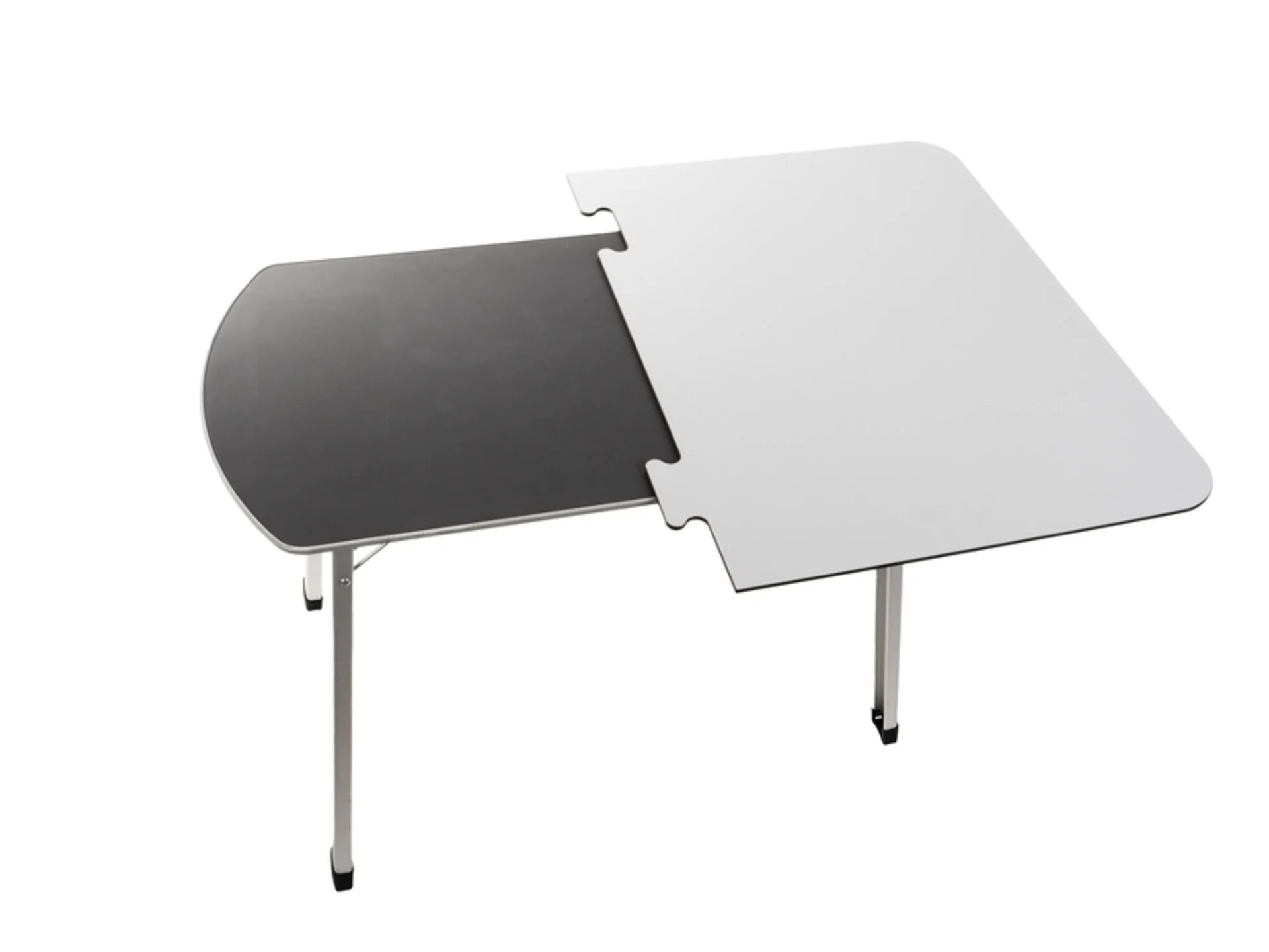 Extension du plateau de table à glisser facilement sur la table de camping California. Agrandit le plateau de table jusqu'à deux fois sa taille (environ 120 x 80 cm). Facile à ranger et à manipuler : 2 moitiés de plateau qui s'emboîtent l'une dans l'autre.