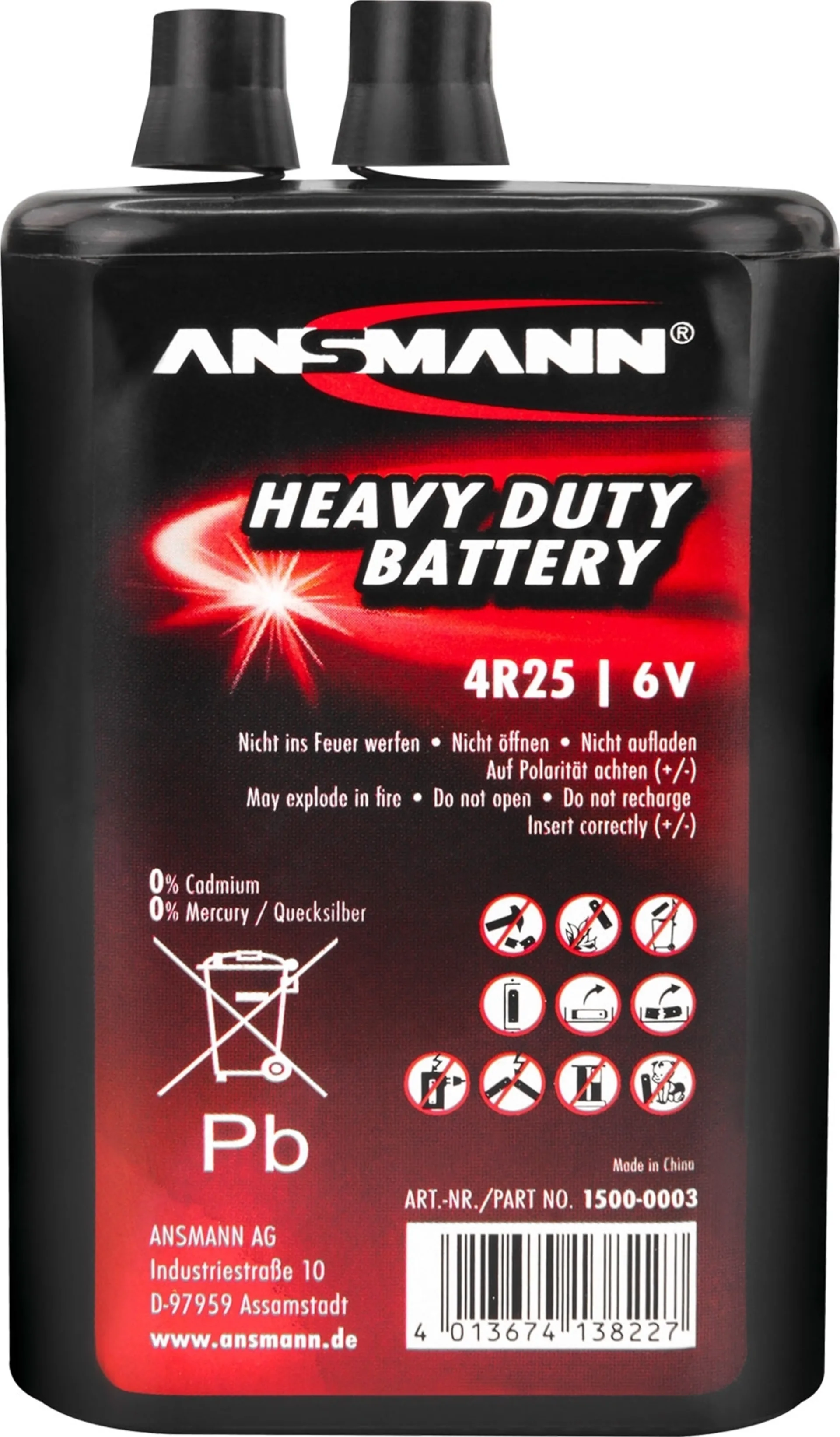 Pile au carbone-zinc (6V) d'une capacité de 9000mAh. Convient à différentes applications électriques, comme les lampes de poche, les lanternes et les éclairages en camping, à la pêche, dans l'agriculture ou sur les chantiers (par ex. lampes de chantier, protection des chantiers).