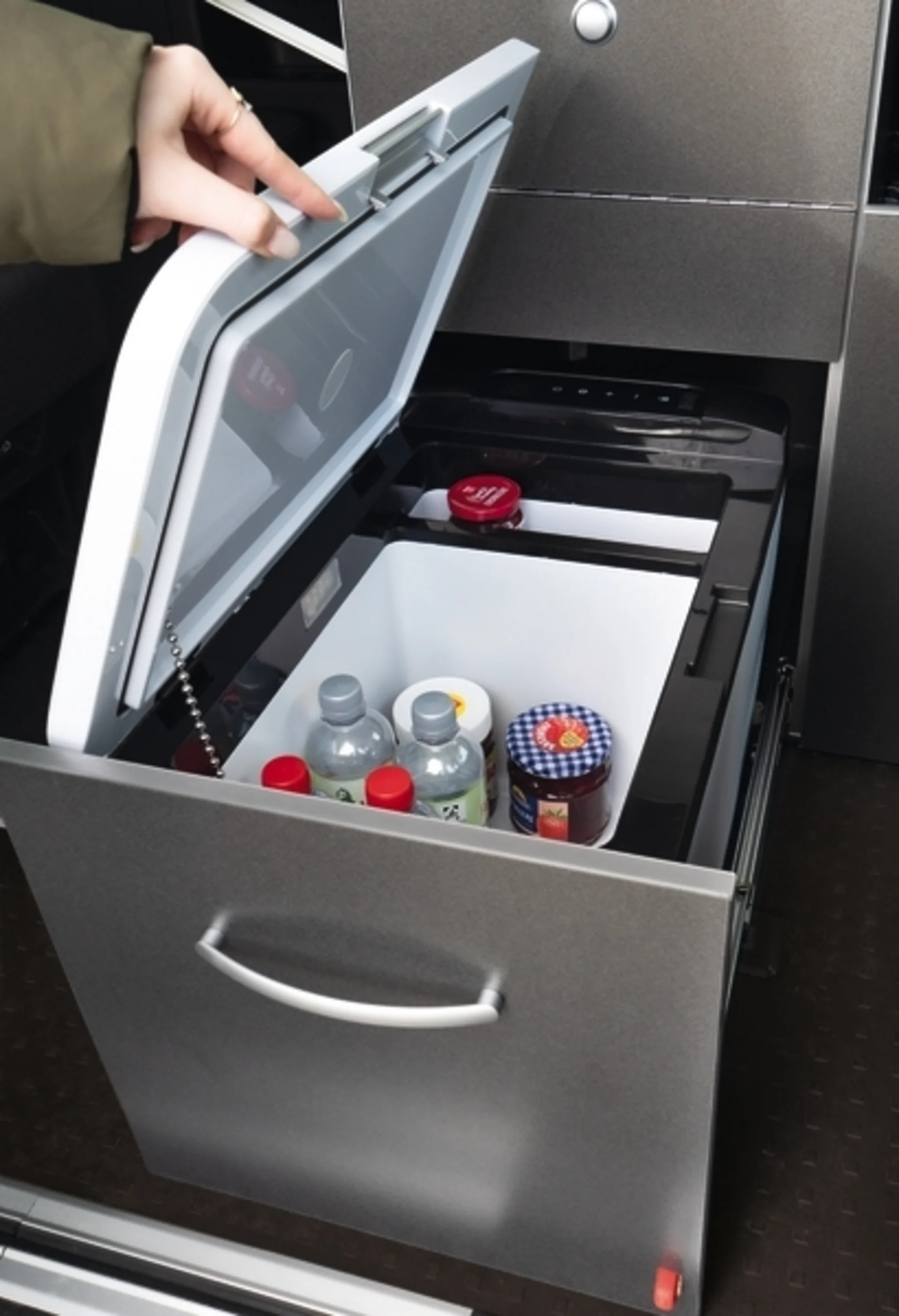 Le module d'aménagement CaliSchrank offre un équipement polyvalent. La table pliante en direction de la banquette, avec un miroir au-dessus, sert de table de travail, de maquillage ou de repas. Au-dessus de la glissière verrouillable pour une grande glacière à compresseur de 26L (en option) se trouve un tiroir pour les couverts et autres ustensiles, complété par une tablette coulissante comme surface de travail supplémentaire ou comme support pour la cartouche de gaz située au-dessus. Le compartiment de rangement supérieur avec étagère offre suffisamment de place pour toute la vaisselle et les provisions. Grâce à la possibilité de coulisser en longueur, chaque conducteur peut s'asseoir confortablement et de manière détendue. Même lorsque la cuisine est installée, la longueur totale du lit est disponible. L'armoire Cali se retire en un tour de main sans outils et peut également être utilisée dans l'auvent ou sous le store.
