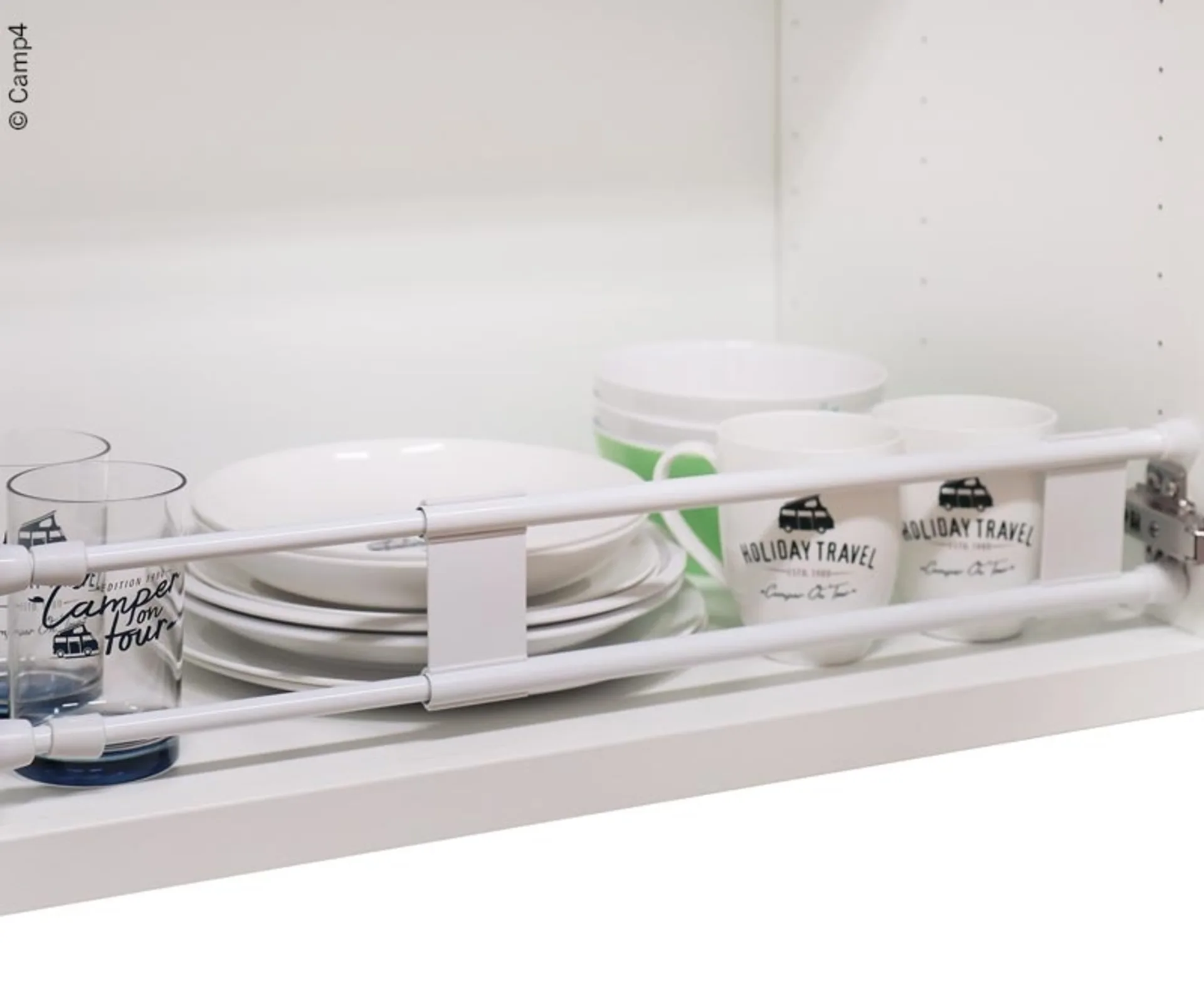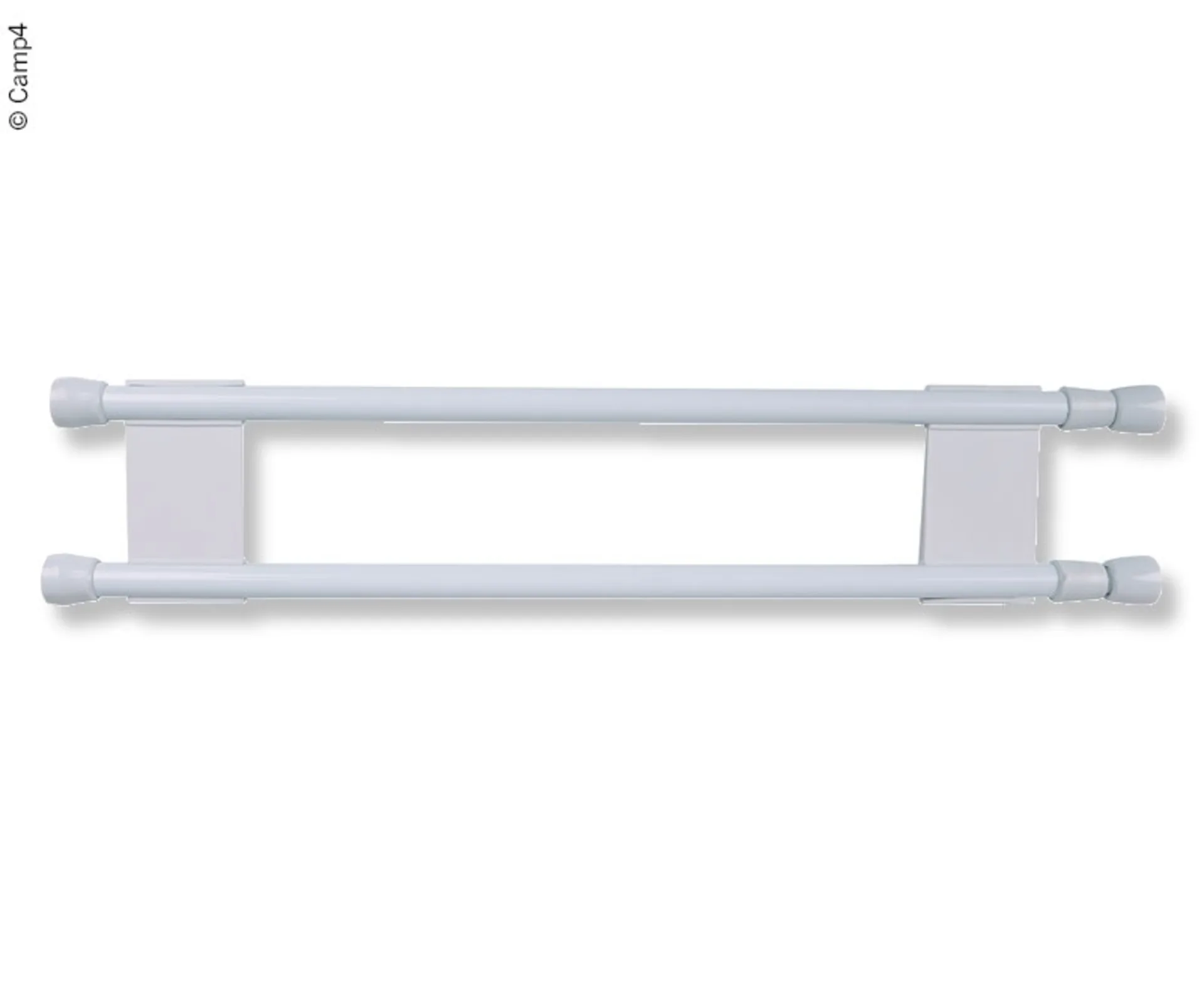 Barres de serrage télescopiques de longueur variable avec entretoises pour, par exemple, le réfrigérateur ou le placard à provisions.