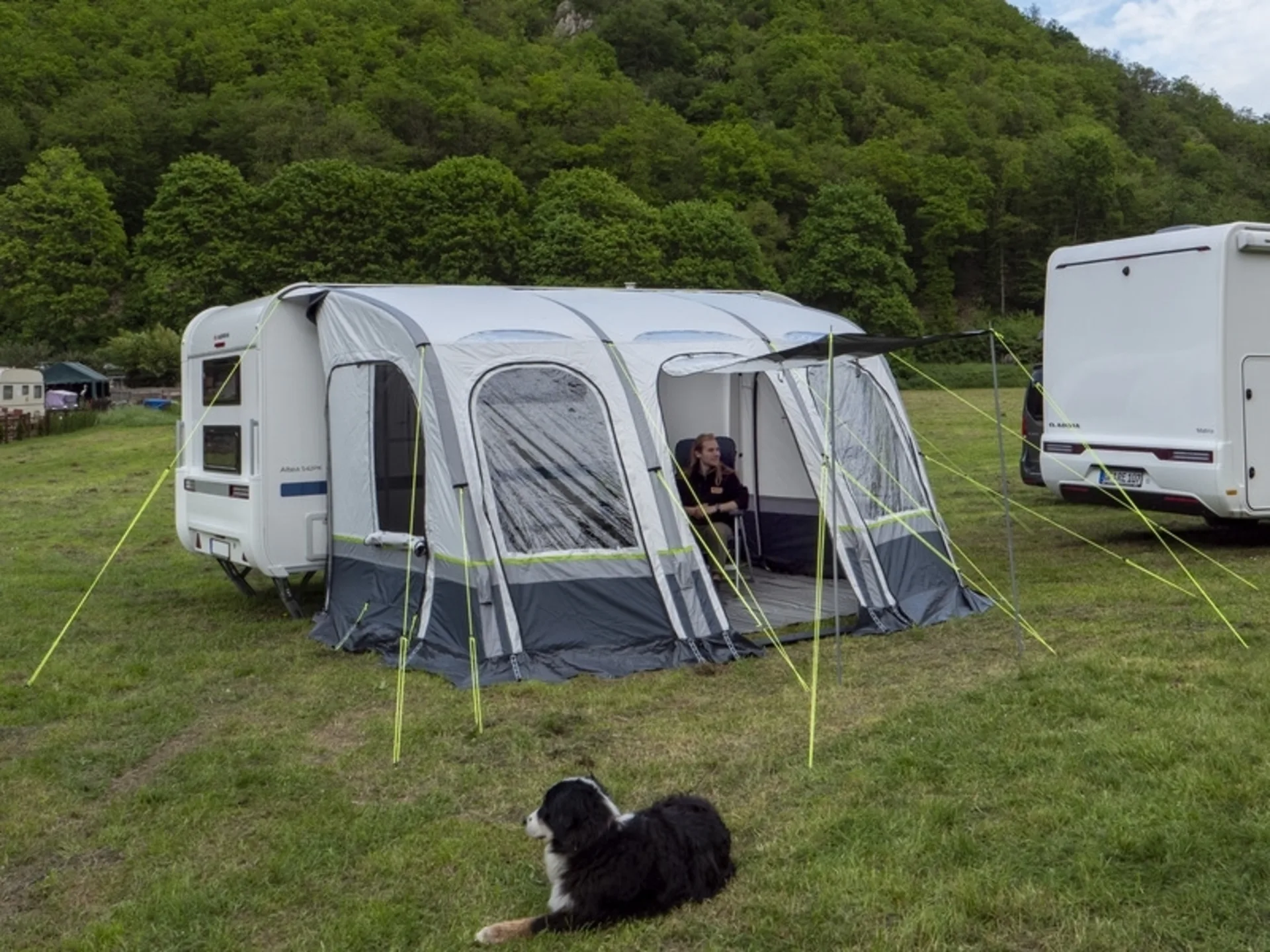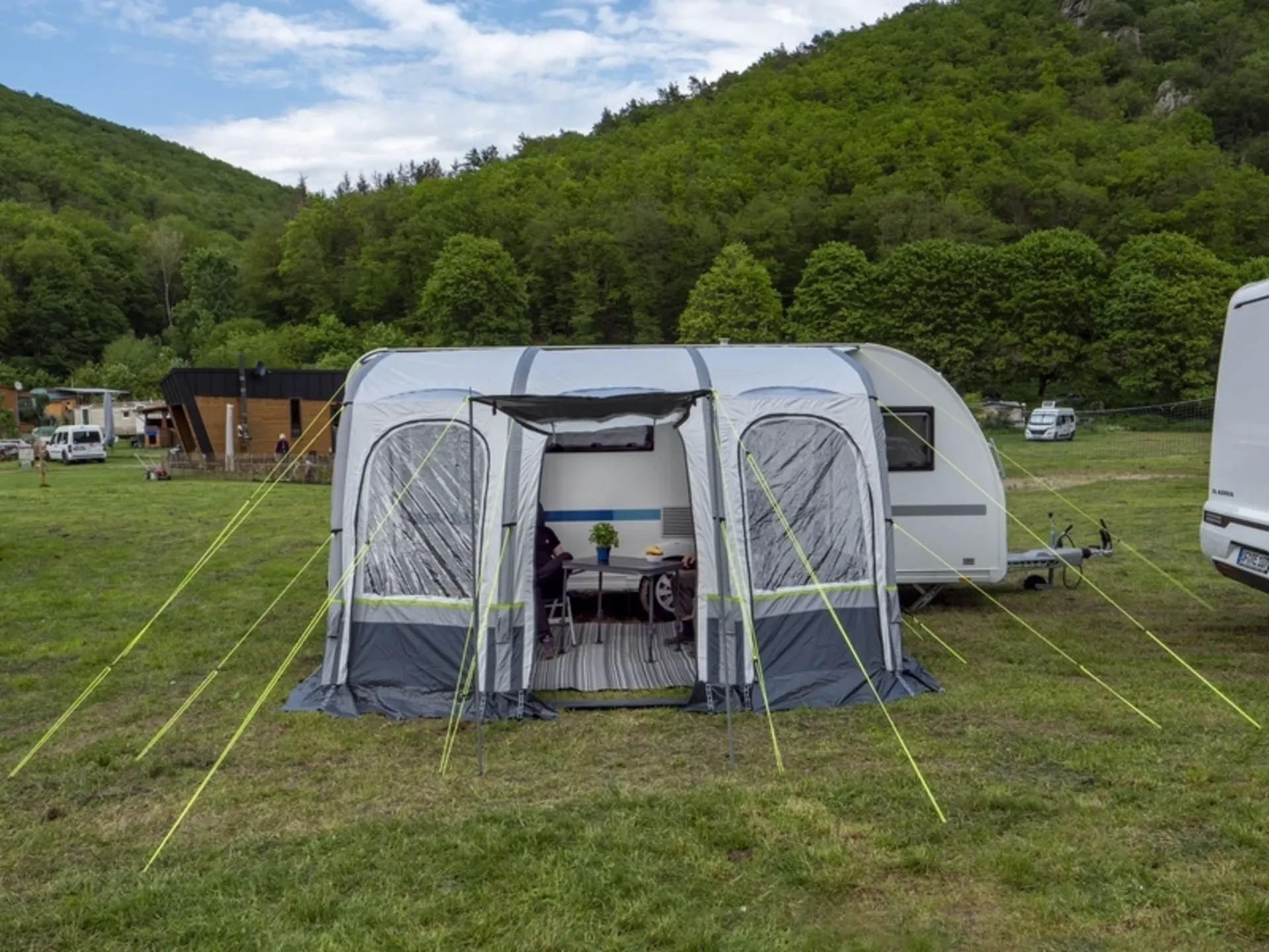 Pour une protection optimale contre le vent, le pare-vent inclus peut être rétracté sur la caravane.