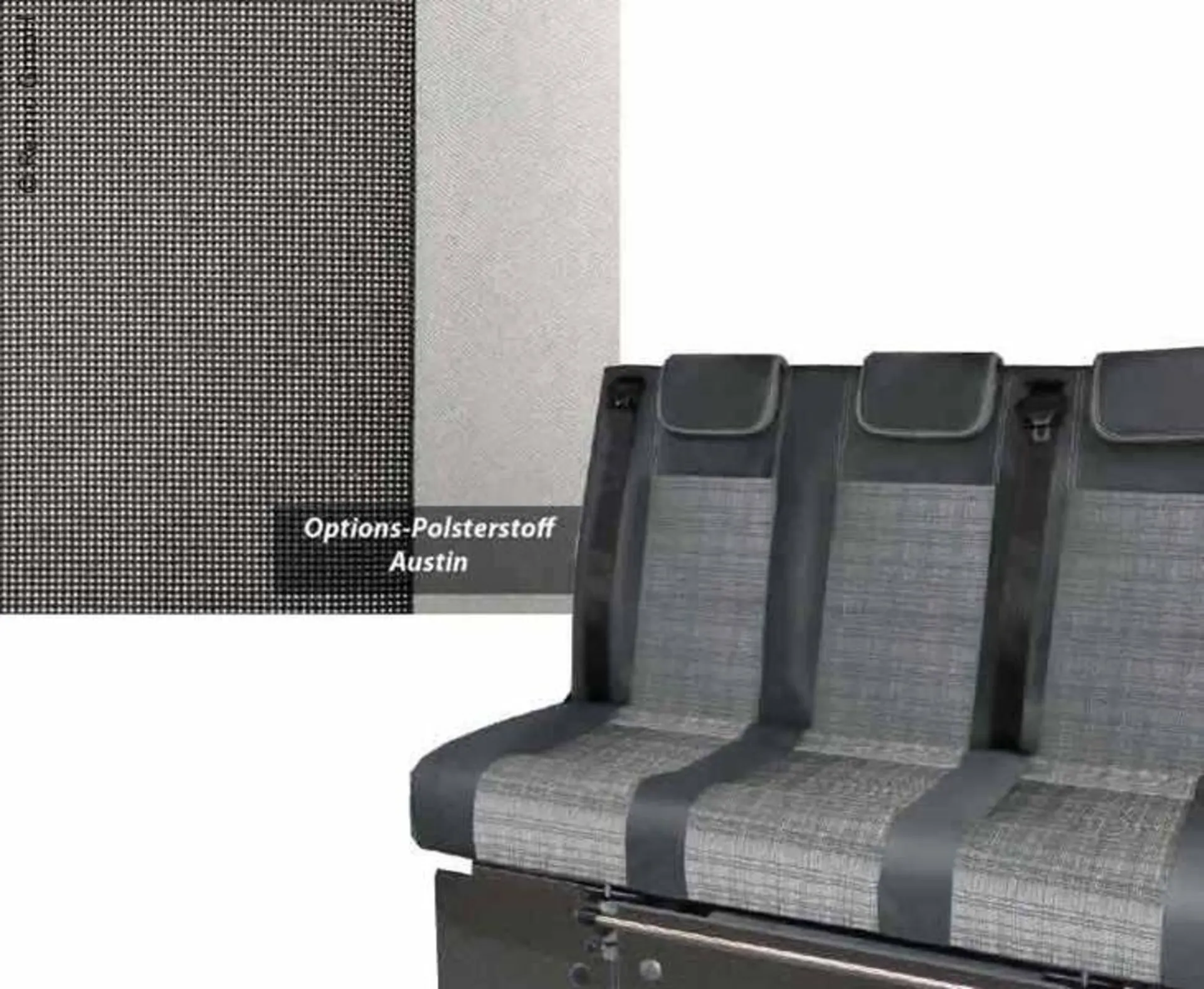 banquette-lit pour 3 personnes VW T6. Weekender Pus V3000 taille 14 déplaçable et amovible, distance entre les rails 826 mm. Banquette-lit avec support Isofix pour 2 sièges enfants.