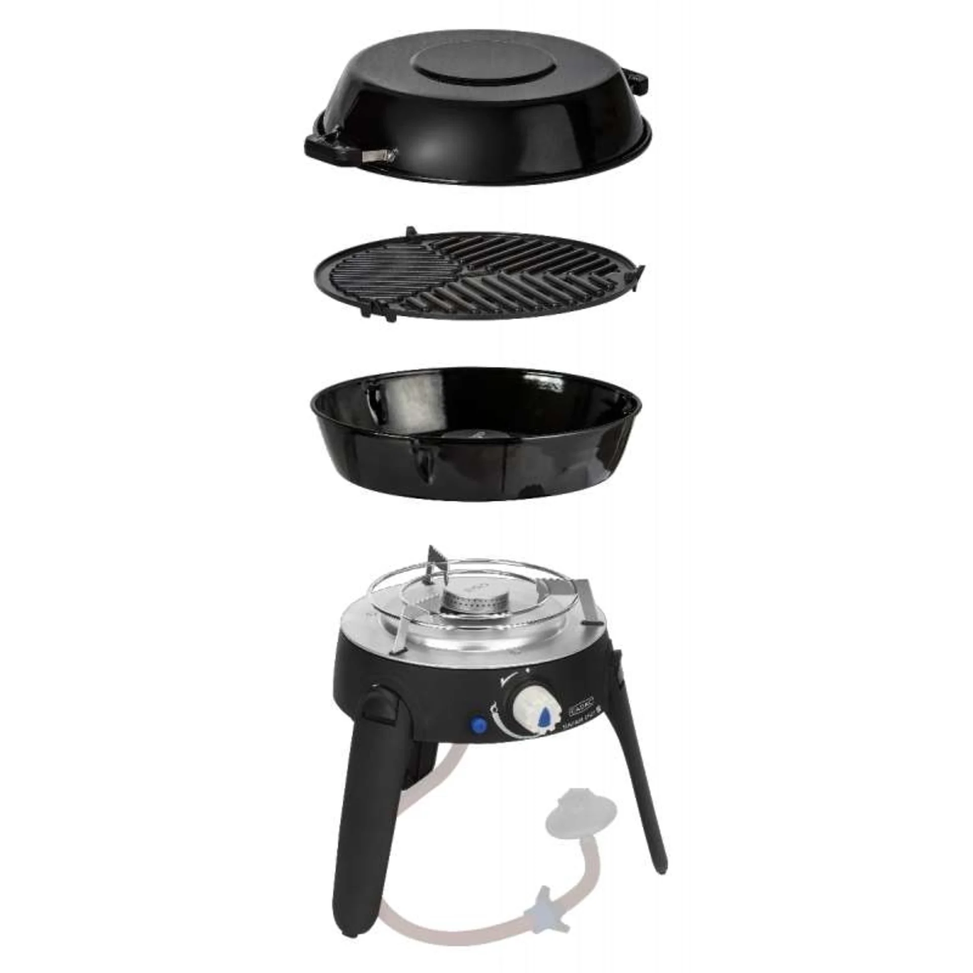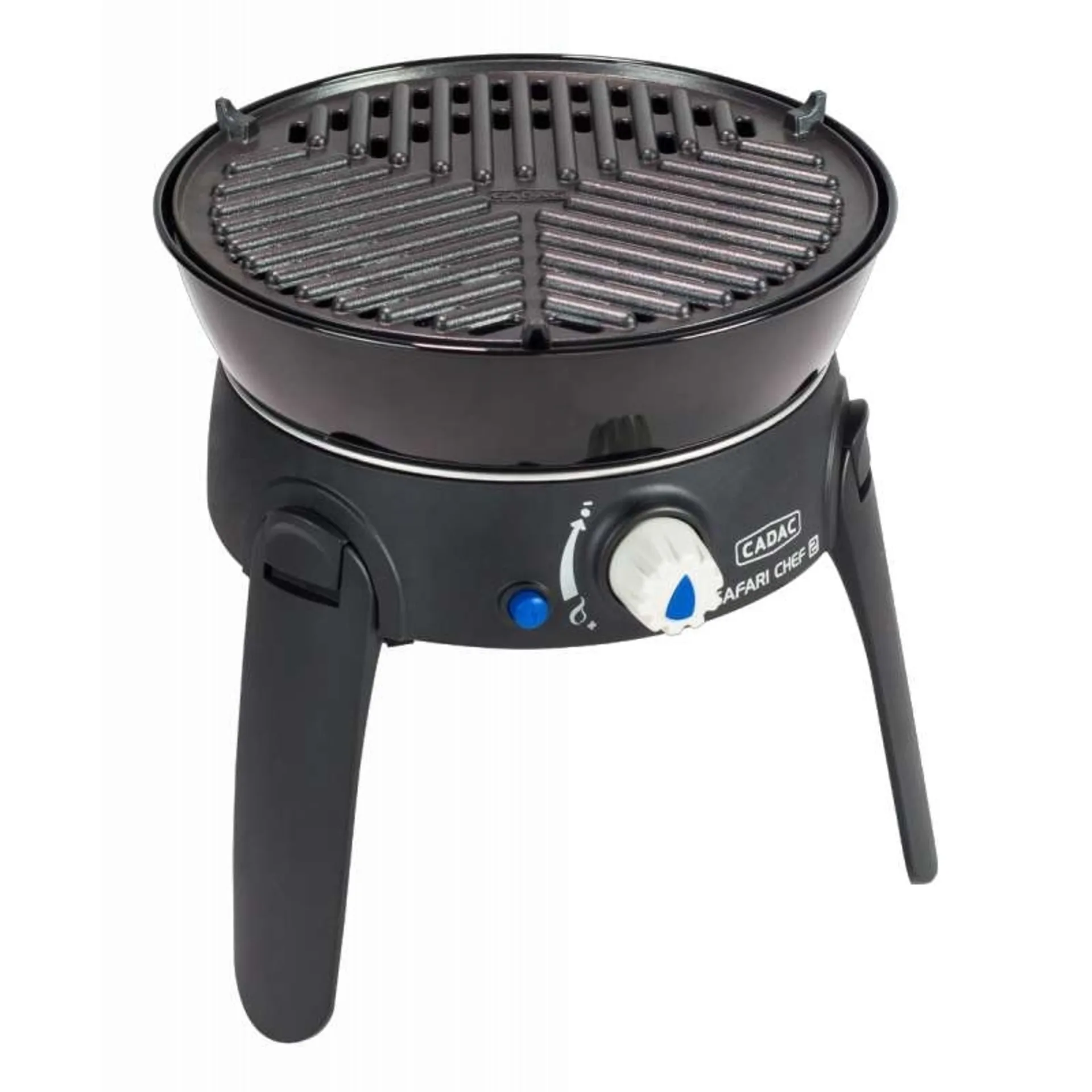 Le barbecue à gaz Cadac Safari Chef 2 BBQ est le compact tout-en-un. Que tu veuilles cuisiner, griller, cuire au four ou utiliser un wok. Grâce à ses pieds pliables et à son sac de transport, il est peu encombrant à ranger, même sur la route. Ce barbecue à gaz portable et polyvalent, qui pèse moins de 4 kg, comprend quatre surfaces de cuisson et de gril interchangeables : Support de casserole, grille de cuisson en céramique GreenGrill, plaque de cuisson et couvercle (convient aussi comme casserole). La variante basse pression (LP) peut être raccordée à une bouteille de gaz ordinaire (tuyau et détendeur non inclus).