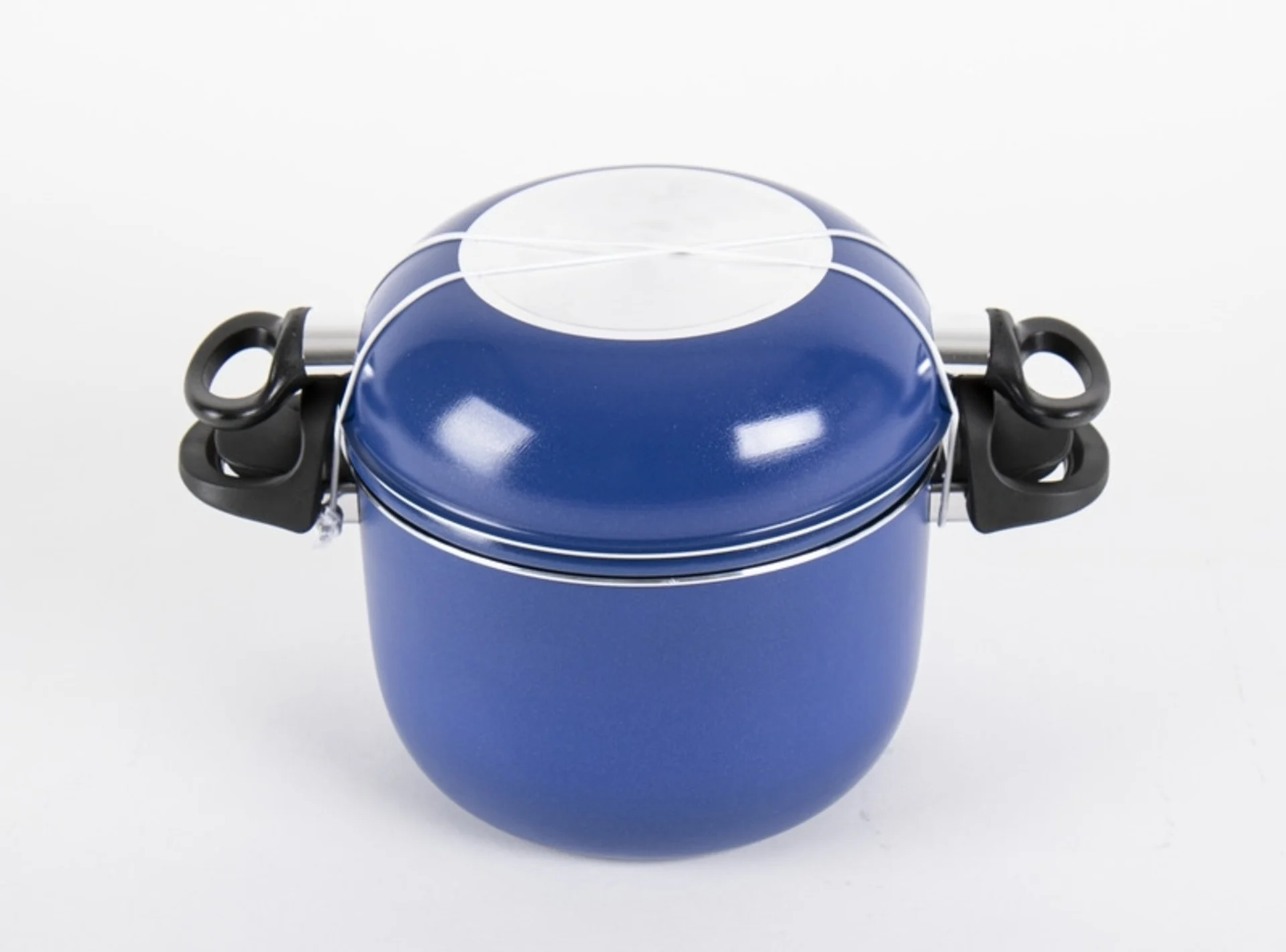 Set de casseroles en bleu roi, avec revêtement antiadhésif et poignées isolées en plastique noir. En aluminium léger. Les poignées de la grande casserole sont rabattables pour maintenir le couvercle à tamis lors de l'arrosage.
