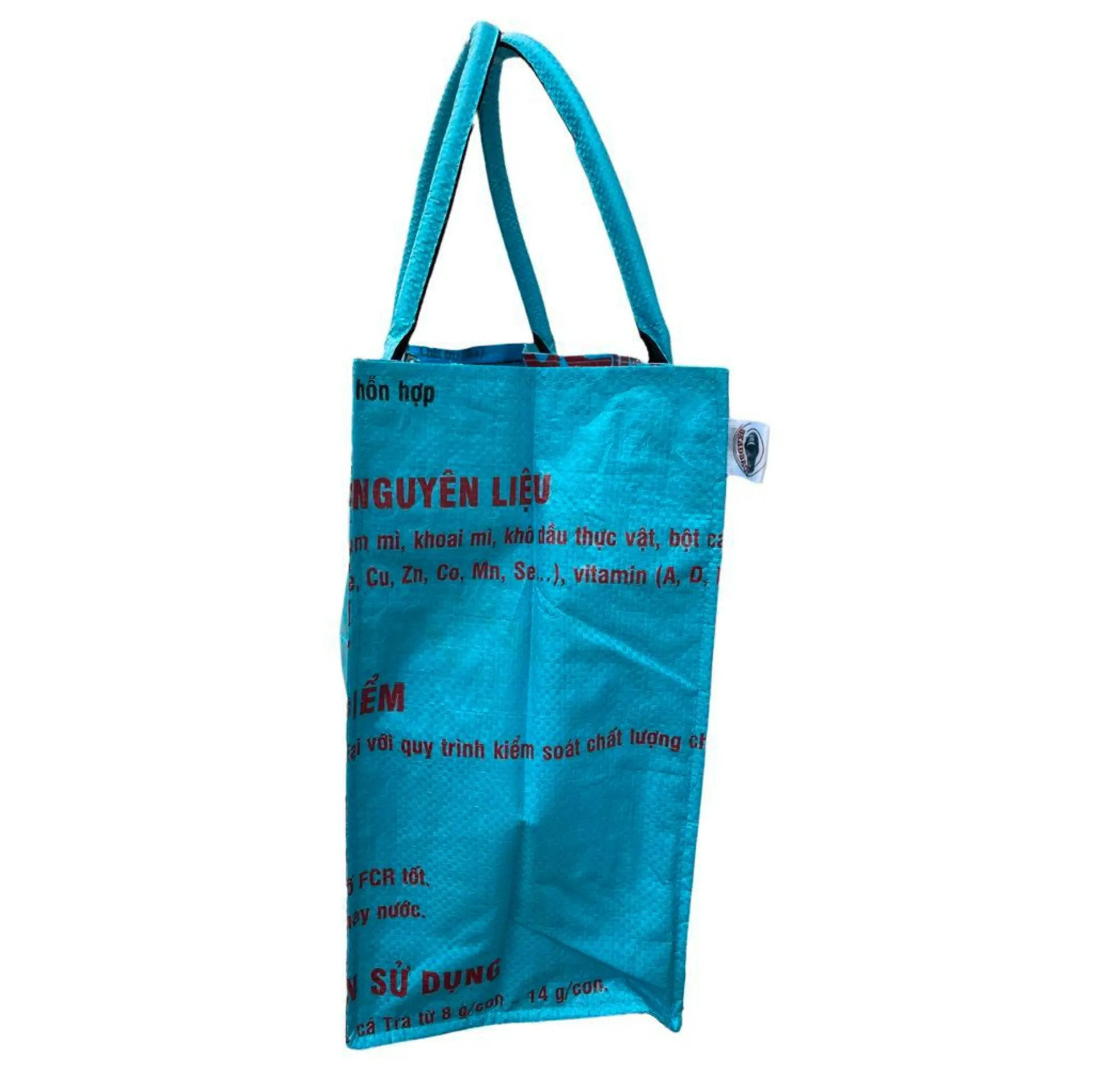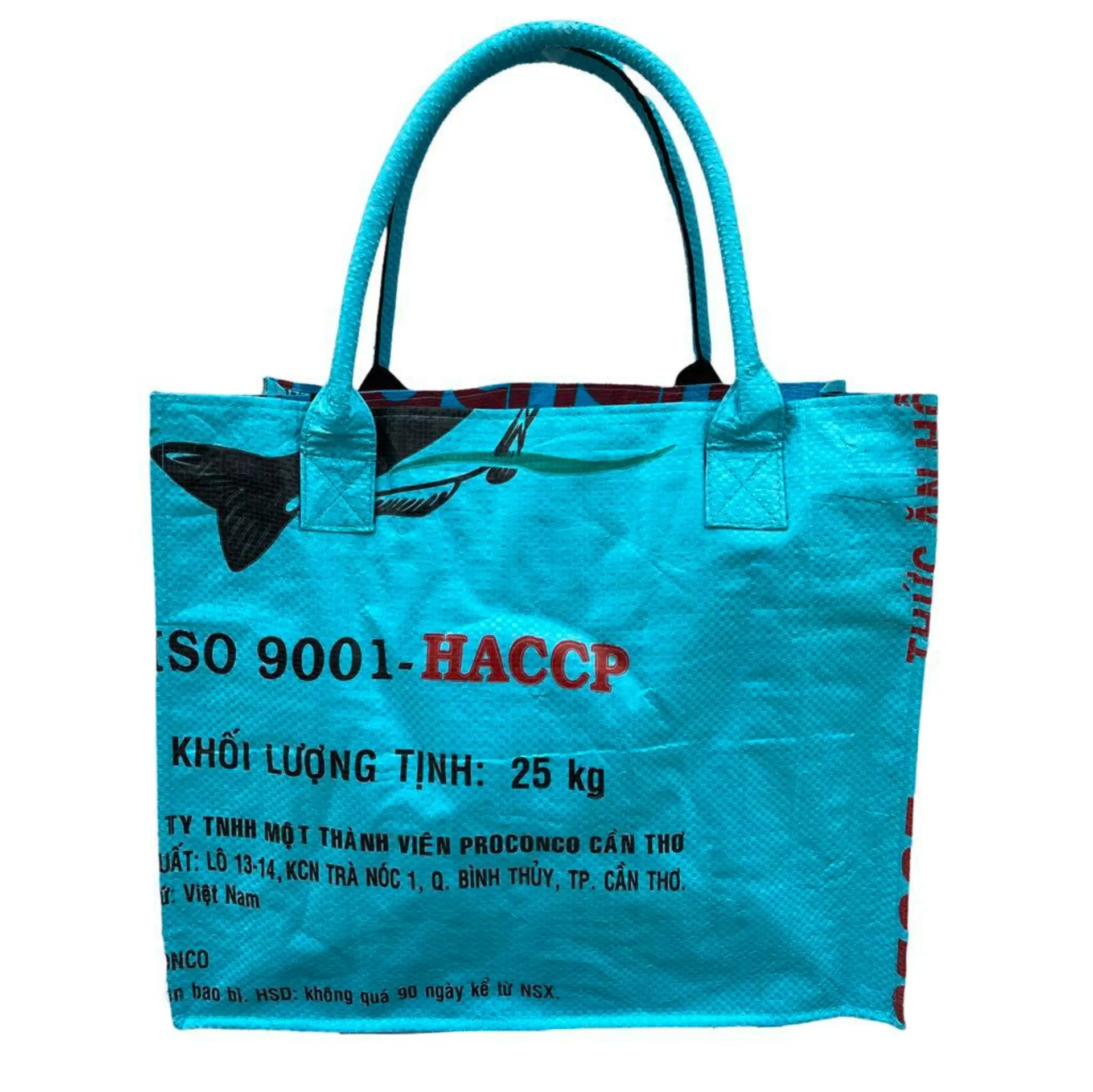 Trendige Shopper aus recyceltem Fischfutter- bzw. Reissack. Eine robuste Tasche nicht nur für den Einkauf, die man einfach wieder zusammenfalten kann. Handmade von Landminenopfern und körperlich behinderten Fachkräften. Produktion zertifiziert durch die World Fair Trade Organisation. Fischfutter bzw. Reissack ist wasserabweisend, reißfest und haltbar. Hochwertige Verarbeitung mit Innenfütterung in Kontrastfarbe.