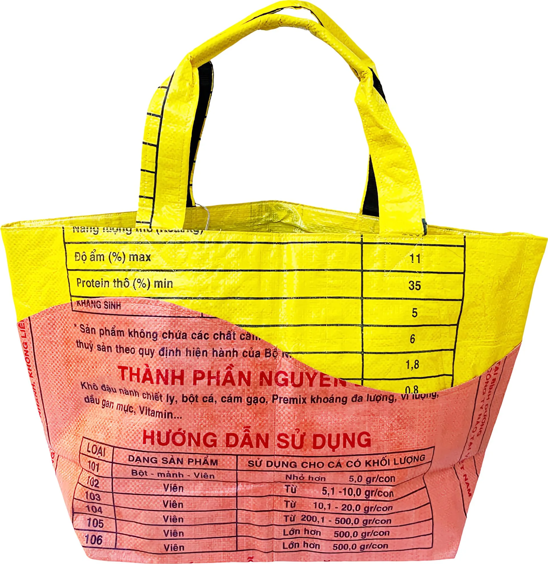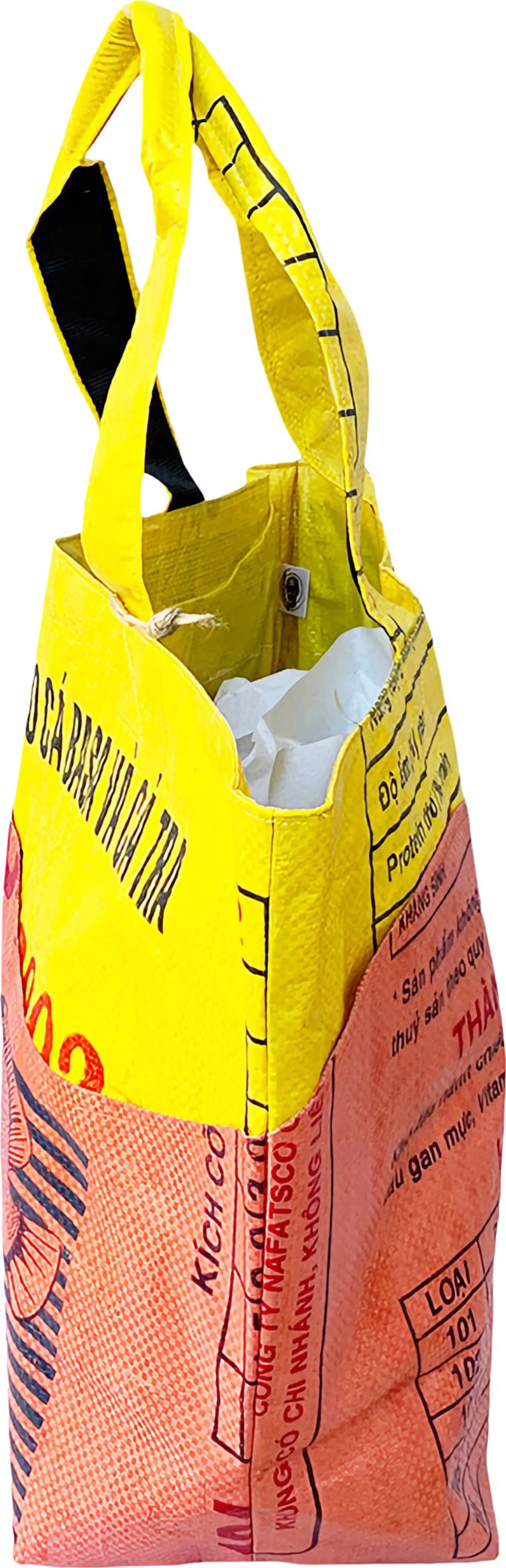 Die farbenfrohe Tasche hat kurze Henkel, wodurch man sie ganz easy an der Hand tragen kann! Zusätzlich ist sie aus 100 % recyceltem Reissackmaterial hergestellt. Pflegeleicht, robust und leicht. Außerdem lässt es sich schnell zusammenfalten, sodass die Tasche keinen Platz einnimmt und überall mit hingenommen werden kann.
