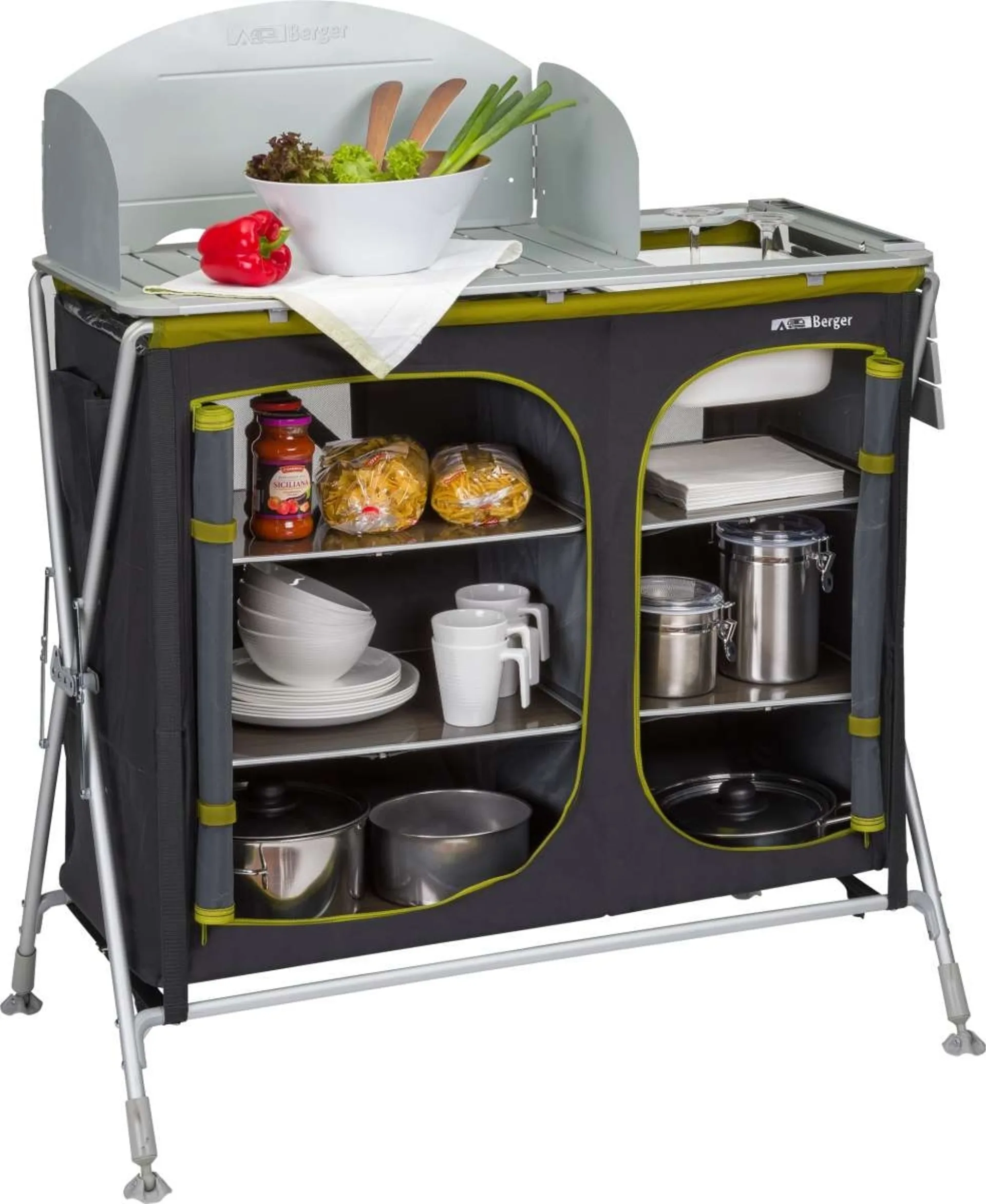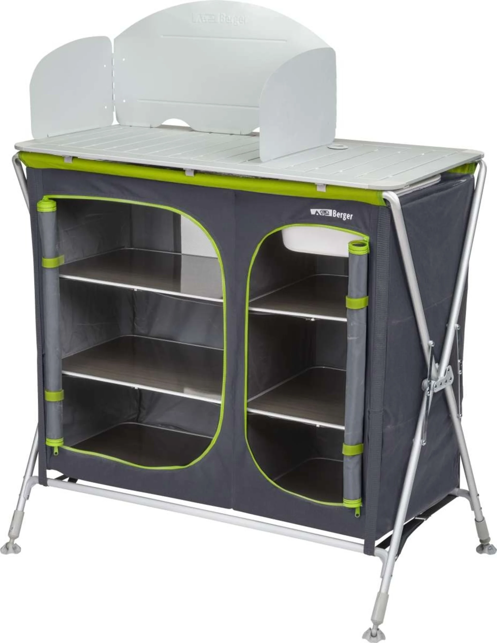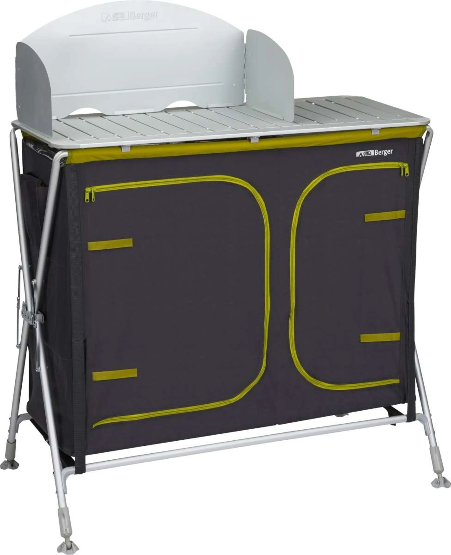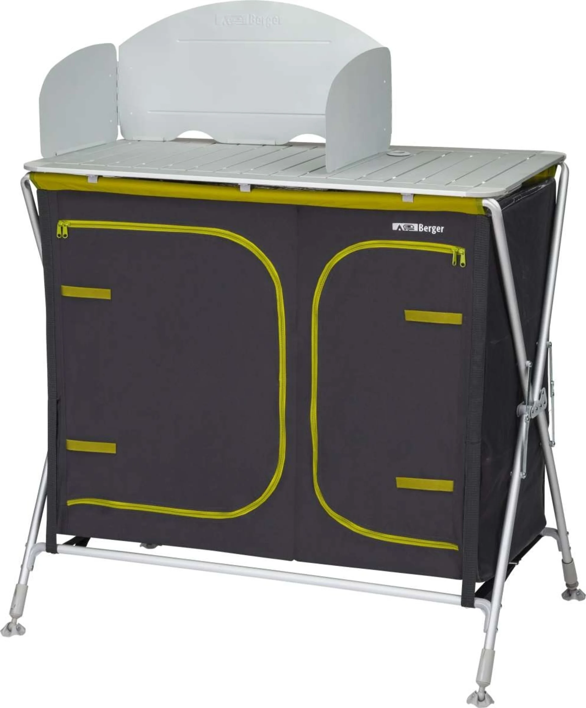 Grâce au pare-vent, la bouteille de gaz ne s'éteint pas même en cas de vent. Les compartiments de rangement variables offrent de la place pour les assiettes, les casseroles et la bouteille de gaz. De plus, il y a une ouverture pour le tuyau de gaz à l'arrière. Le plateau roulant en aluminium a un film de protection lavable.