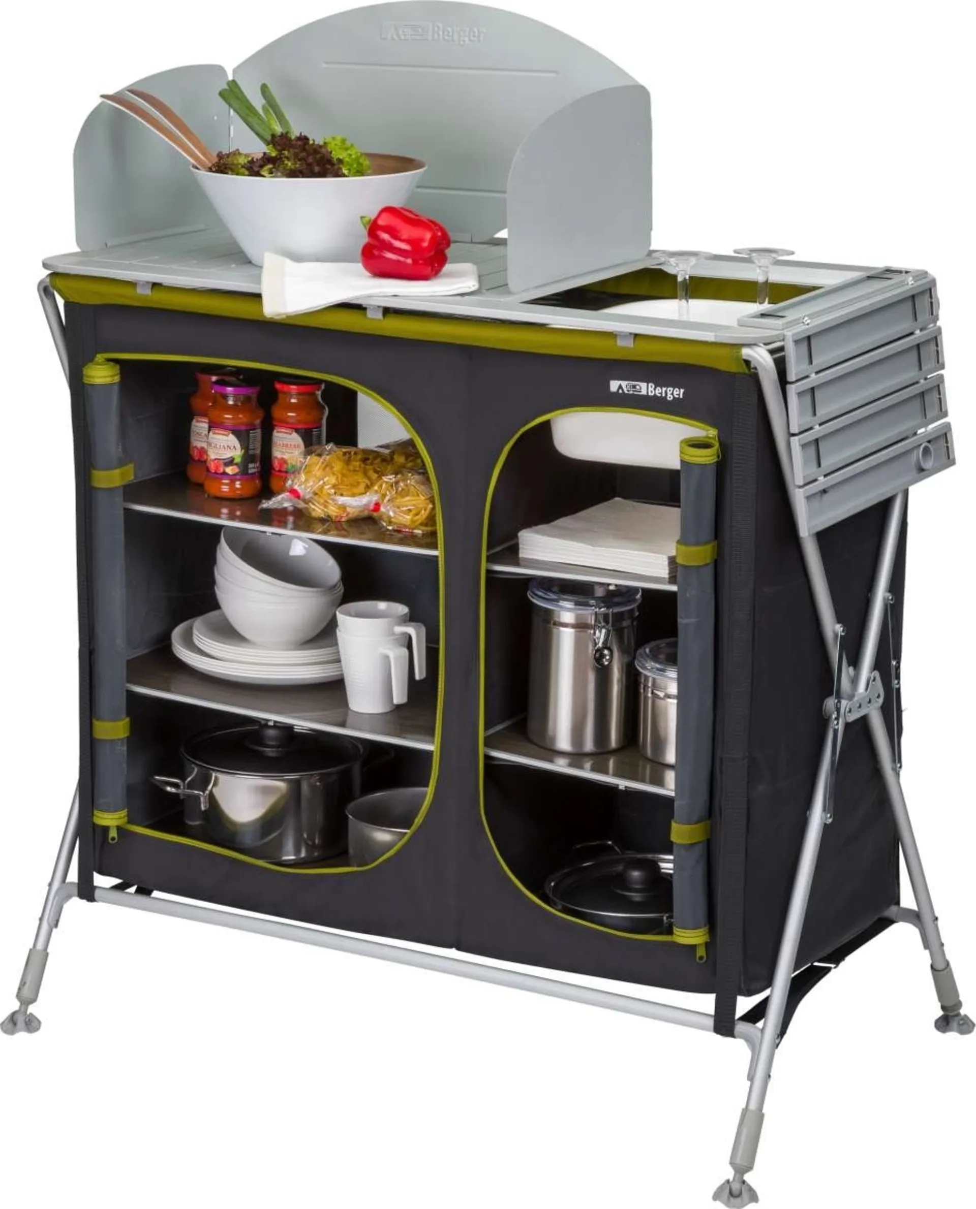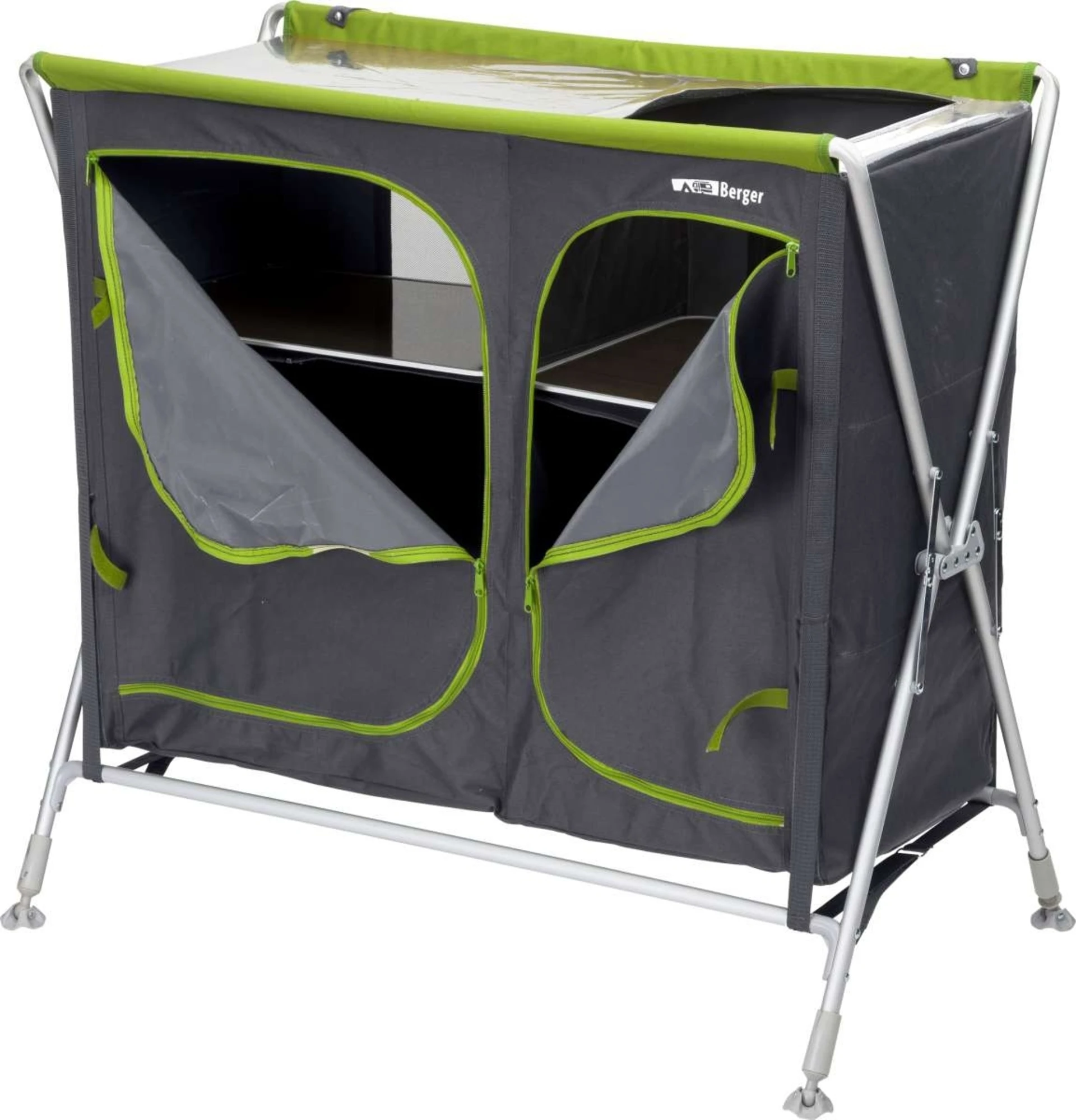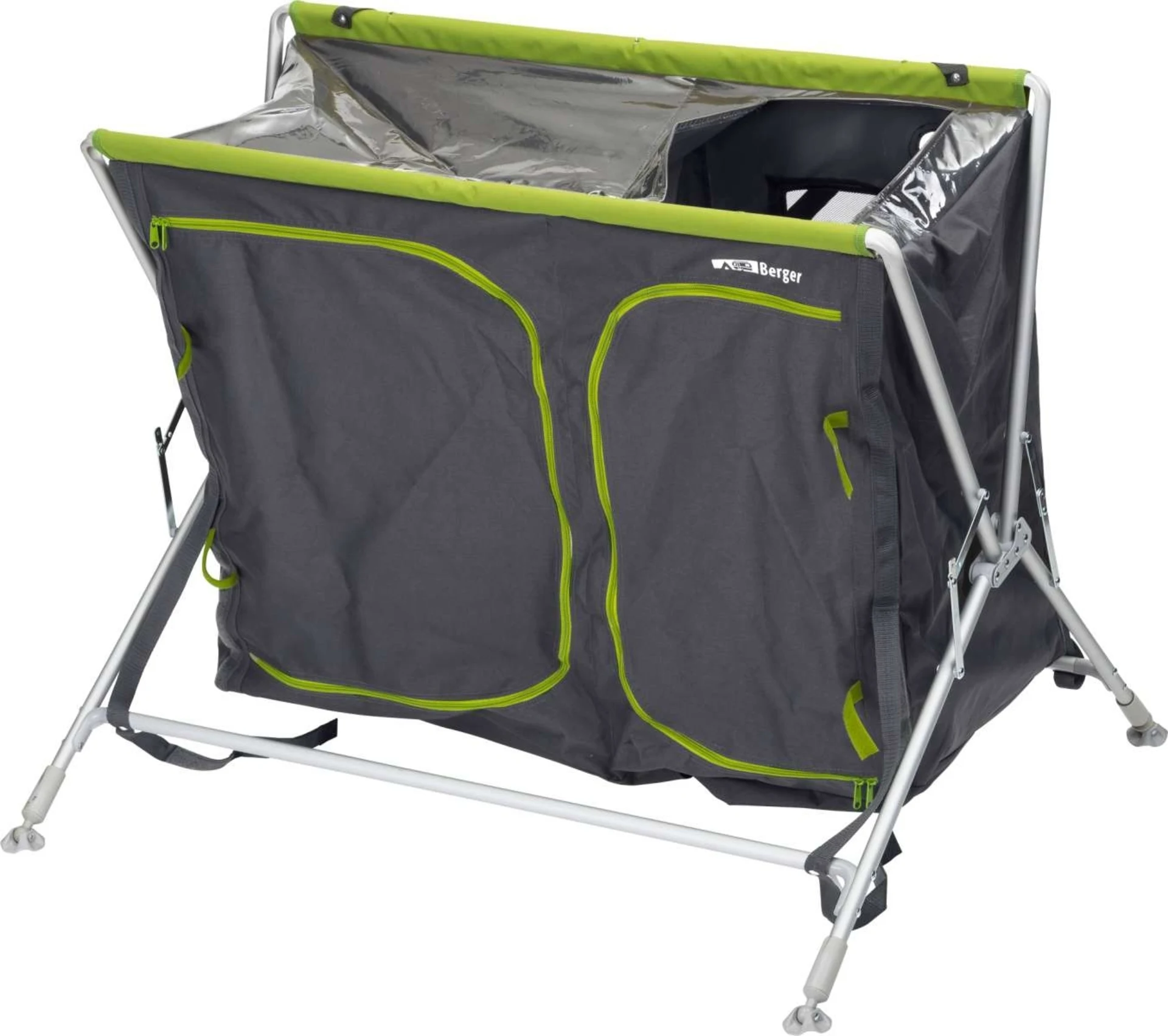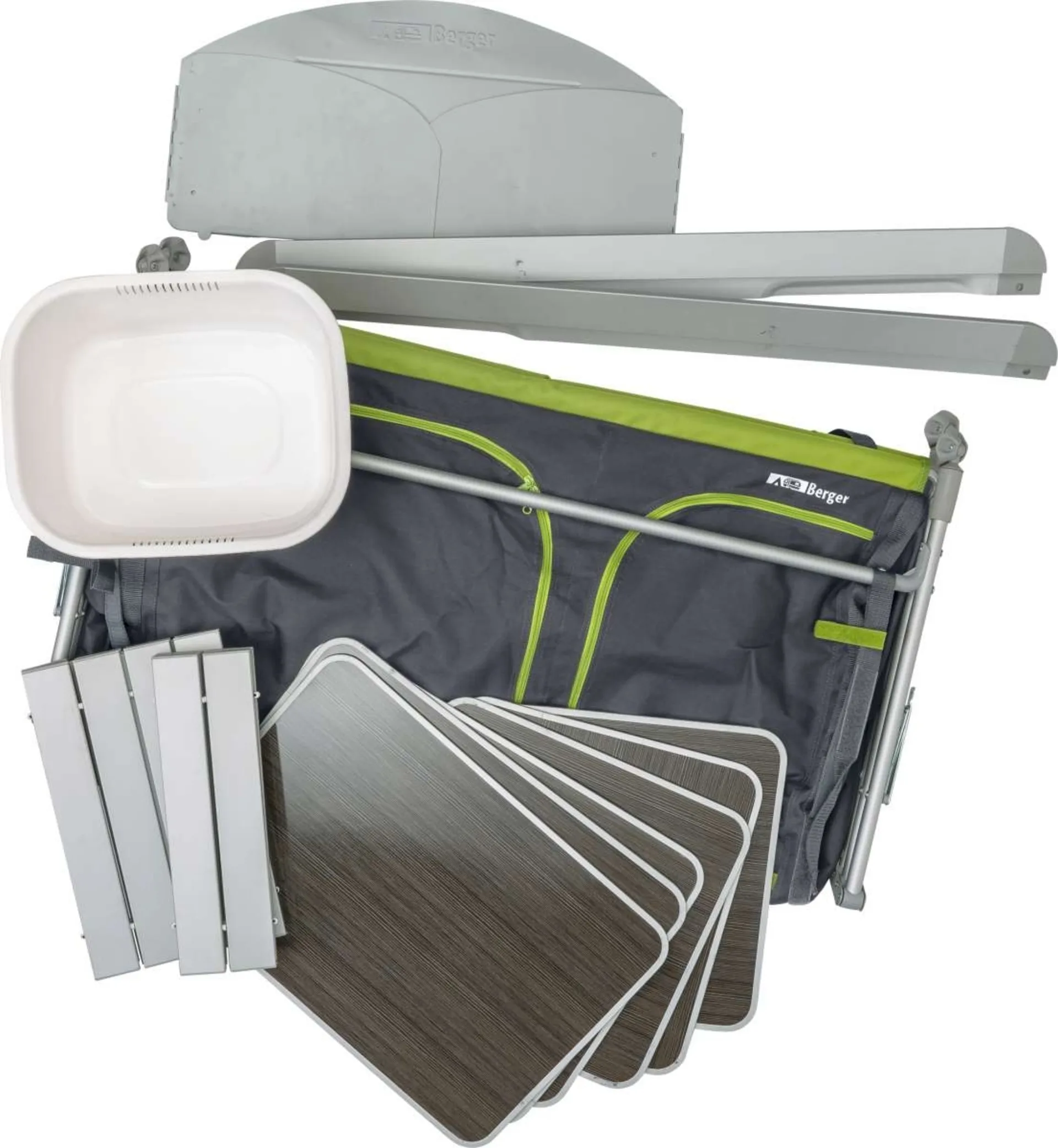 Grâce au pare-vent, la bouteille de gaz ne s'éteint pas même en cas de vent. Les compartiments de rangement variables offrent de la place pour les assiettes, les casseroles et la bouteille de gaz. De plus, il y a une ouverture pour le tuyau de gaz à l'arrière. Le plateau roulant en aluminium a un film de protection lavable.