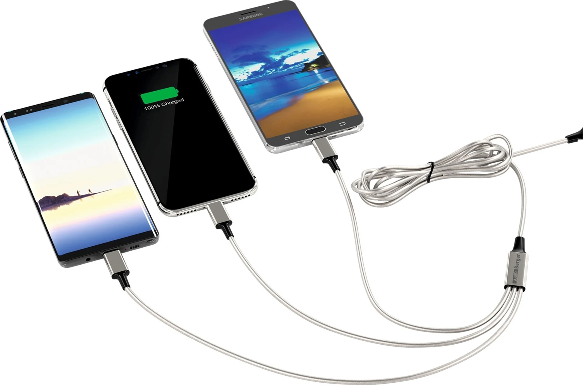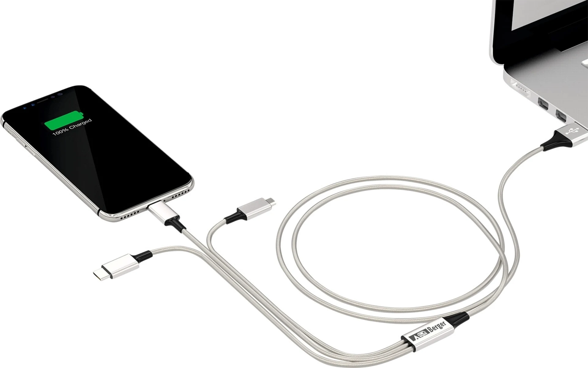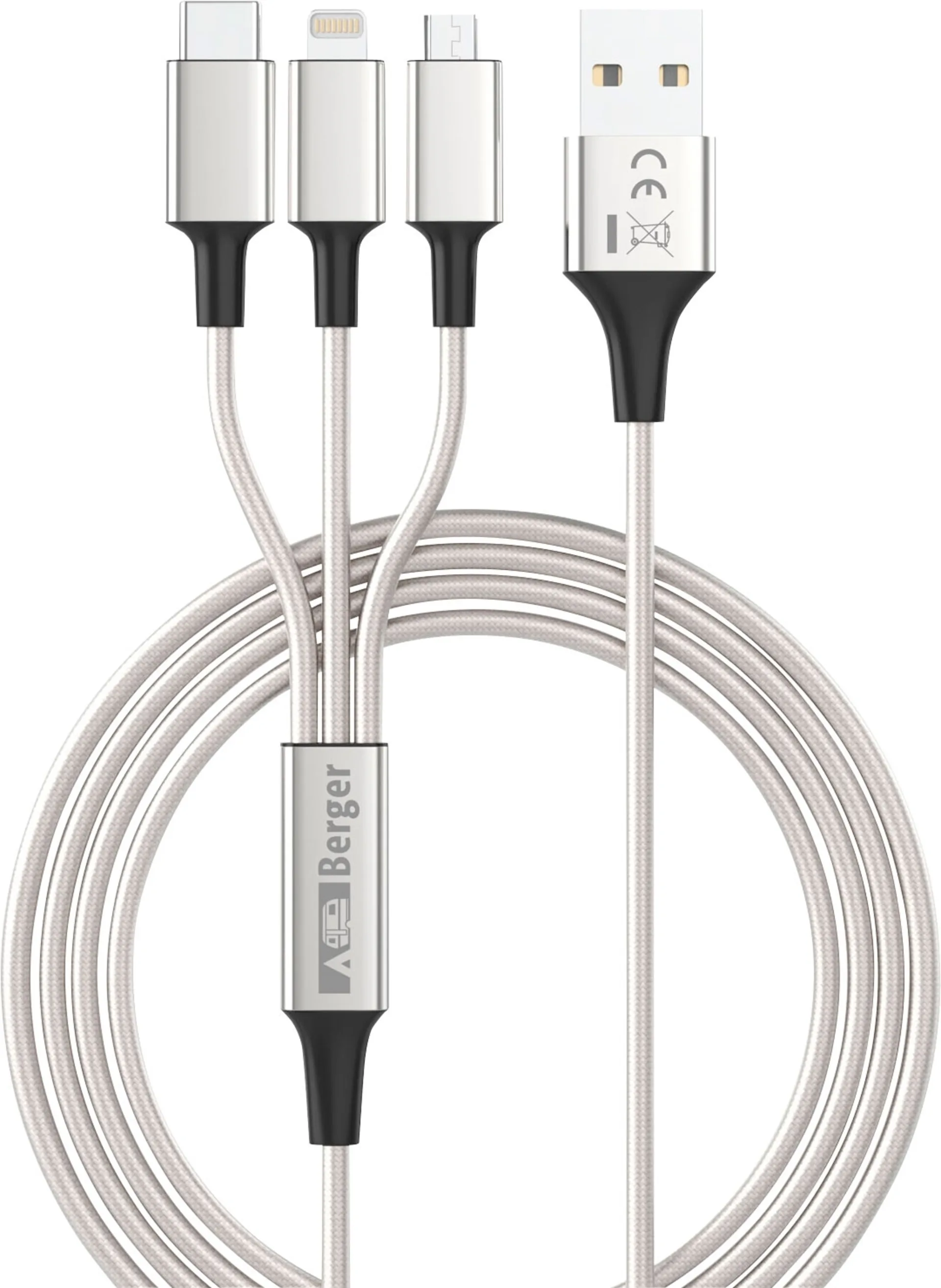 Avec le câble USB Berger 3 en 1, tu n'as besoin que d'un seul câble de charge pour tes besoins de charge quotidiens et tu peux charger 3 appareils différents en même temps. Un seul appareil peut être chargé avec un courant de charge de 3A. Si 3 appareils sont connectés en même temps, le courant de charge est de 1,5A par connexion.