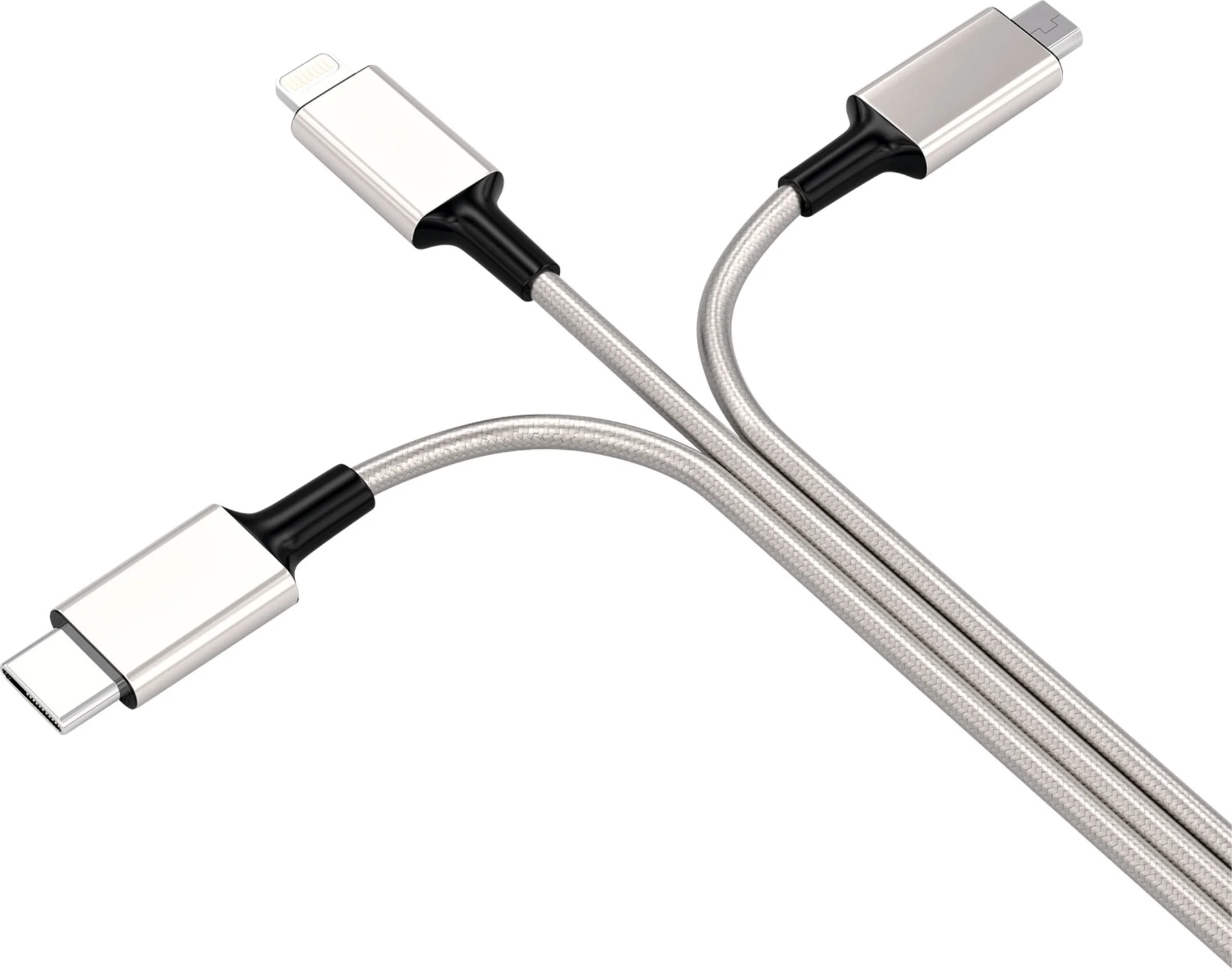 Un câble - trois connecteurs - Micro-USB, Lightning et USB type C.