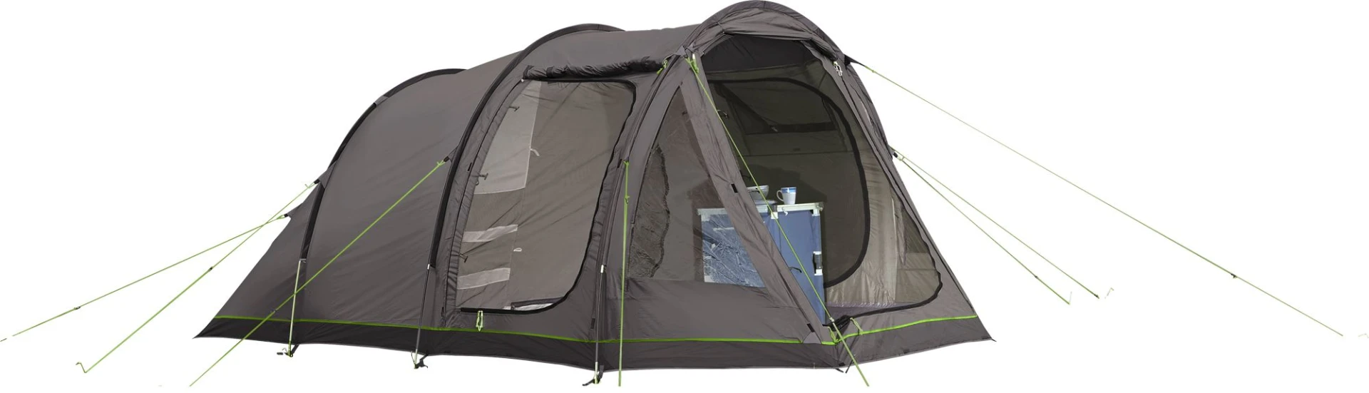 Das Berger Campo 4 Tunnelzelt bietet durchdachte Funktionen für Campingfreunde und Familien. Drei doppelte Eingänge mit Moskitogaze-Türen lassen sich als Sonnendach ausstellen und sorgen für eine flexible Nutzung. Die gegenüberliegenden Seiteneingänge sind mit zusätzlichen, verschließbaren Lüftungsfenstern ausgestattet und gewährleisten eine optimale Belüftung.