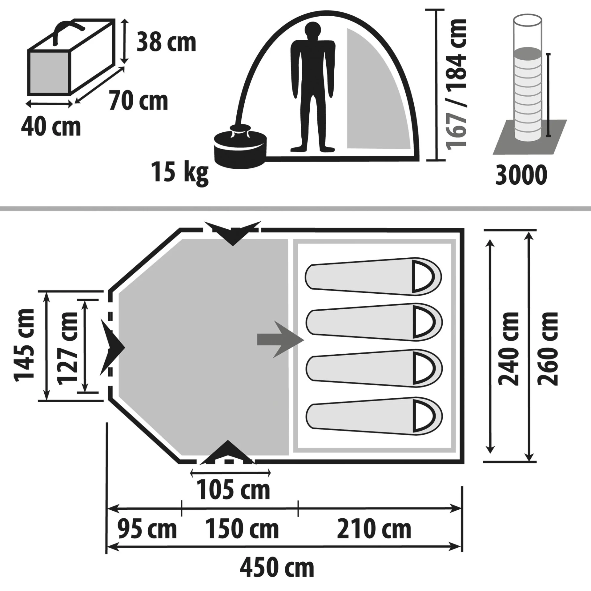 - Innenzelt: 100 % Polyester, atmungsaktiv