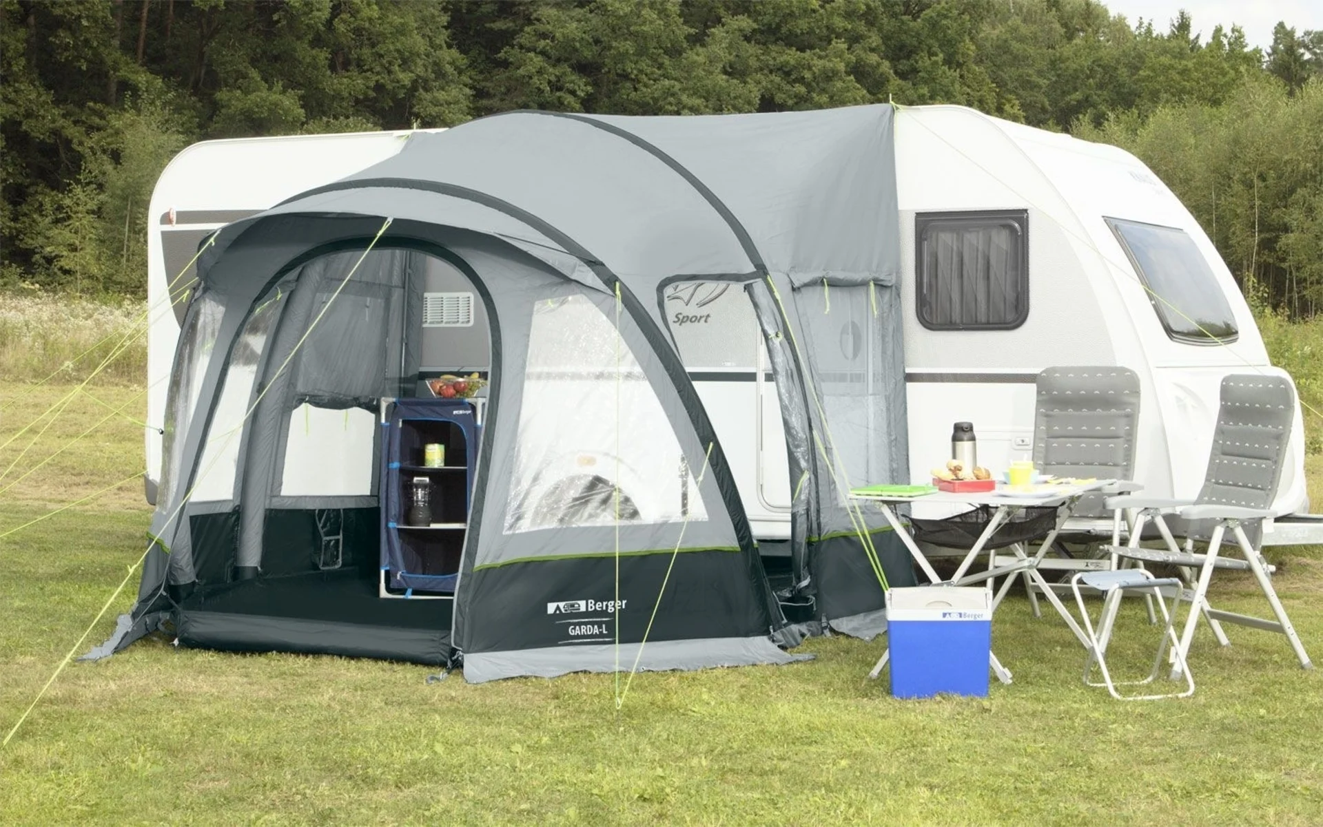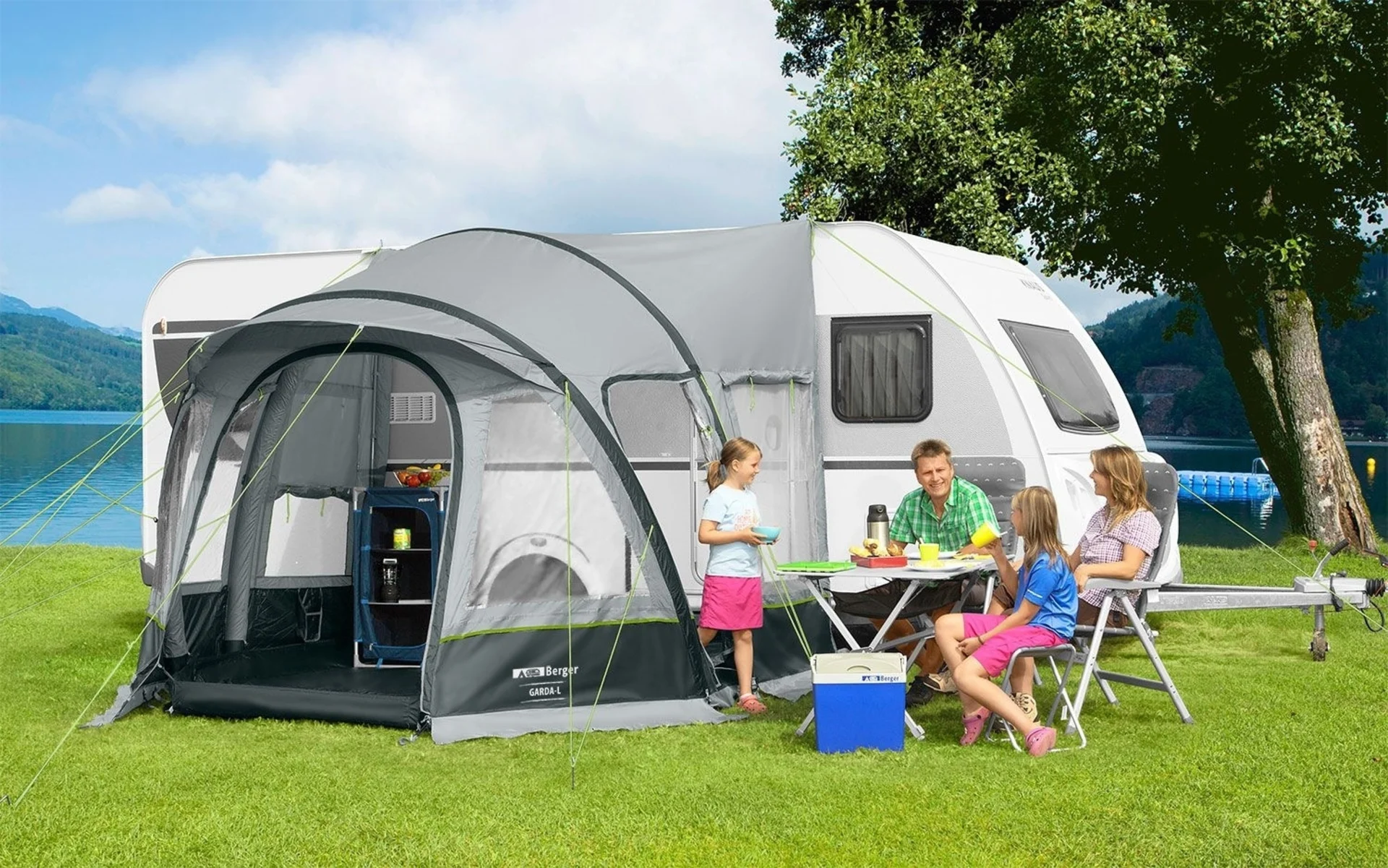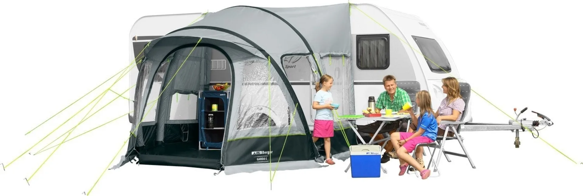 L'auvent partiel de caravane Garda Air garantit une détente rapide et une flexibilité maximale sur le lieu de vacances ! Grâce à l'armature gonflable et à l'insertion dans le rail de jonc, il est facile et rapide à monter. Le Garda Air offre un espace de vie lumineux et confortable, dans lequel il est agréable de rester même par mauvais temps. Les grandes fenêtres panoramiques, qui peuvent également être fermées de l'intérieur, te permettent de garder un œil sur les environs. L'auvent de l'entrée principale offre une protection supplémentaire contre la pluie. Pour une bonne aération, il y a des aérations permanentes sur la paroi avant, ainsi que des gaze moustiquaires sur la porte avant et les fenêtres latérales. De plus, l'auvent partiel dispose d'une entrée latérale supplémentaire sur le côté droit. La hauteur de la tente est de 243 cm.