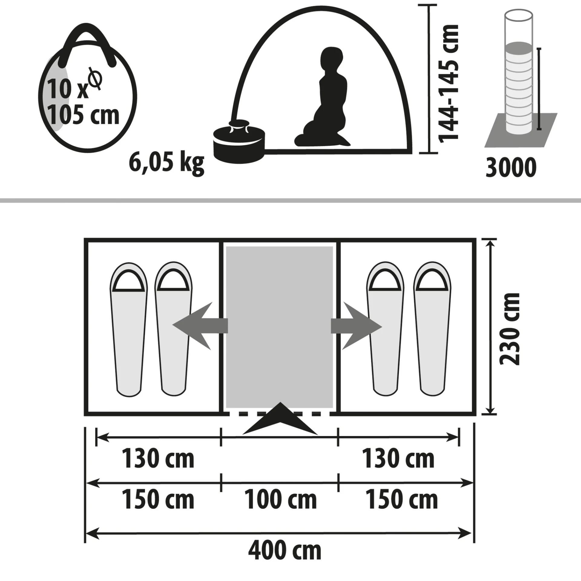 | Hauteur de la tente | 144 - 145 cm |