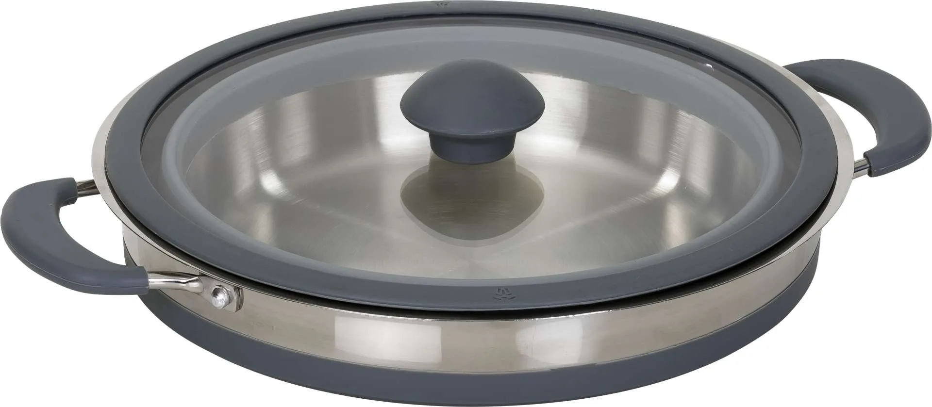 Mélange astucieux de matériaux en silicone et en acier inoxydable. Tu peux ainsi cuisiner ton plat préféré même en déplacement. Convient aux aliments et au lave-vaisselle. Hauteur pliée : seulement 6 cm avec le couvercle.