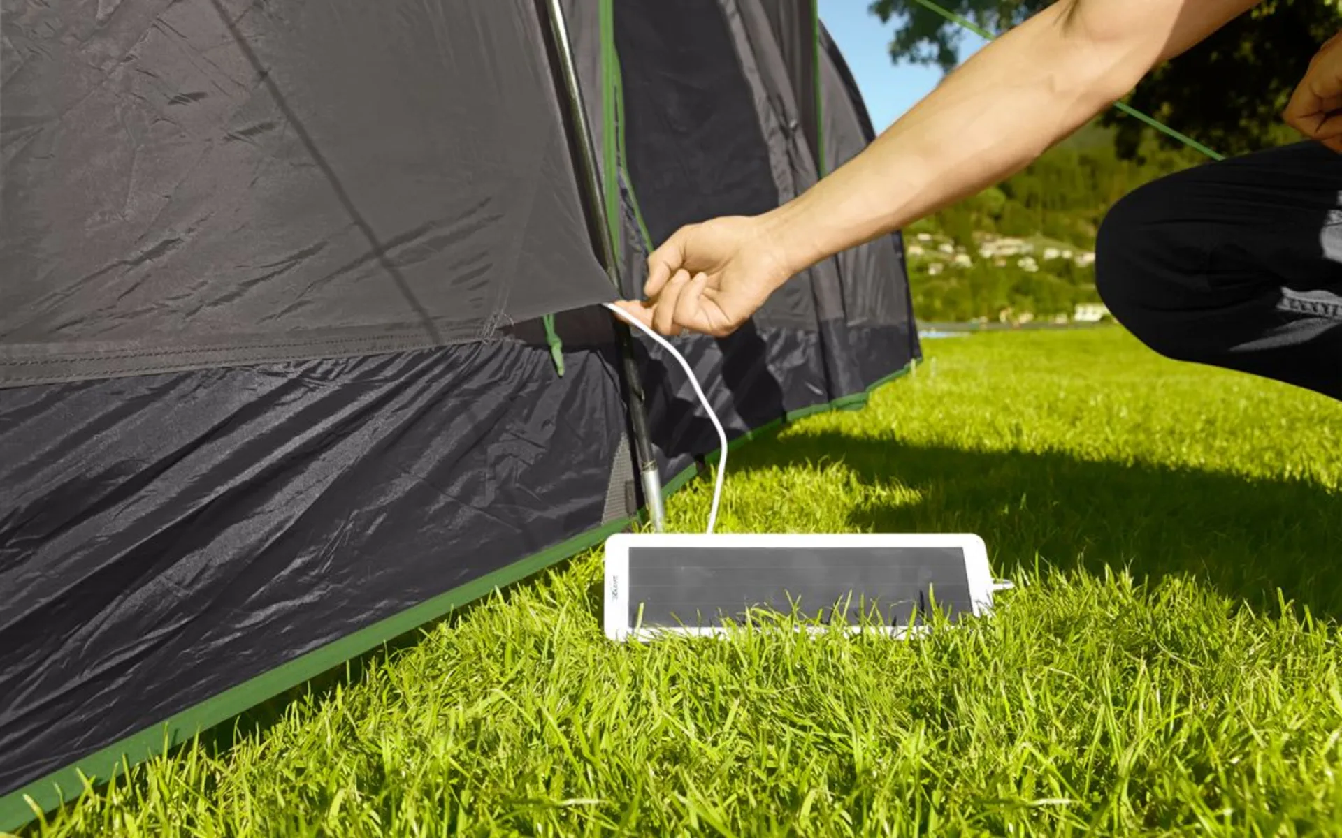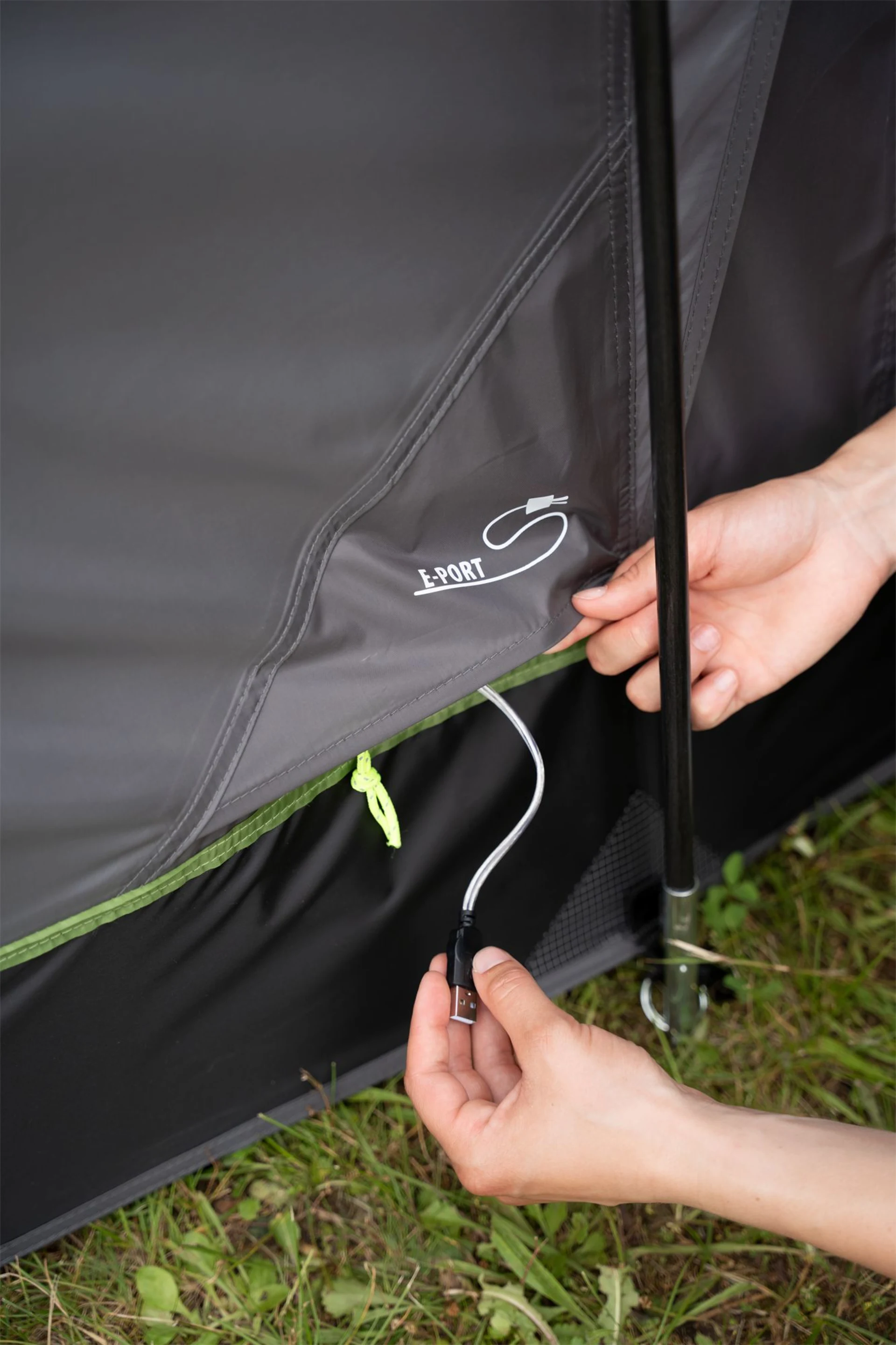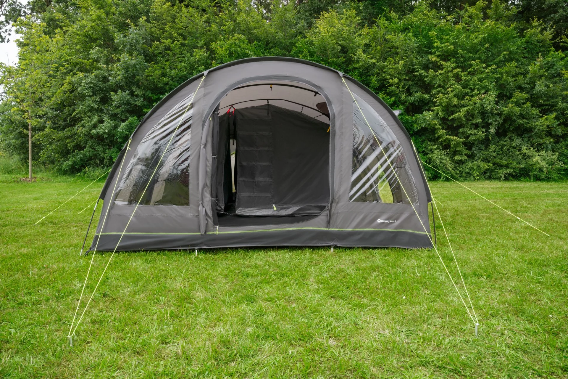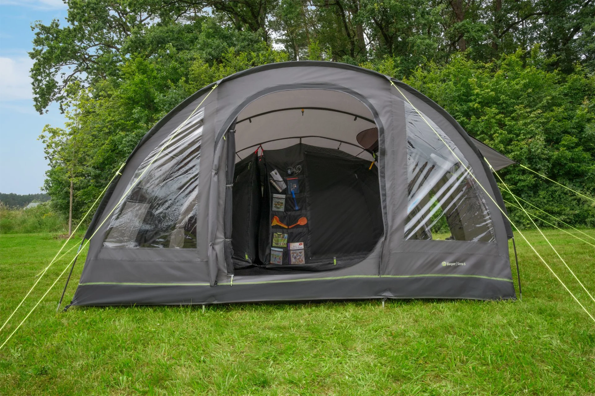 Das großzügige Familienzelt bietet mit einem Wohn- und Vorraum von ca. 10 m² viel Platz für gemeinsame Aktivitäten und Stauraum. Der regengeschützte Eingang auf der rechten Seite sorgt für trockenen Zugang, während der linke Eingang mit einem verschließbaren Fenster ausgestattet ist und sich als Sonnendach ausstellen lässt. Alle Fenster sind blickdicht verschließbar und bieten Privatsphäre nach Bedarf.