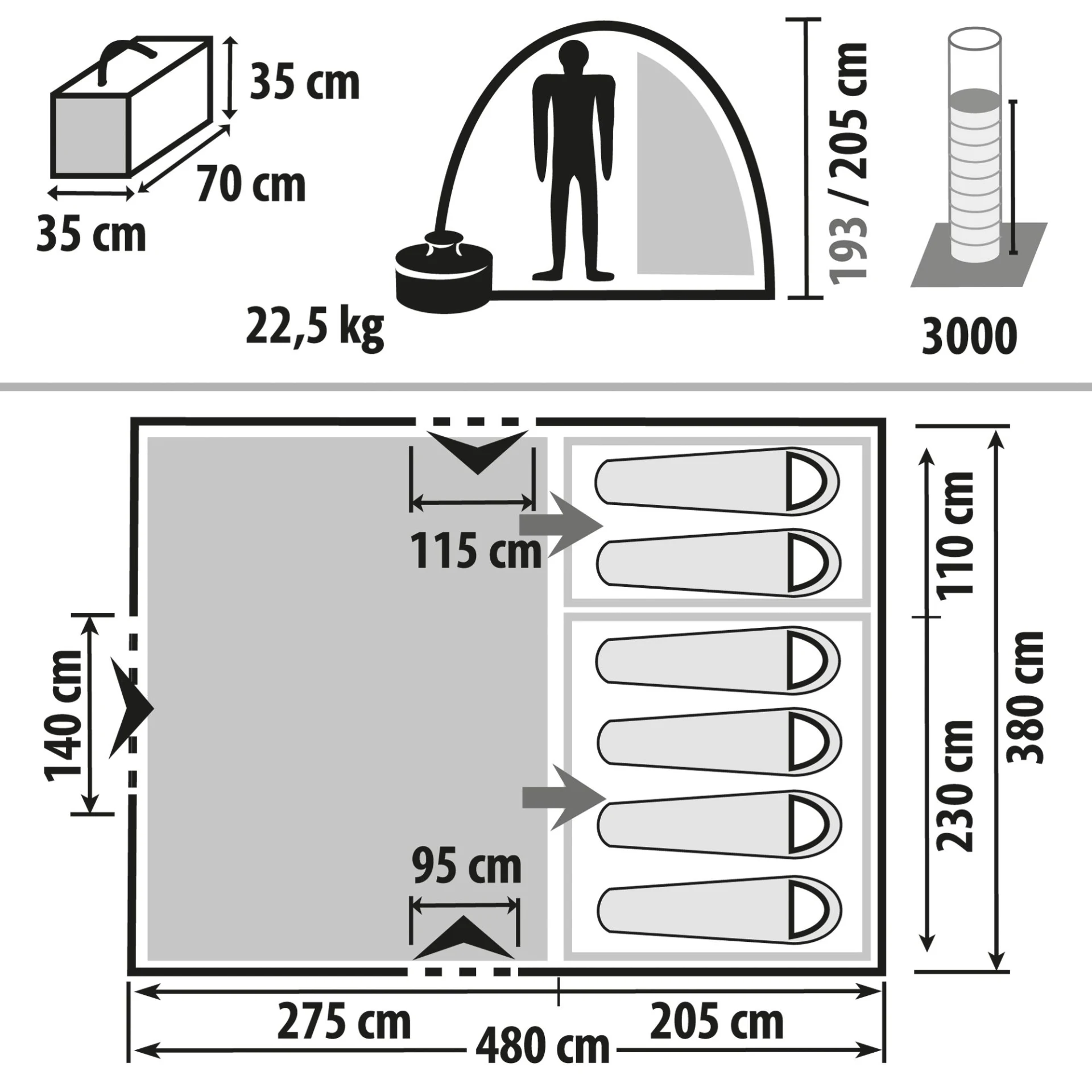 Zwei einhängbare Schlafkabinen mit Moskitogaze-Türen sorgen für erholsamen Schlaf und lassen sich von innen blickdicht verschließen. Organizer an den Schlafkabinen bieten praktischen Stauraum für persönliche Gegenstände. Die fest eingenähte Bodenplane schützt zuverlässig vor Nässe und sorgt für zusätzlichen Komfort. Eine Zeltlampenaufhängung im Dachbereich ermöglicht eine einfache Beleuchtung.