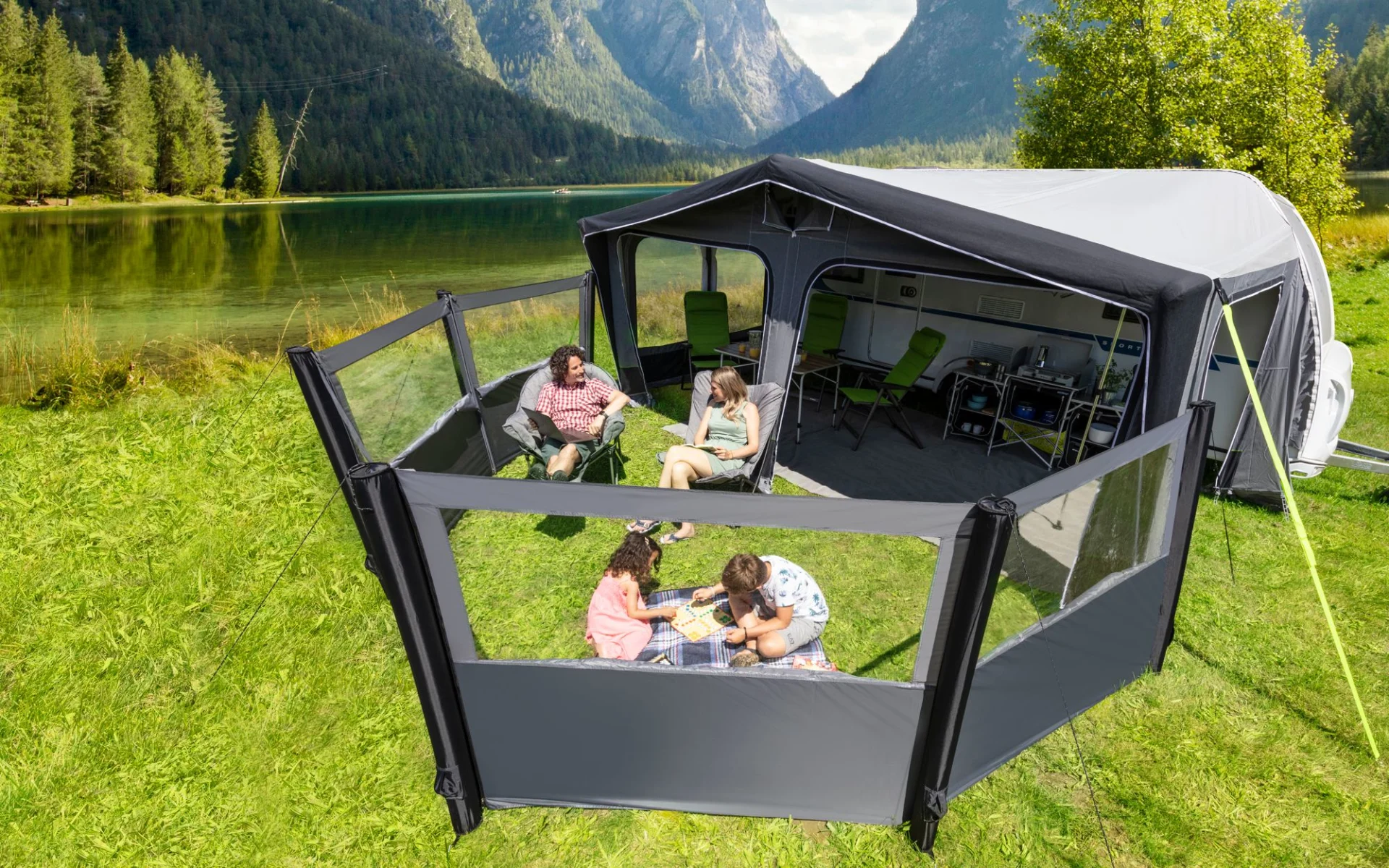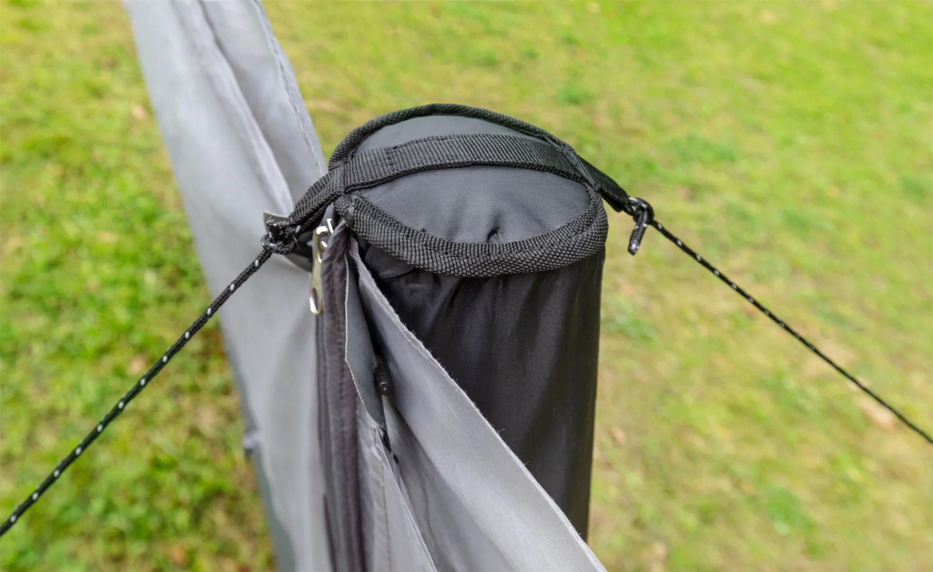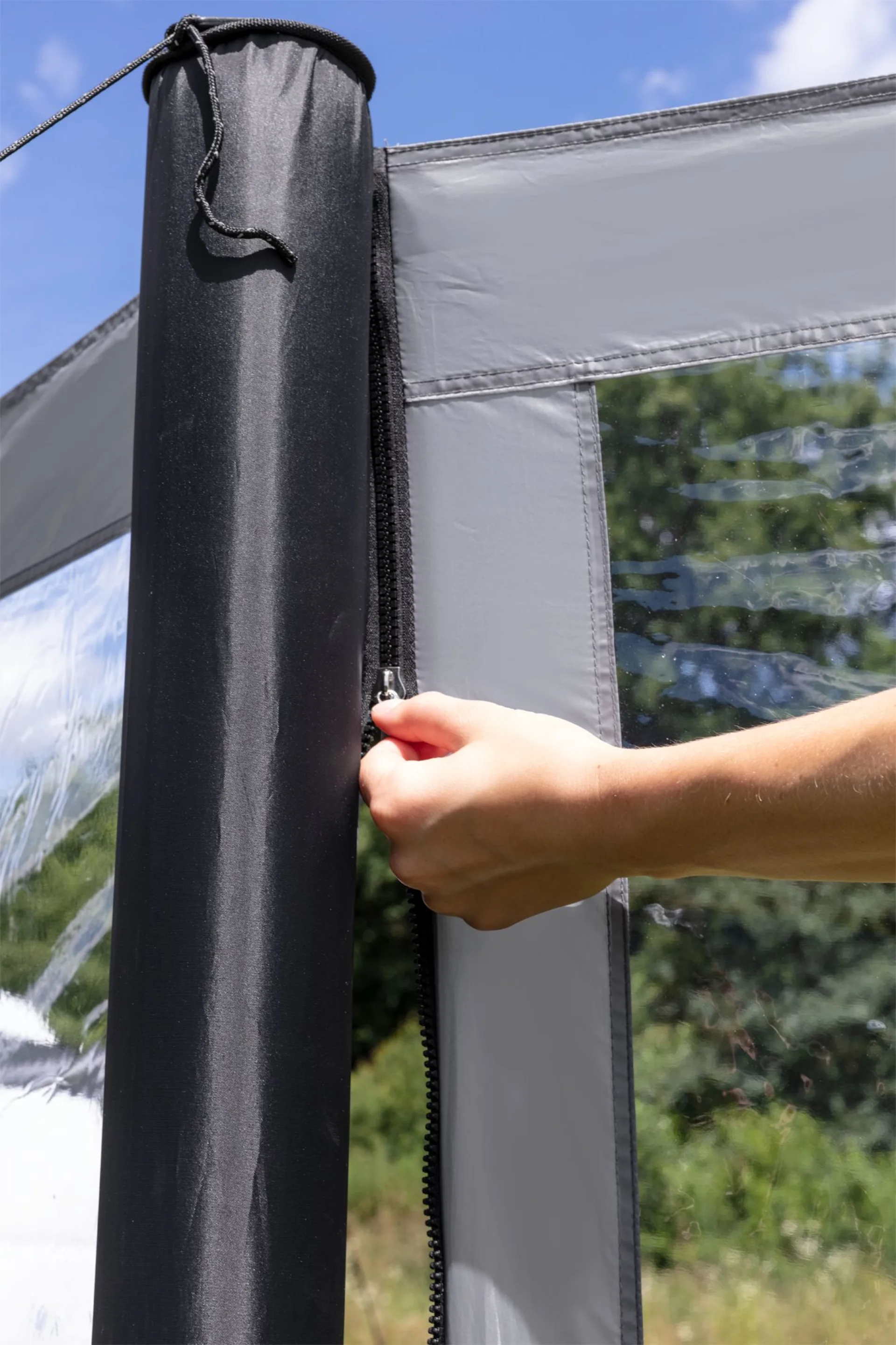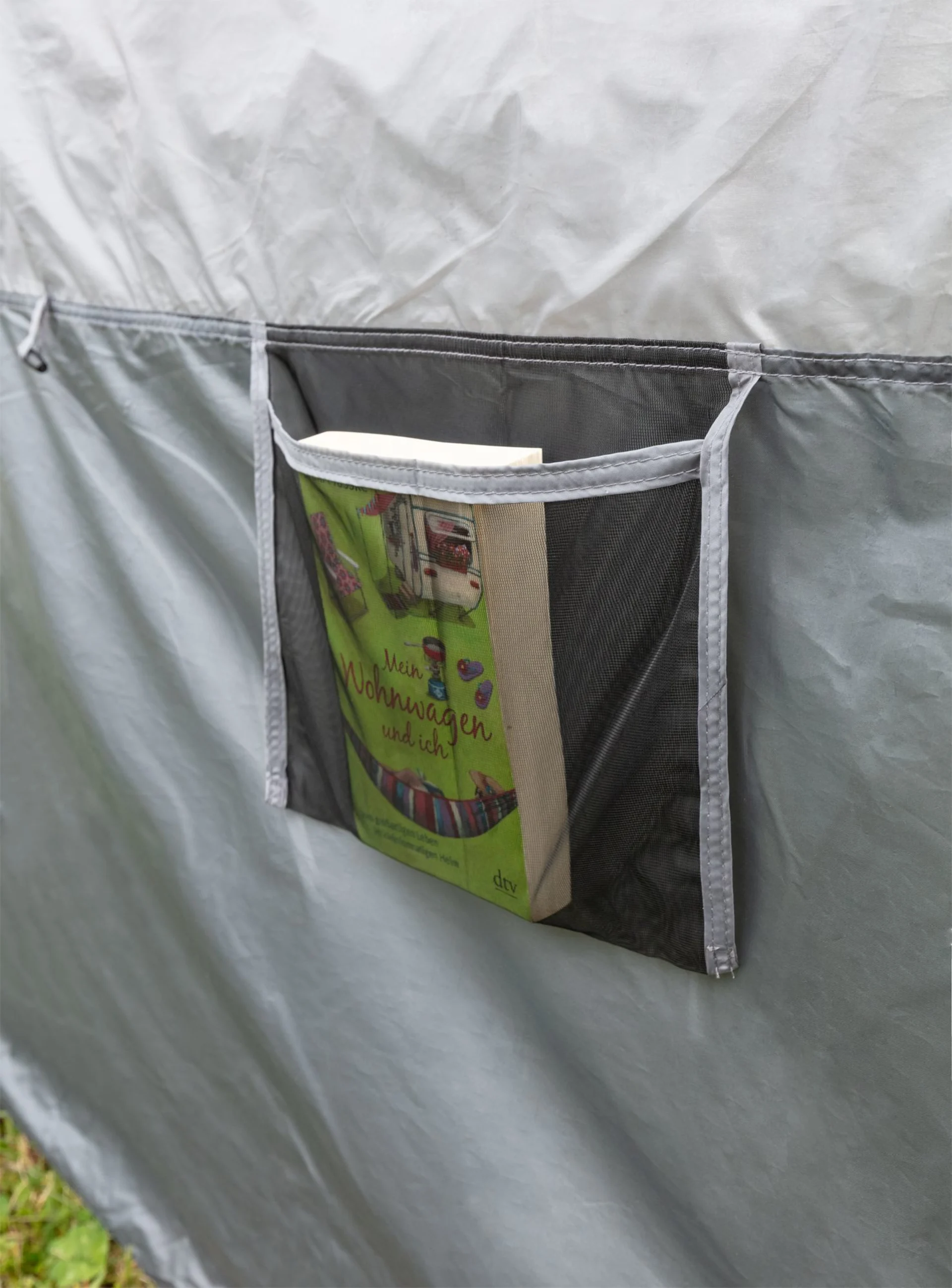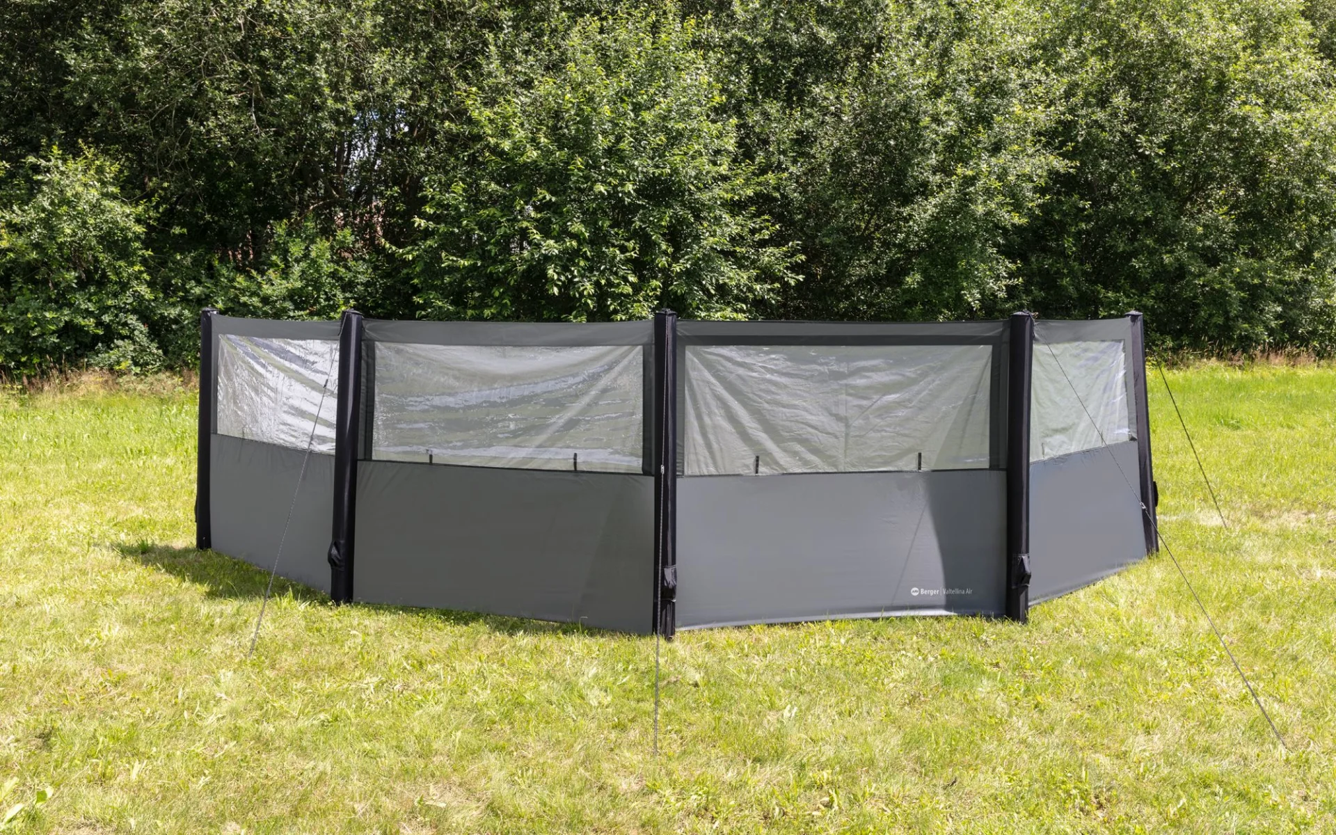 Le paravent modulaire Berger doté d'une technologie aérienne moderne peut être utilisé de différentes manières : que ce soit comme paravent pour une intimité absolue, comme paravent pour encore plus de confort, comme limite pour les animaux domestiques et les enfants ou comme protection pour les meubles contre les intempéries. Elle se compose de trois éléments de 160 x 140 cm chacun. Les fenêtres transparentes permettent d'avoir une vue optimale sur l'environnement. Pour encore plus d'intimité, elles peuvent être fermées de l'intérieur de manière opaque grâce à un couvercle de fenêtre en option. L'organisateur intégré est idéal pour ranger les petits ustensiles et permet un accès rapide. Des cordes de haubanage des deux côtés, ainsi que des piquets supplémentaires pour fixer les fermetures éclair, assurent une grande stabilité.