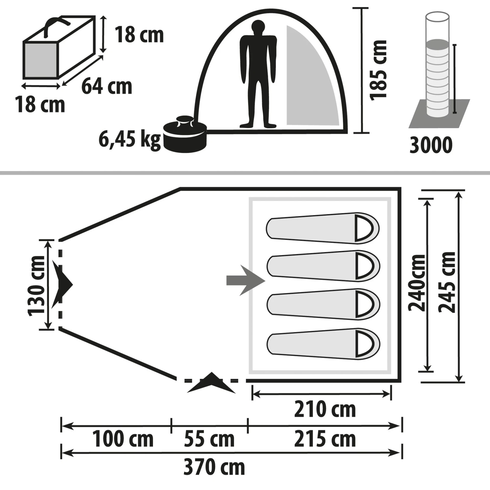 - Außenzelt: Polyester, PU-beschichtet