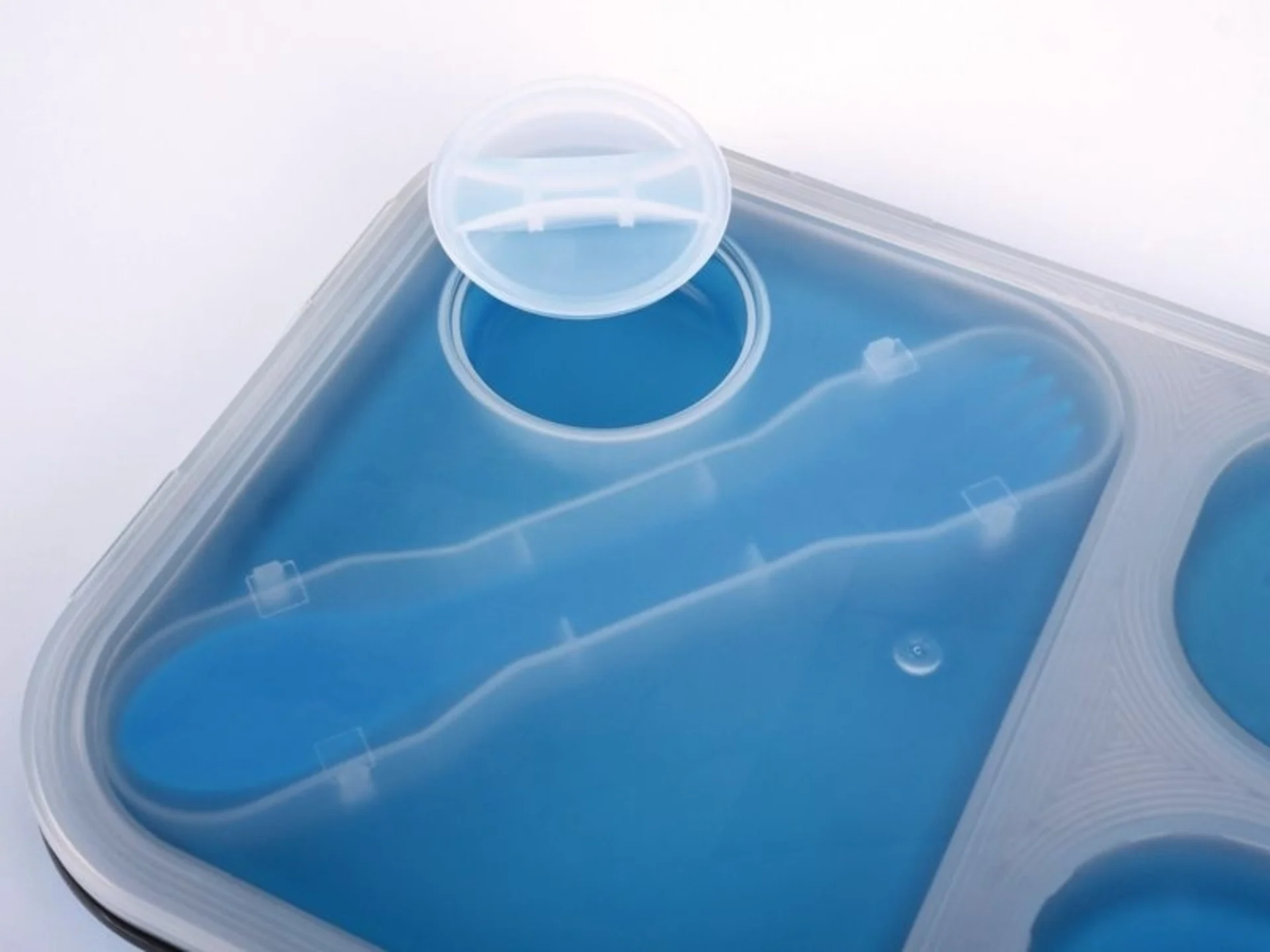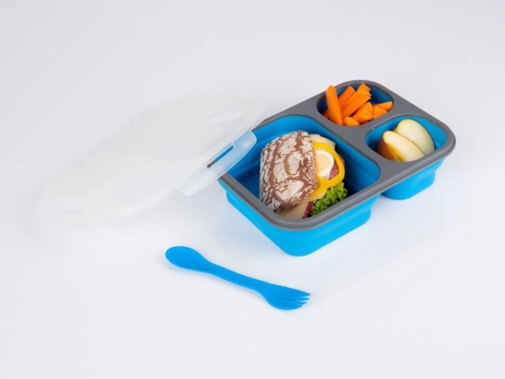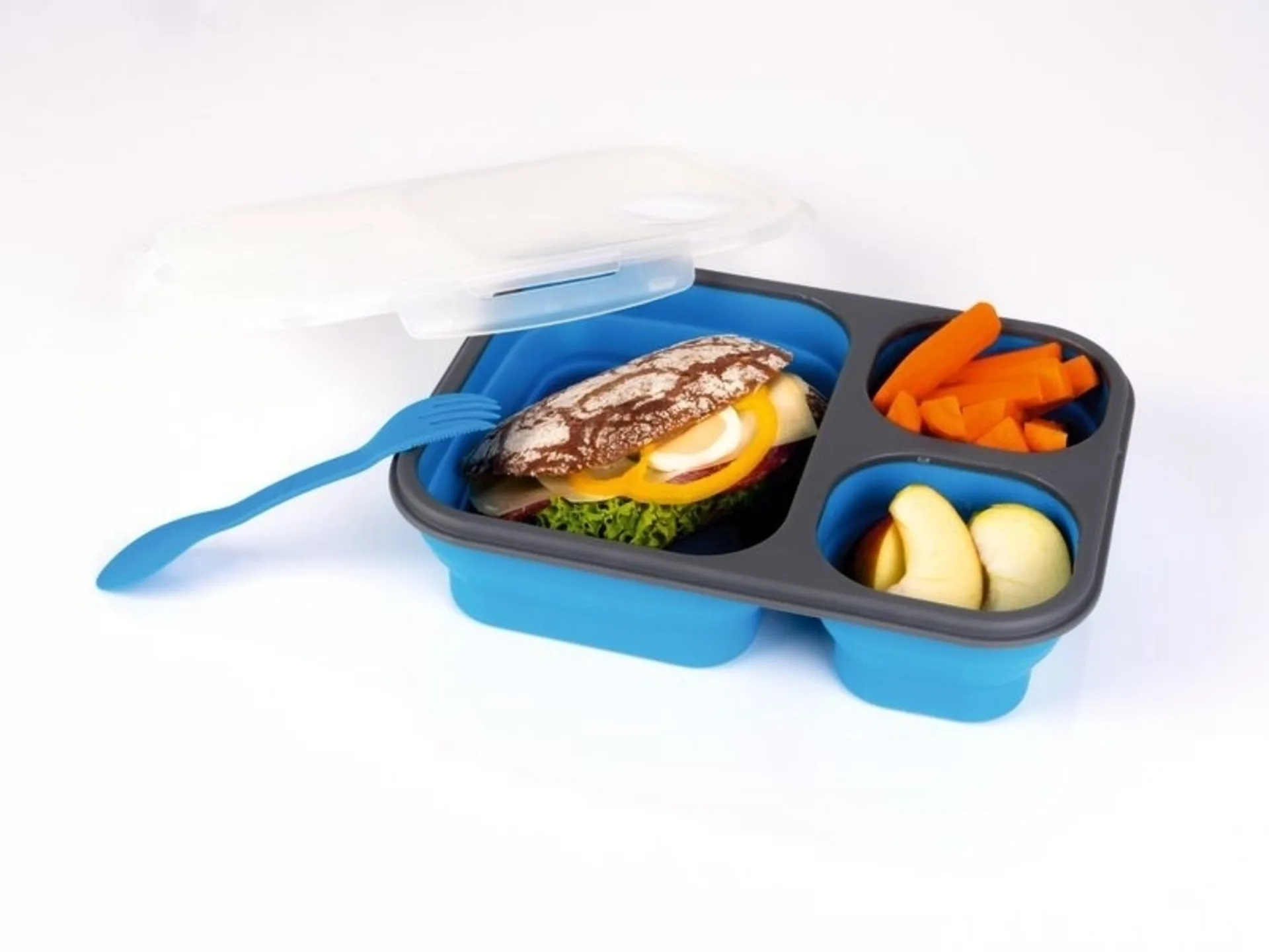 La boîte à lunch est pliable et se range de manière très peu encombrante. Pliable et super plat. Comprend une combinaison de couverts intégrée dans le couvercle avec 4 fermetures de sécurité. Pliée, elle ne mesure que 35 mm de haut.