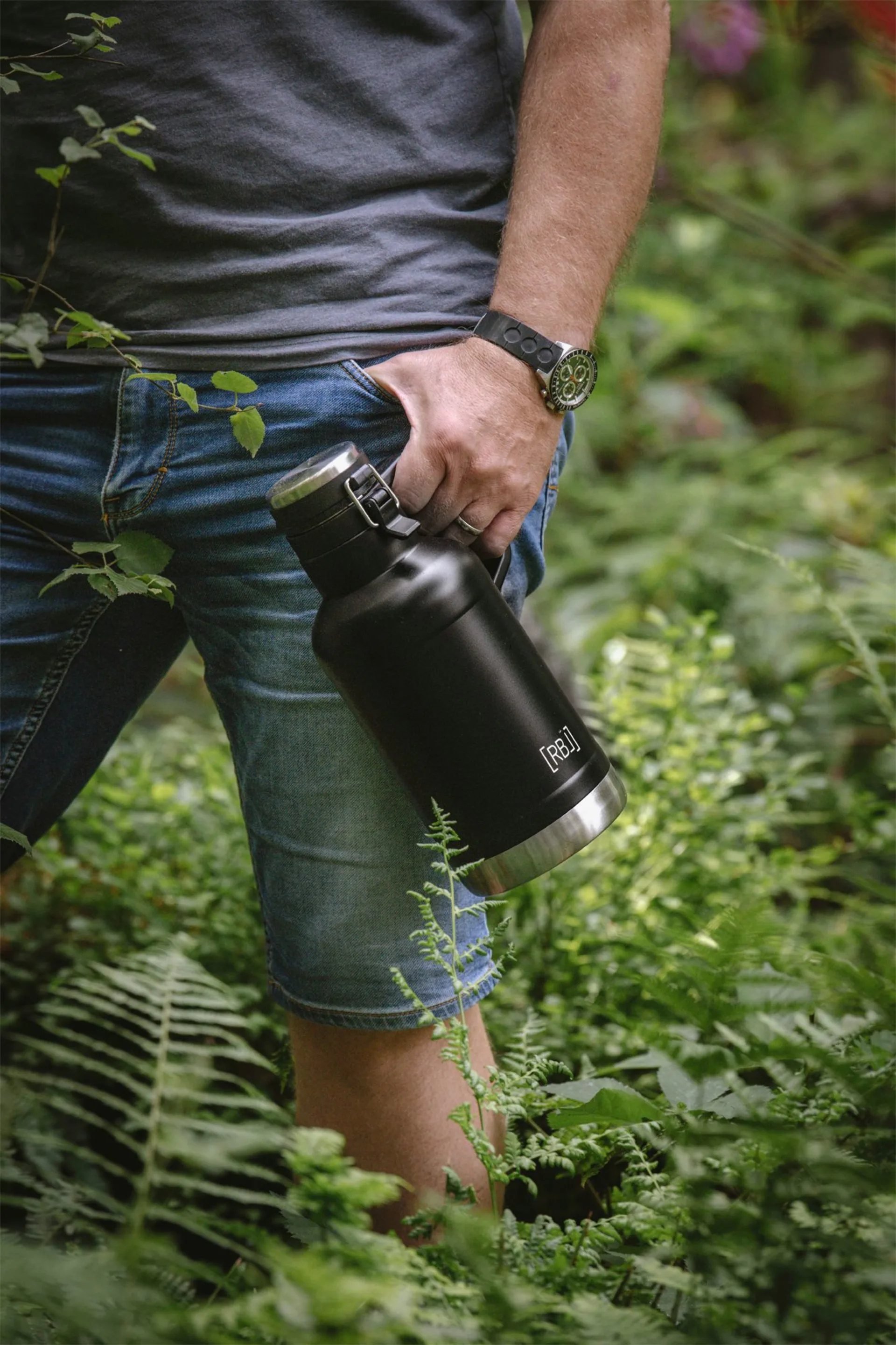 Pot isolant en acier inoxydable à double paroi avec une grande ouverture de remplissage et une poignée robuste en plastique.