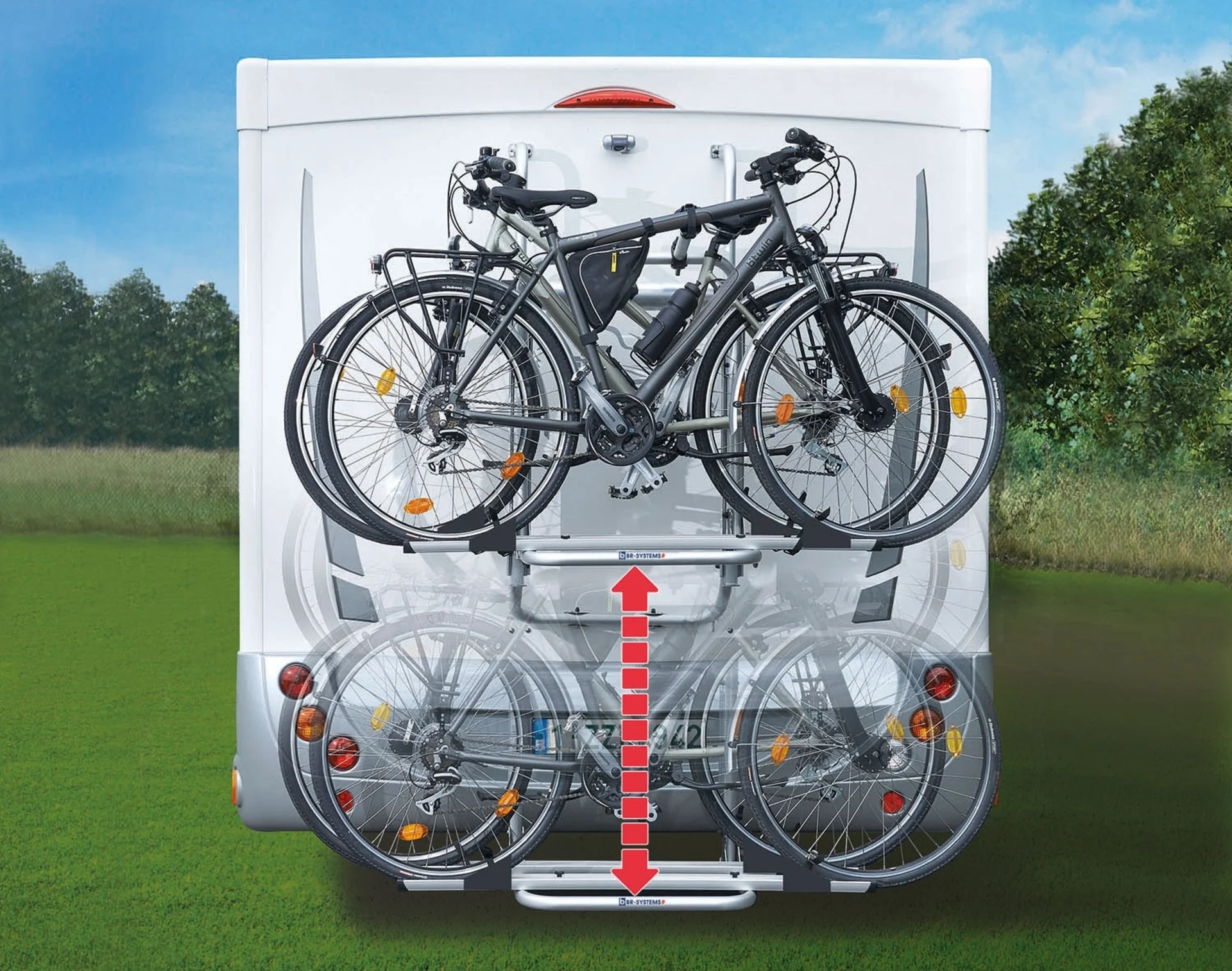 Porte-vélos abaissable pour camping-carsProfited'une mobilité et d'une liberté maximales grâce au lève-vélos électrique. Le Bike Lift breveté est le porte-vélos le plus moderne et le plus innovant sur le marché. Avec ce porte-vélos, tu peux emporter tes vélos partout lorsque tu voyages en camping-car.Grâce à un moteur 12 volts intégré avec interrupteur, la plateforme du Bike Lift peut franchir une hauteur de 110 cm et être abaissée pour charger les vélos. Lorsqu'elle est montée sur la plupart des véhicules, la plateforme peut même être abaissée jusqu'au sol. Il n 'est donc plus nécessaire de soulever péniblement les vélos.Le Bike Lift est équipé en standard d'un interrupteur de protection manuel. Il y a aussi un arbre pour la sécurité mécanique. Grâce à la manivelle fournie, le Bike Lift peut être utilisé sans restriction même en cas de panne de courant.Lorsqu'il n'y a pas de vélos sur le Bike Lift, la plateforme peut être relevée facilement et en toute sécurité afin d'améliorer le confort de conduite. La position des supports de roues réglables est très facile à régler.La charge maximale est de 60 kilos, ce qui correspond à trois vélos traditionnels ou deux vélos électriques.