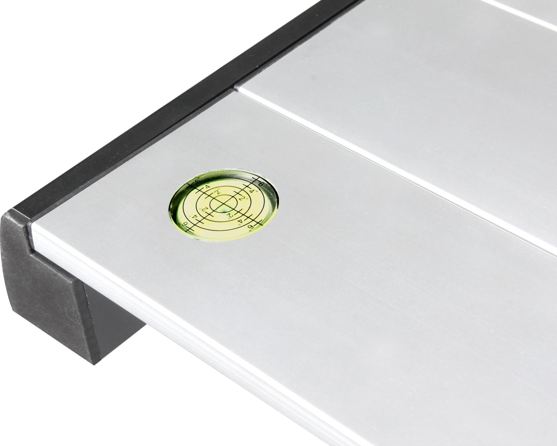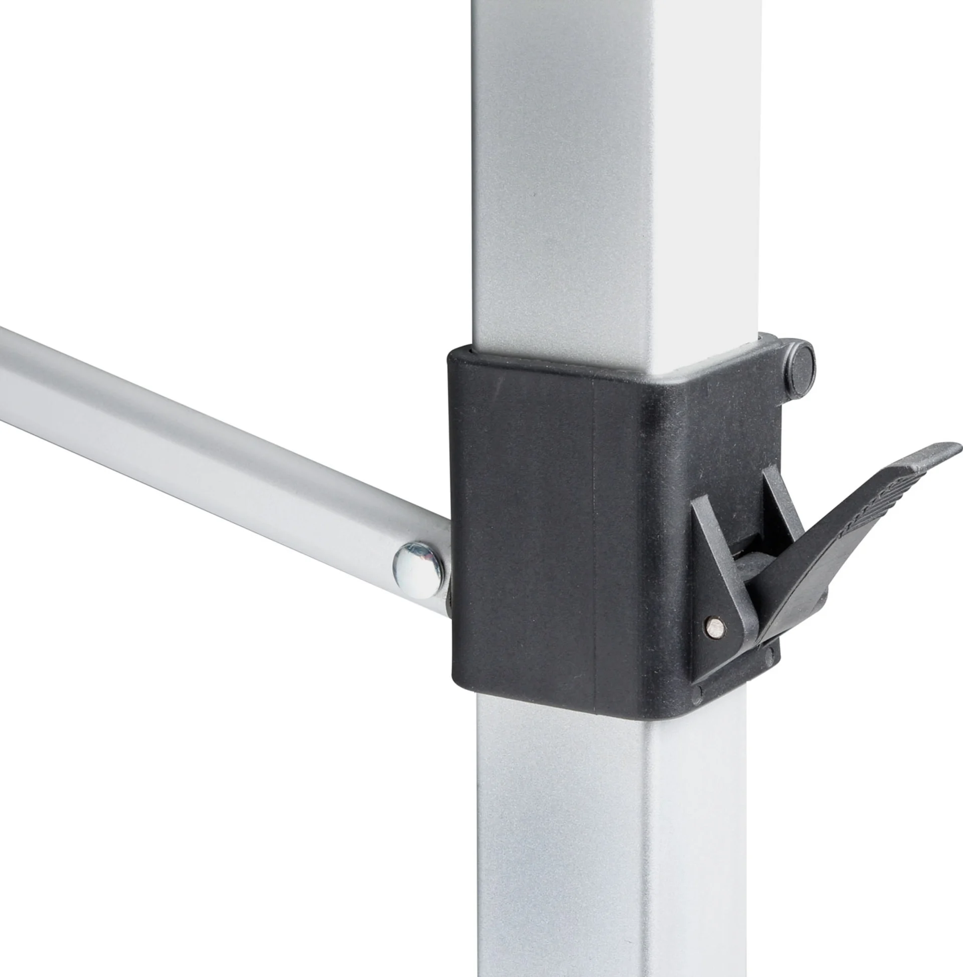 Table pliante et roulante en aluminium avec un nouveau piètement qui se base sur la construction classique avec 4 pieds verticaux. Construction très stable. Le plateau de table sans fente (Gapless Table Top) est fixé au châssis de la table grâce à un mécanisme de verrouillage spécial. Contrairement aux tables roulantes classiques avec un piètement en ciseaux, la Quadra offre suffisamment d'espace pour les jambes sur les 4 côtés. Sac de rangement inclus (100 % polyester). Disponible en 2 tailles.