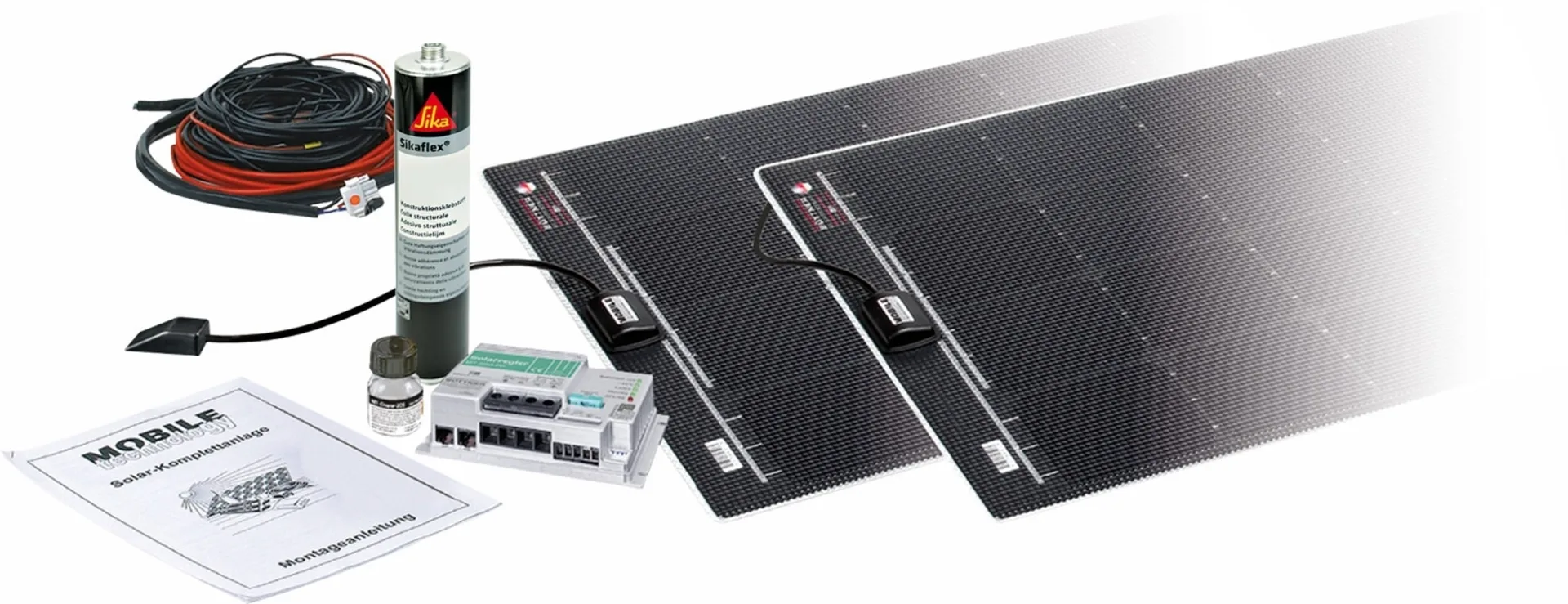 Les installations solaires complètes ultraplates MT Flat Light incluent tous les accessoires de montage. Chaque installation est équipée de composants individuels de haute qualité et d'une finition de qualité supérieure. Les modules solaires Flat Light sont équipés de cellules monocristallines haute performance. Celles-ci conservent leur tension de sortie élevée même en cas de températures extérieures extrêmes et garantissent des performances journalières élevées même dans les régions de vacances du sud. Le câble extérieur utilisé est résistant aux UV, tout comme la sortie de câble stable et étanche à l'eau sous pression. C'est également le cas de la traversée de toit, fabriquée en mousse rigide PU de haute qualité. Le câble solaire est acheminé à l'intérieur par ce biais. Ces deux éléments sont stables mais aussi extrêmement plats afin de garantir une hauteur de montage extrêmement faible. La régulation solaire est également à la pointe de la technologie.