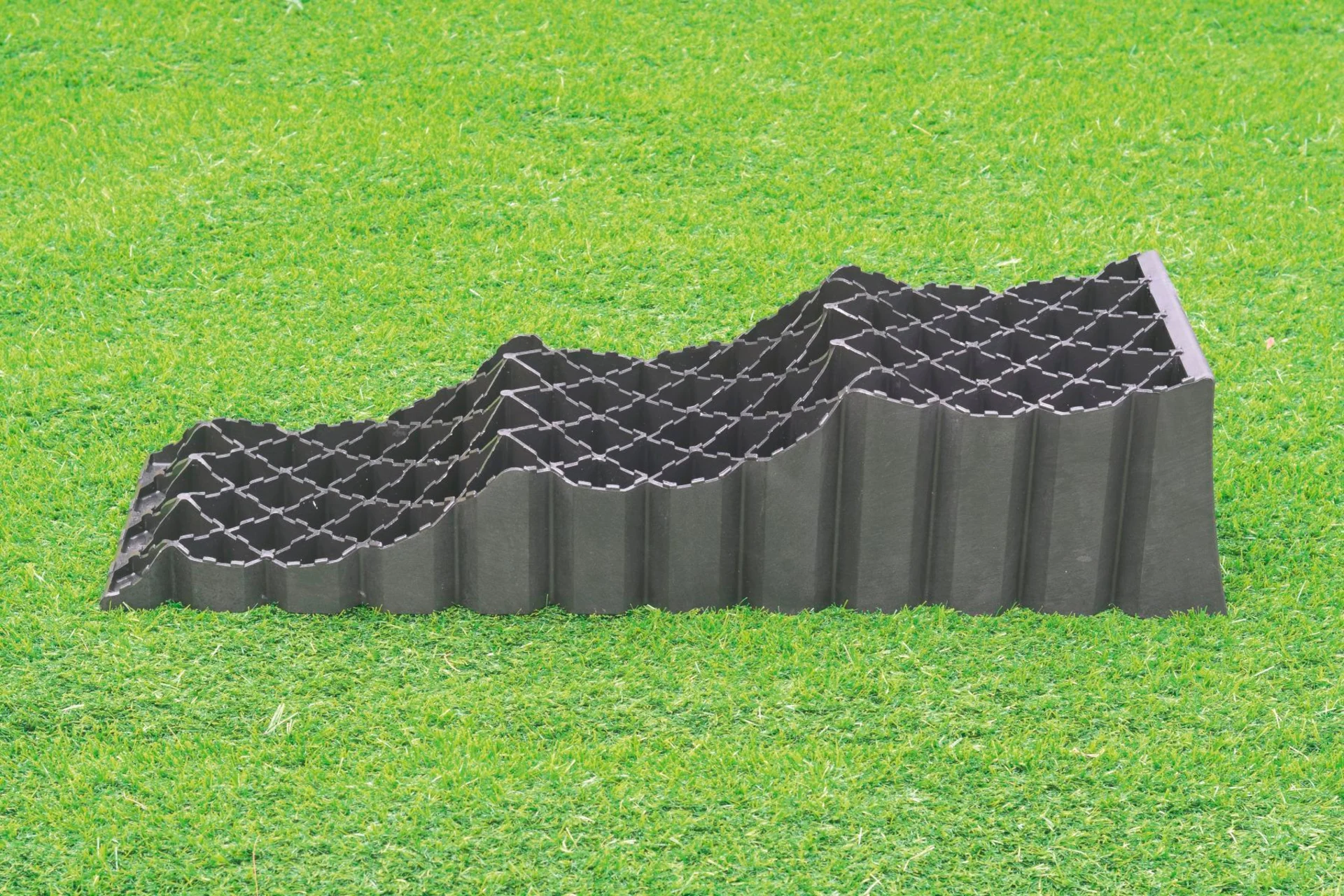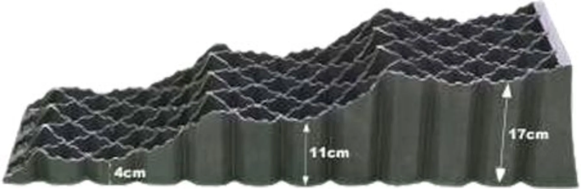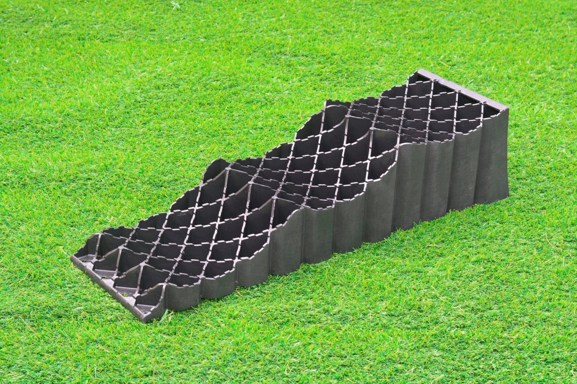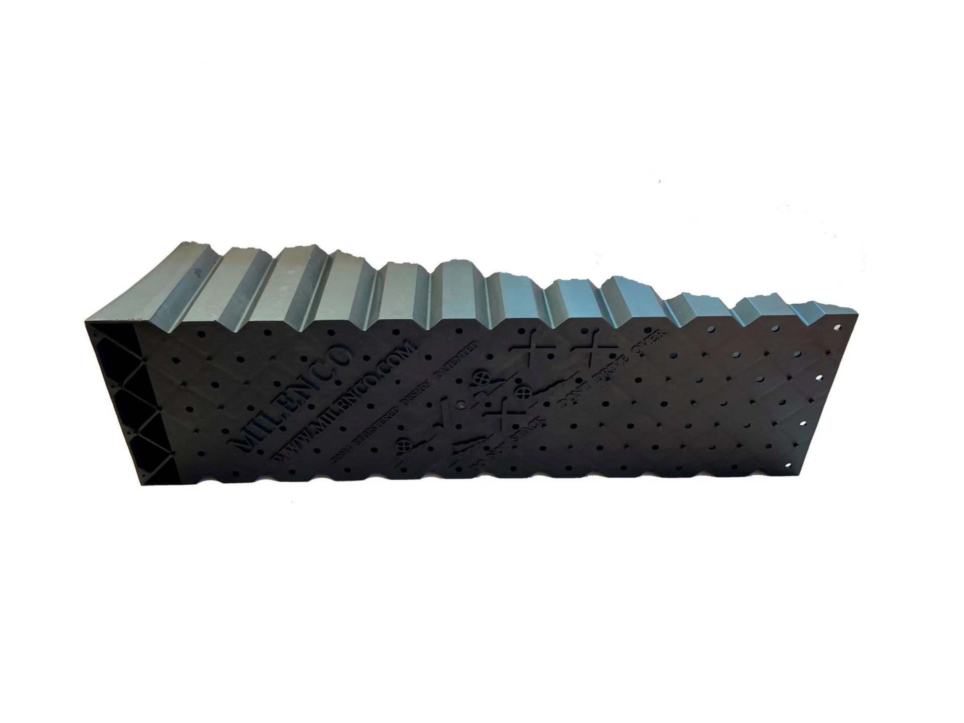 La surface de la grille avec la bande de roulement intégrée assure une adhérence stable. Le design des marches donne un appui supplémentaire au pneu lorsqu'il atteint la hauteur correspondante, les marches en forme d'auge empêchant les pneus de rouler et rendant inutile l'utilisation de butoirs. La plaque de base stable permet une utilisation sur le sable ou sur un autre sol mou. Le bord avant antidérapant empêche la cale de glisser lorsqu'elle est montée et évite d'avoir à placer des tapis antidérapants sous la cale.