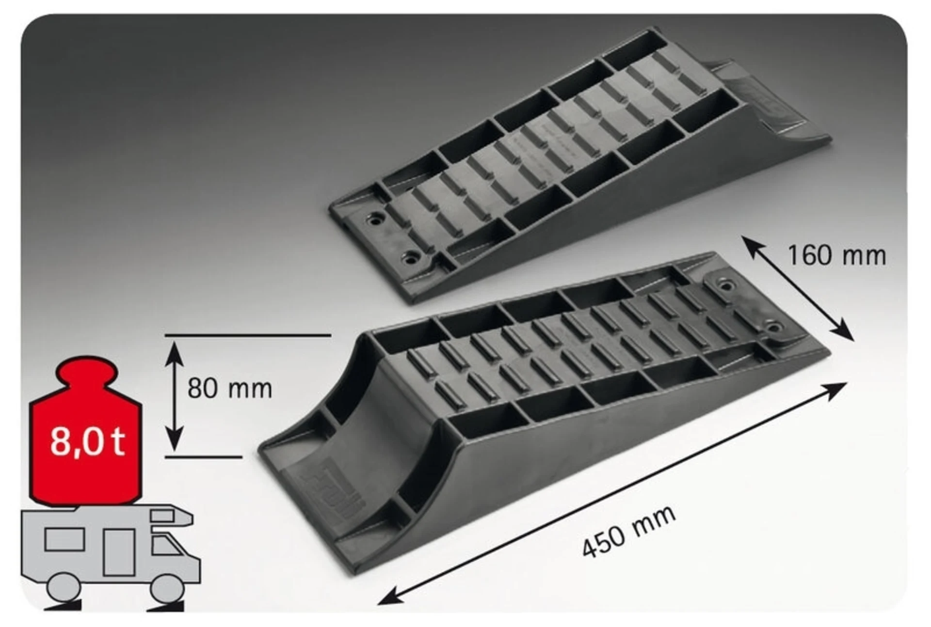 Pour monter le véhicule en continu. Convient aussi aux caravanes à essieu tandem. Extrêmement robuste, stable, résistant. Avec une surface adhérente pour une bonne tenue des pneus.