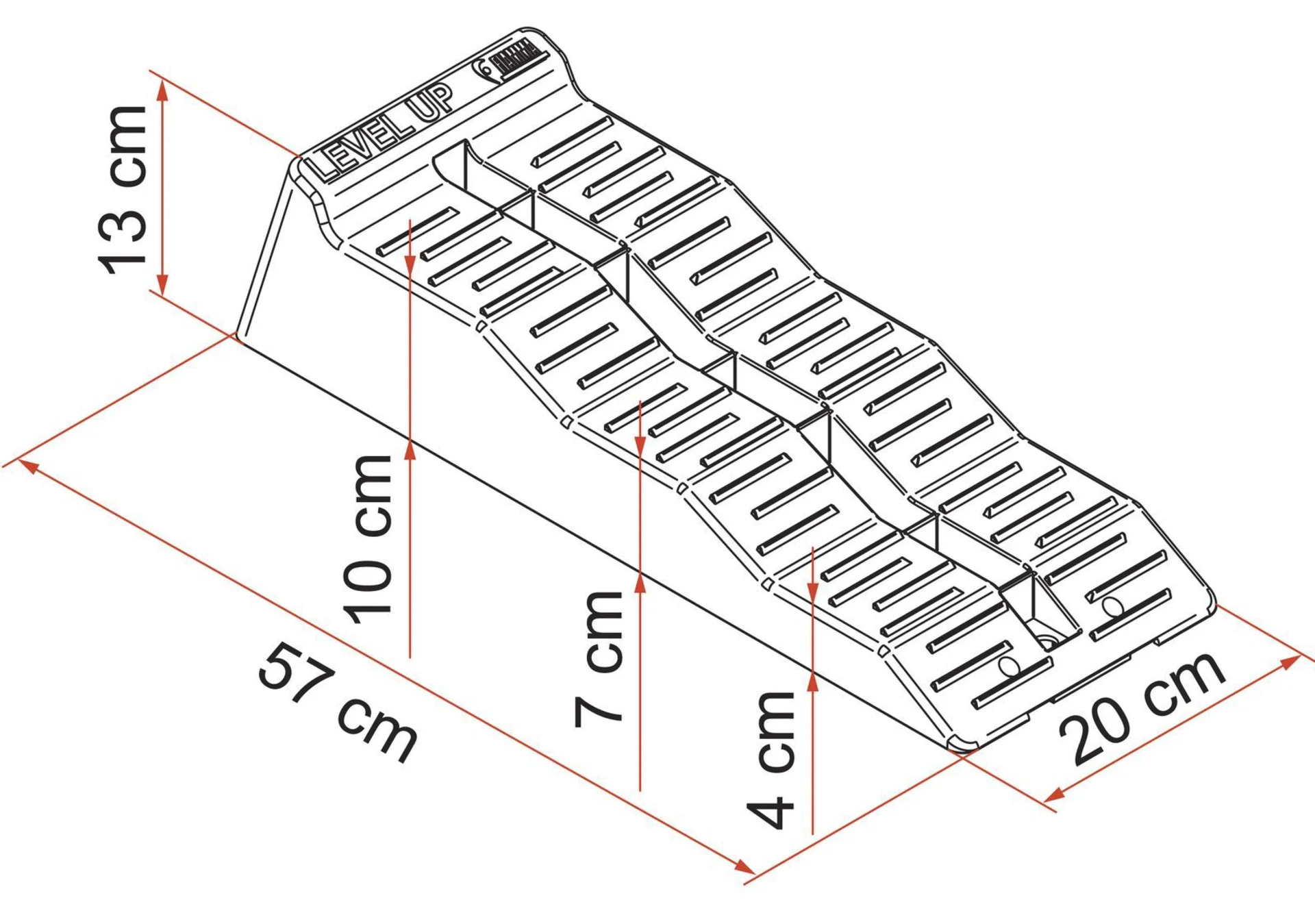 Les cales d'accès Fiamma Level Up empêchent de manière fiable toute inclinaison. Les trois niveaux, positionnés à 4, 7 et 10 cm, permettent de compenser les inégalités. Grâce à la poignée, la cale peut être placée facilement et en toute sécurité sous le véhicule. La cale est fabriquée en polyéthylène solide, mais elle est si légère qu'elle est facile à transporter. Une cale ne pèse qu'environ 1,45 kg.