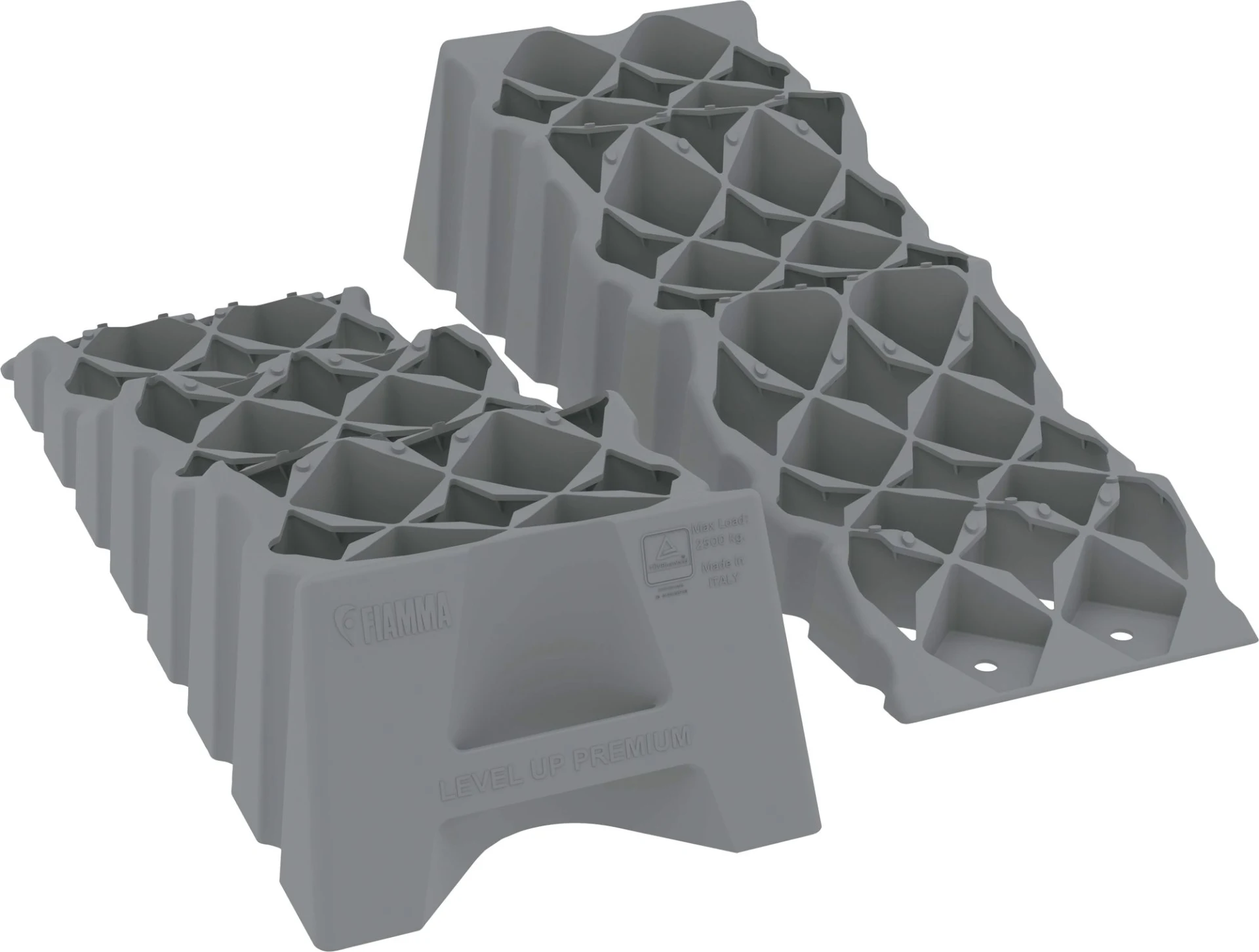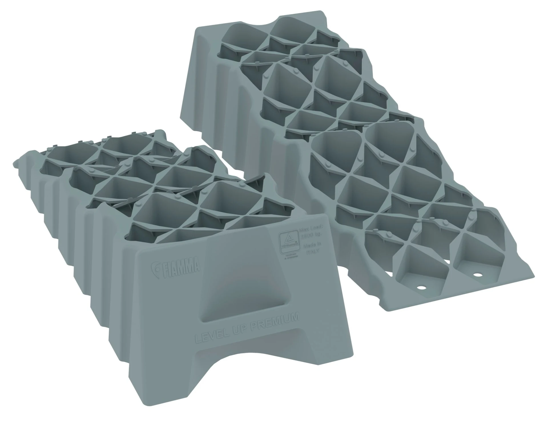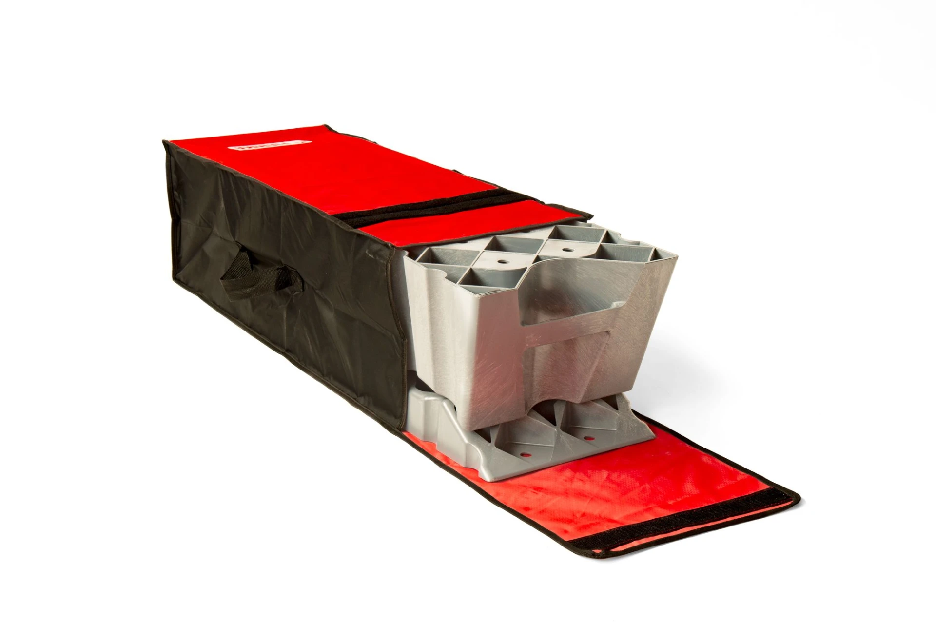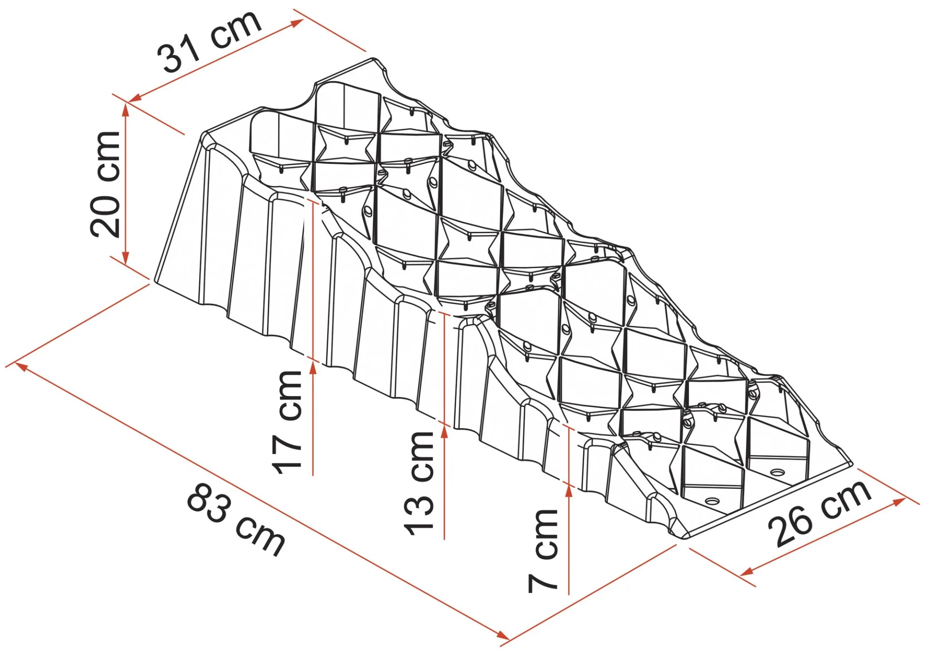 Avec trois niveaux de 7, 13 et 17 cm de hauteur. Garantit des performances optimales sur les terrains instables. La grande surface d'appui et les marches spécialement formées protègent le pneu de la déformation. La structure révisée est conçue pour une grande capacité de charge. Malgré ses dimensions généreuses, la cale à marches est facile à transporter grâce à la poignée pratique à l'arrière. Inclut un sac de transport pratique.