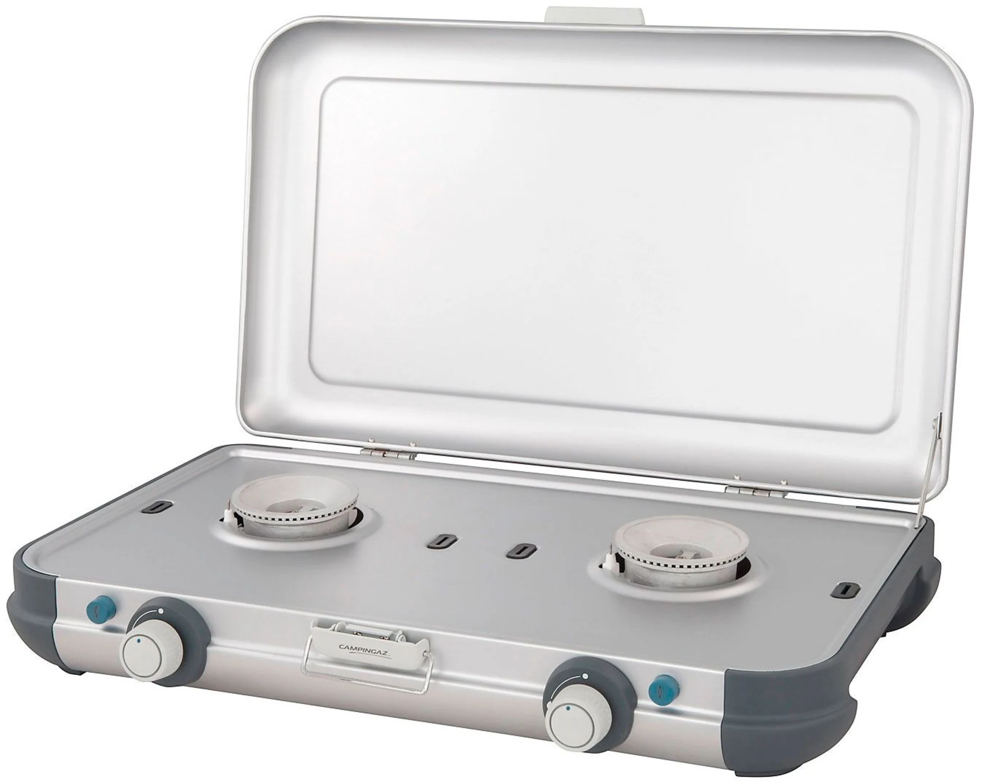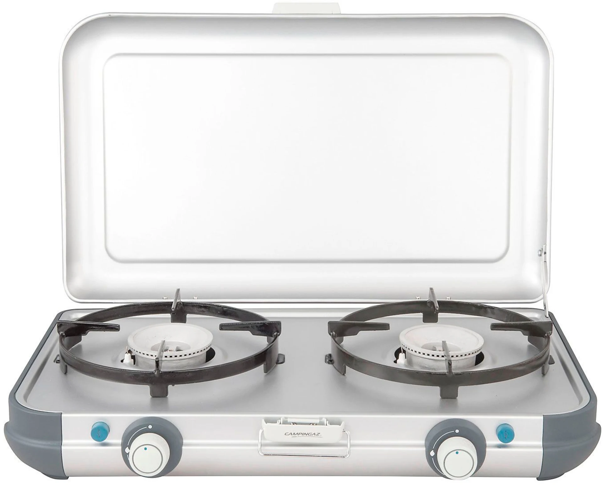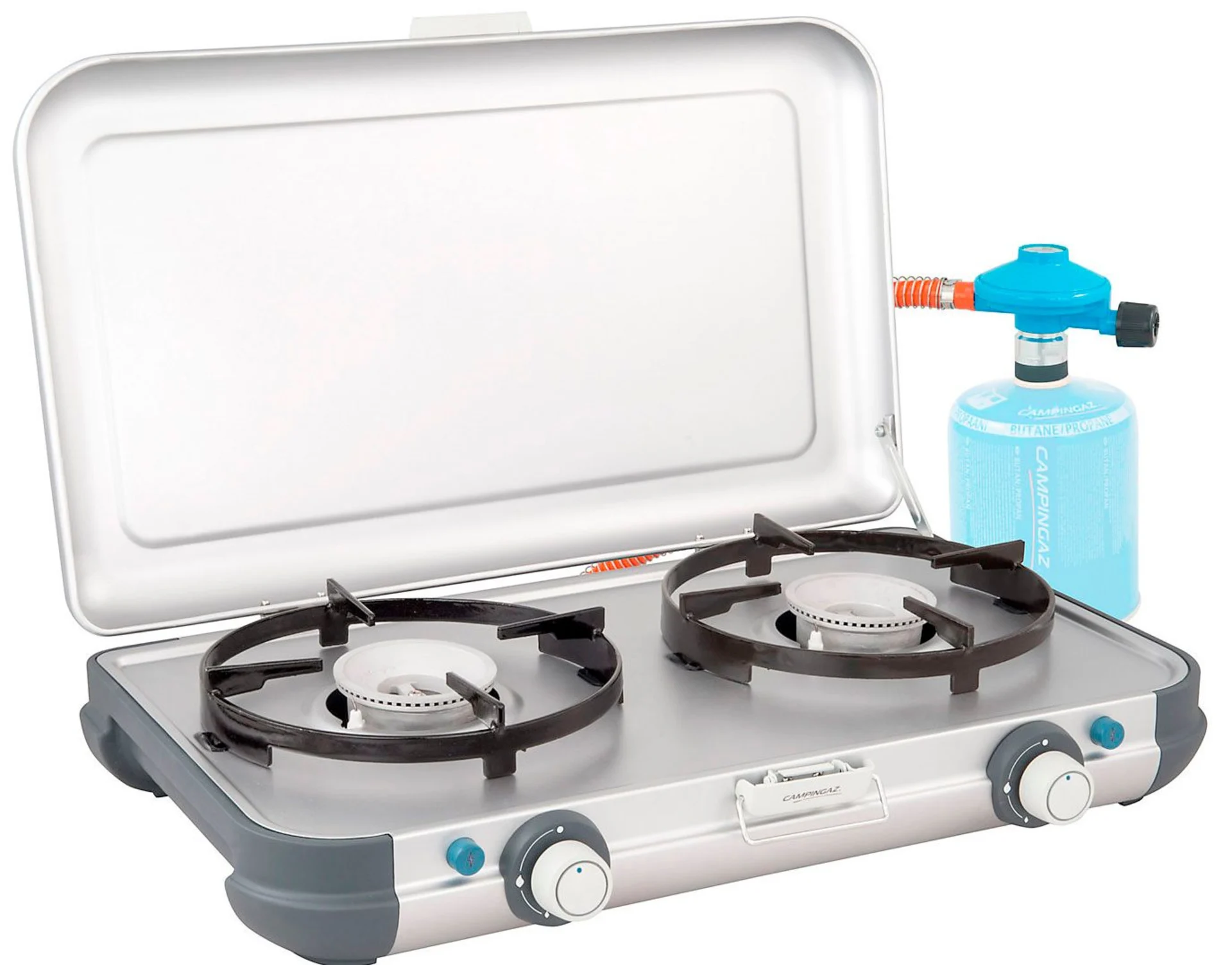Cuisinière légère et facile à transporter avec deux brûleurs. Idéal pour les excursions de tout type. Disponible pour fonctionner avec une cartouche de gaz ou une bouteille de gaz, selon la durée des vacances.