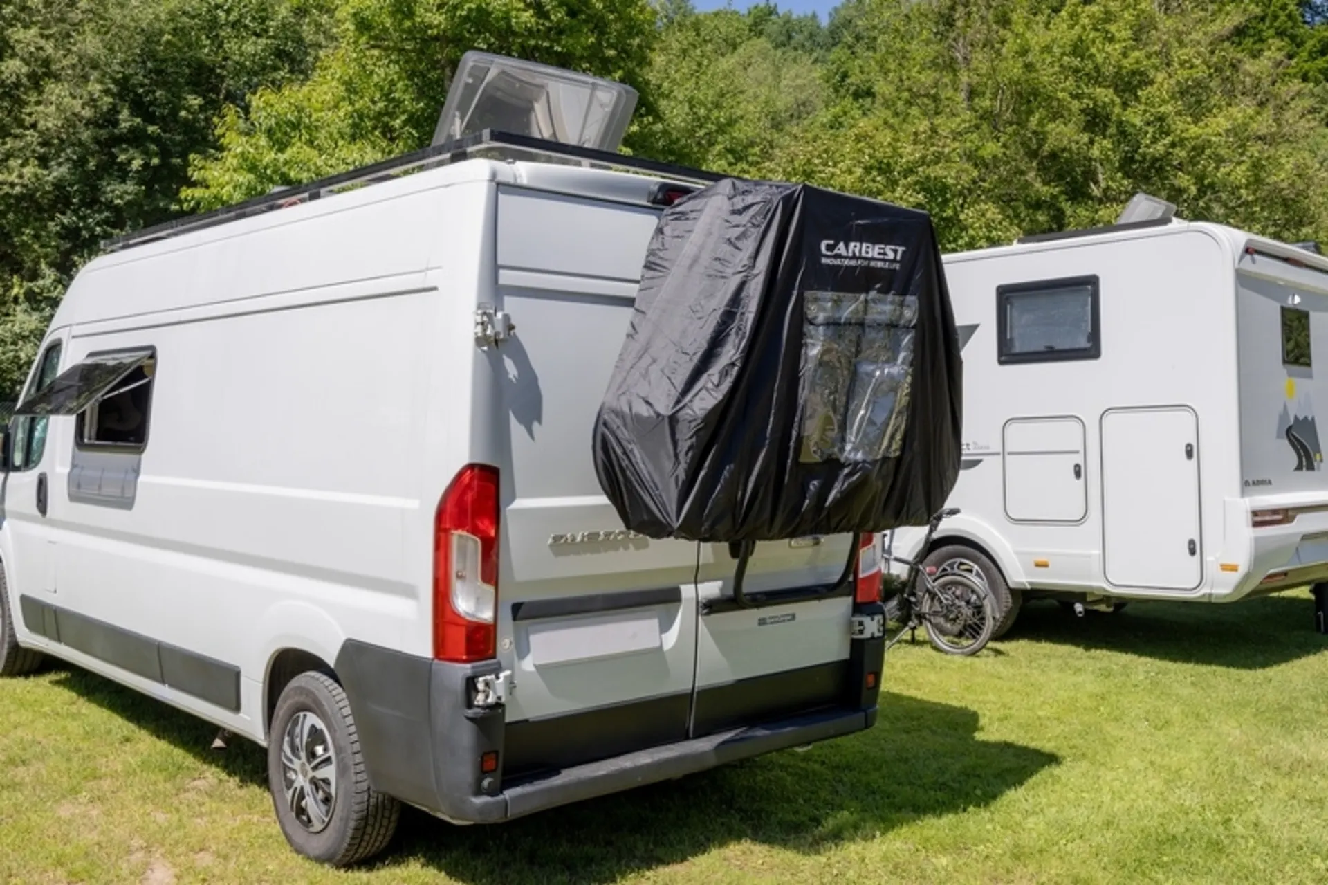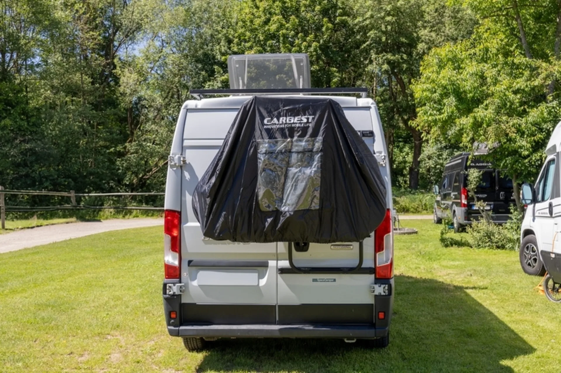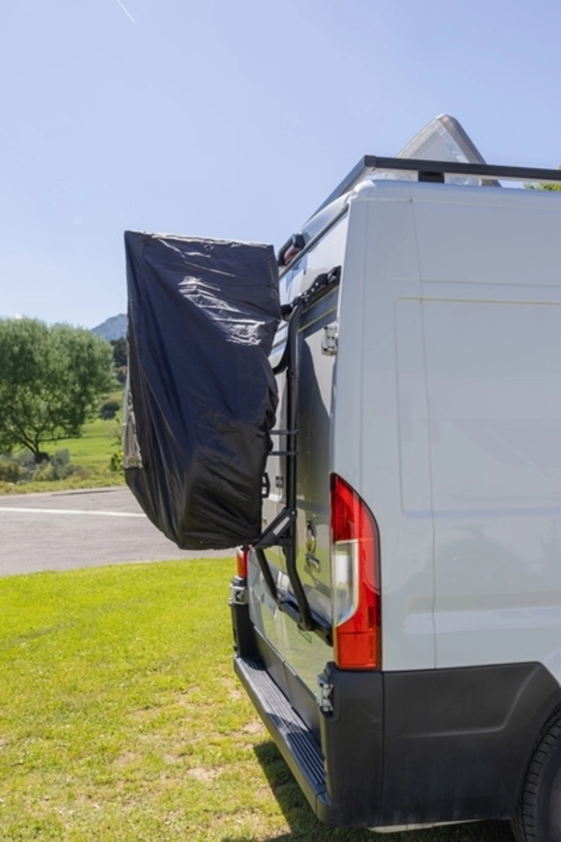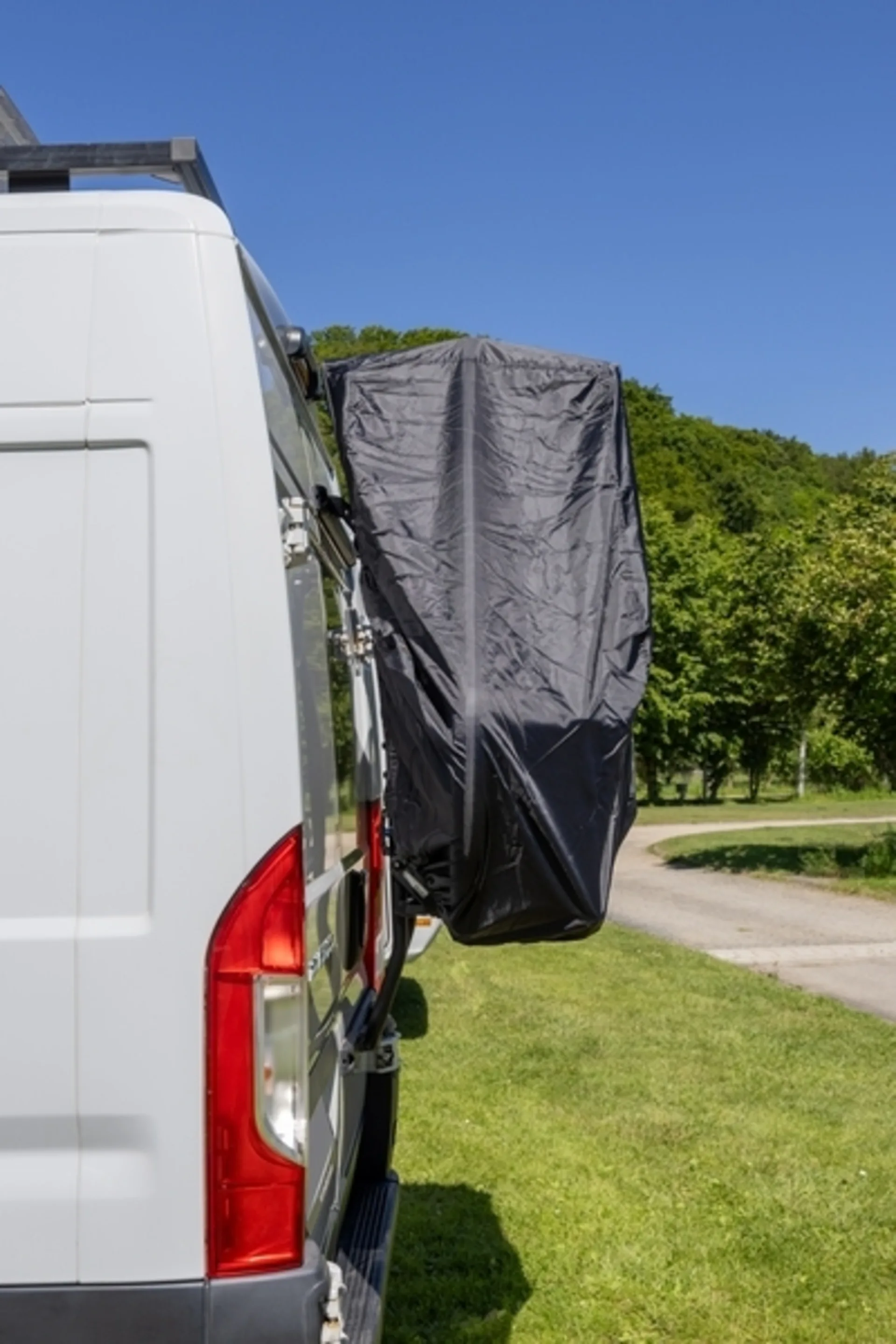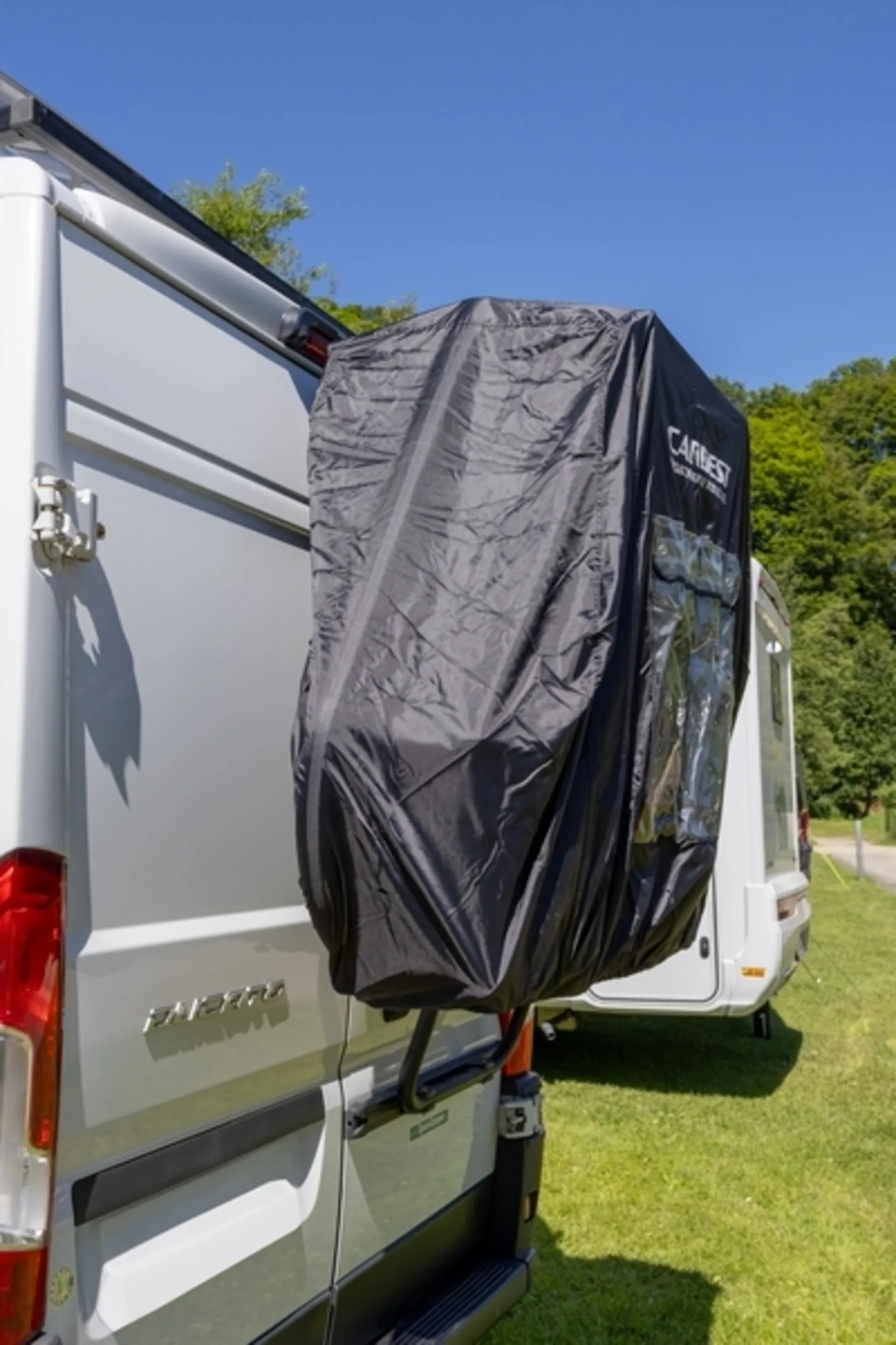 La housse de protection noire pour camping-cars est fabriquée en polyester et est imperméable. Comprend une poche pour le panneau de signalisation et une bande intérieure pour le fixer.
