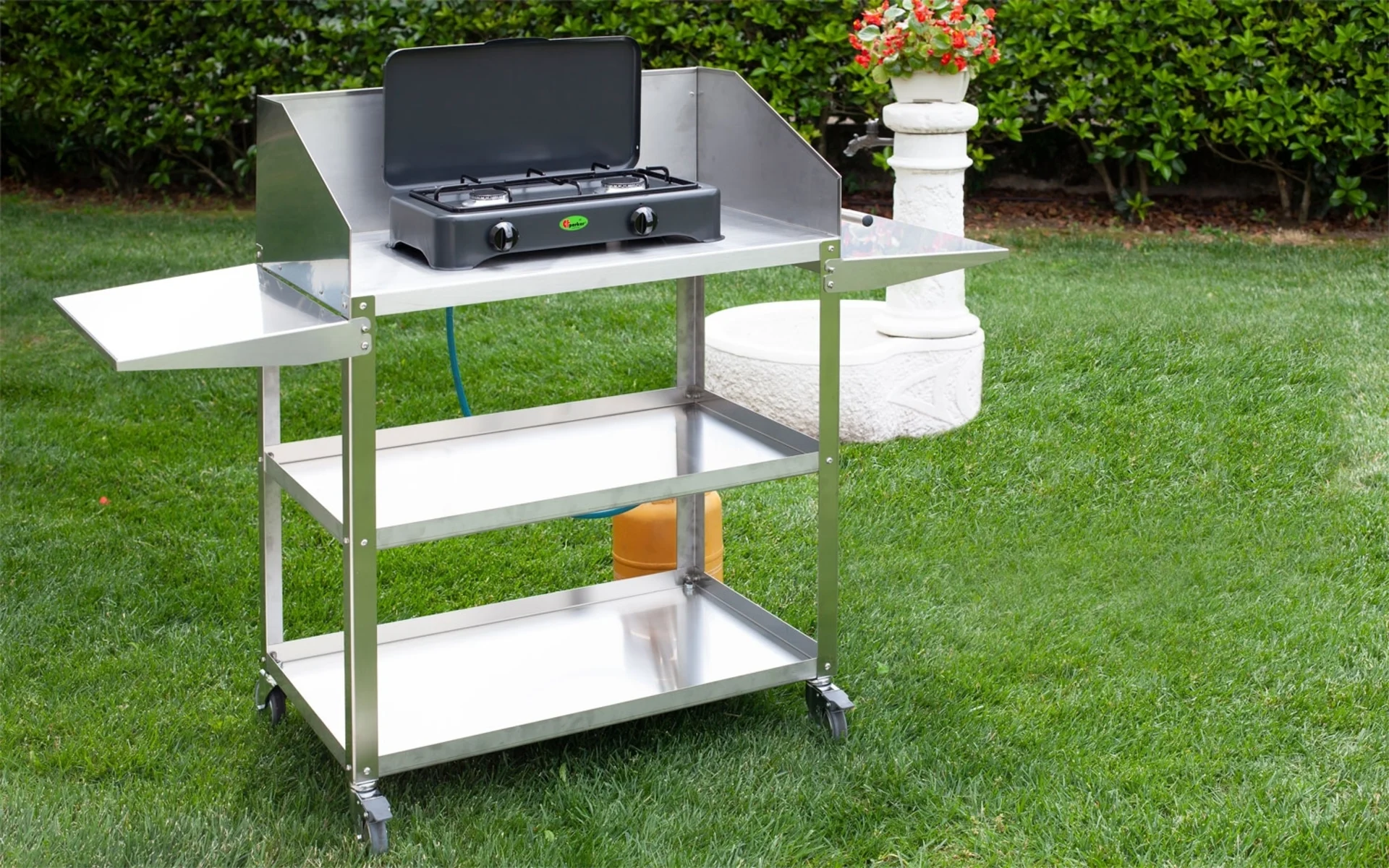 Hochwertiger, emaillierter Kocher mit schwarz-emailliertem Rost und Brennerabdeckungen.