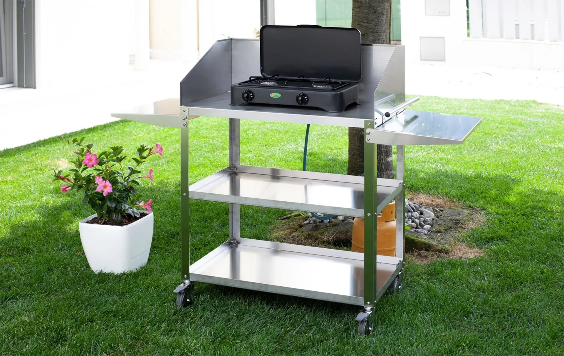 cuisinière à 2 feux gaz, brûleur en alliage Pyral N2, couvercle de brûleur émaillé, support de casserole en acier plat émaillé. Superbe design grâce à la couleur spéciale gris foncé