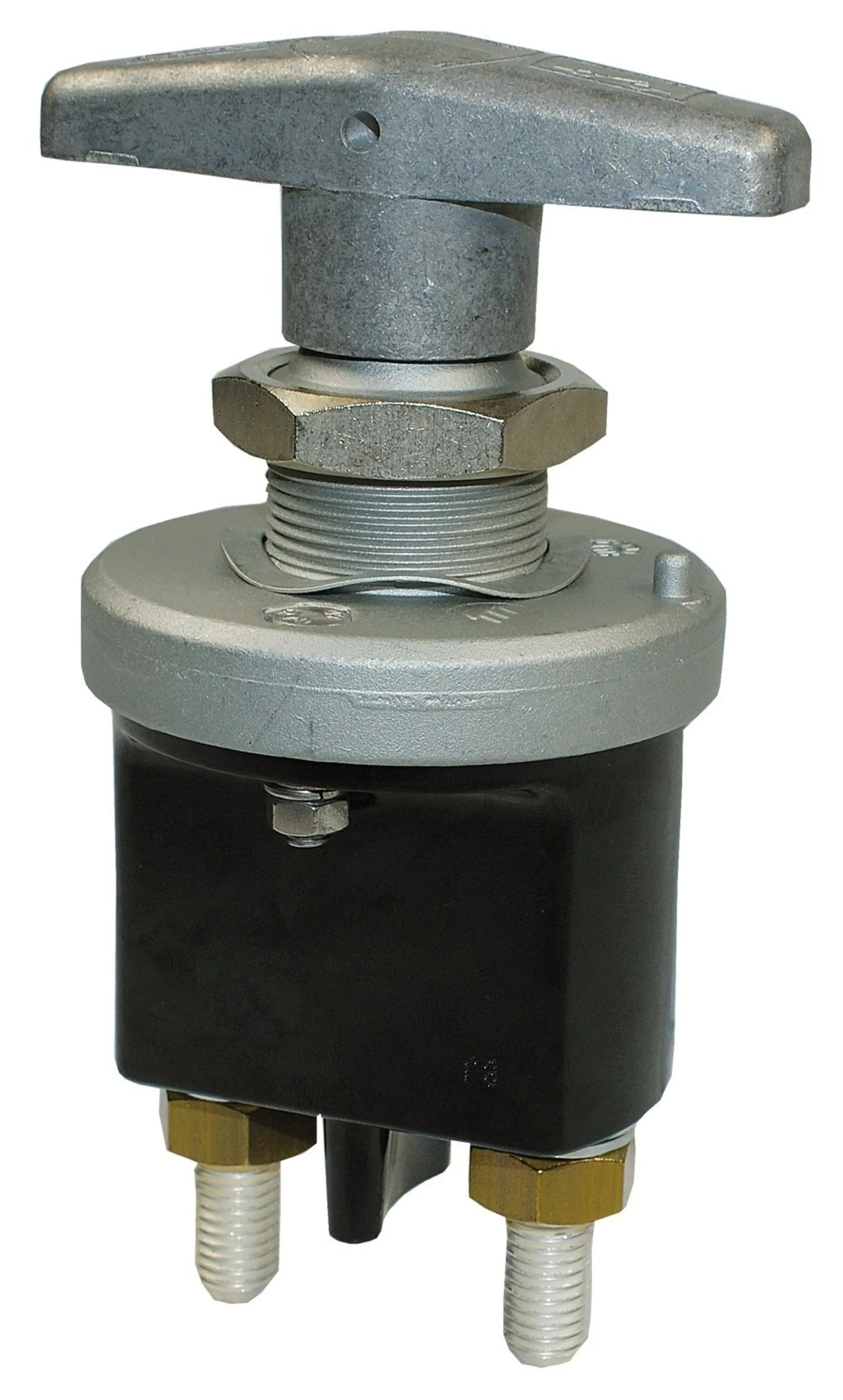 Forme de l'interrupteur : interrupteur rotatif Fonction mécanique : à crans Fonction électrique : à fermeture Tension : 12 à 24 volts Capacité de charge : 250 ampères Trou de montage : rond Diamètre : 30.5 mm Eclairage : non Etanche : oui Degré IP : 65 Informations supplémentaires : - Distance entre les trous : 60mm - ø de montage : 30.5mm, ø 68 x 149.8mm - 250A à 24V, 2500A max. 5 sec. - Raccordement du câble : 2 x M10 - contacts plaqués argent