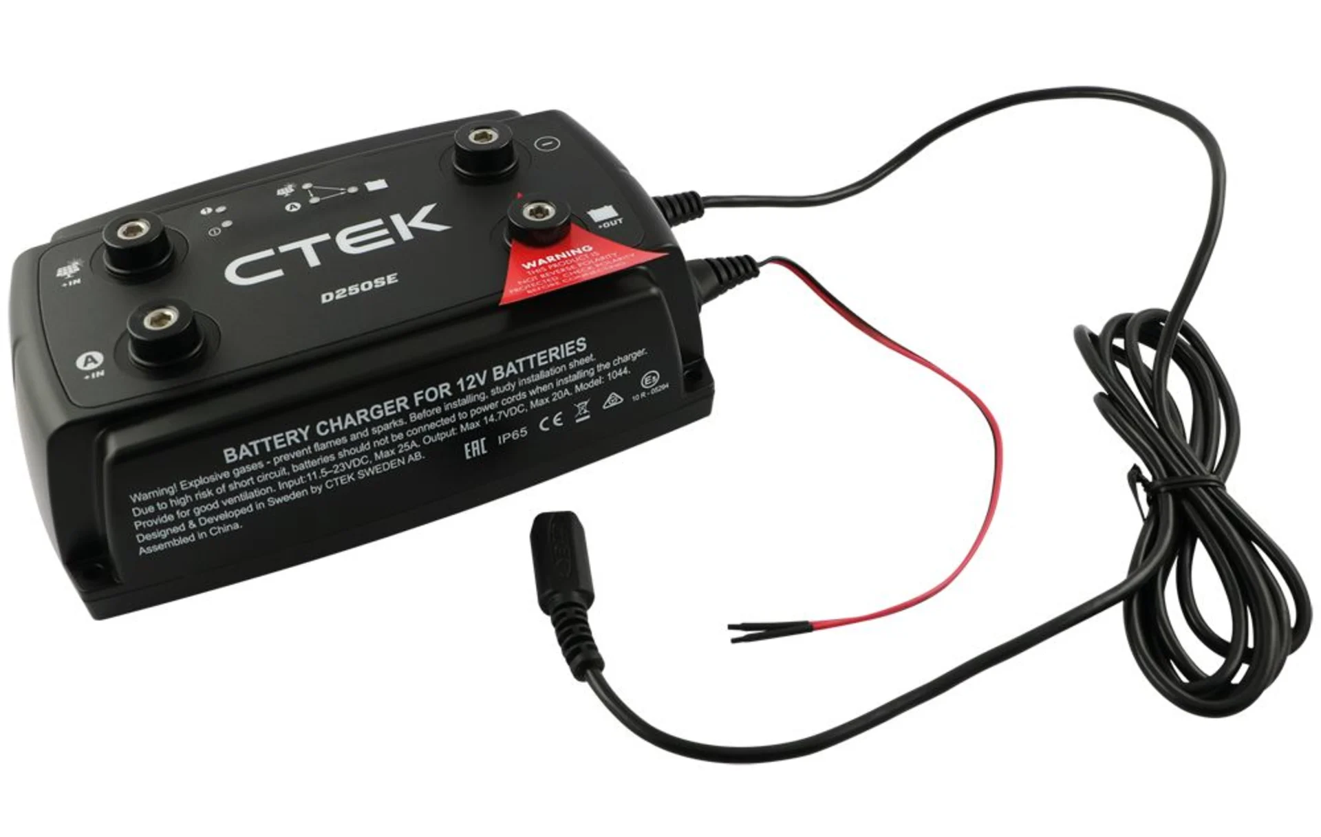 Fonctions : - convertisseur de charge DC 12->12 V - nouveau aussi pour les batteries au lithium - aussi pour les véhicules Euro-6 avec générateurs intelligents - relais de séparation de batterie : un 13,1 V, de 12,8 V Le chargeur tire son énergie de sources de courant continu comme les alternateurs, les panneaux solaires ou les éoliennes et optimise ce courant. Le D250SE sélectionne automatiquement la meilleure source de courant continu connectée (parmi 2) pour le but recherché et bascule entre ces sources d'énergie. Aussi pour les batteries supplémentaires dans le véhicule ou sur la remorque ! 40-300 Ah Bi-directionnelle, ce qui signifie que lorsque la batterie supplémentaire est chargée par un chargeur 230 V, la batterie de démarrage est également chargée à partir d'une certaine valeur de tension. Remarque : La batterie de démarrage et la batterie de consommation doivent être du même type de batterie (AGM, acide de plomb, lithium).