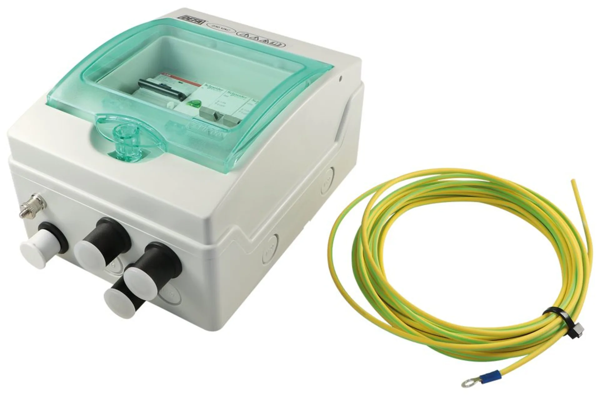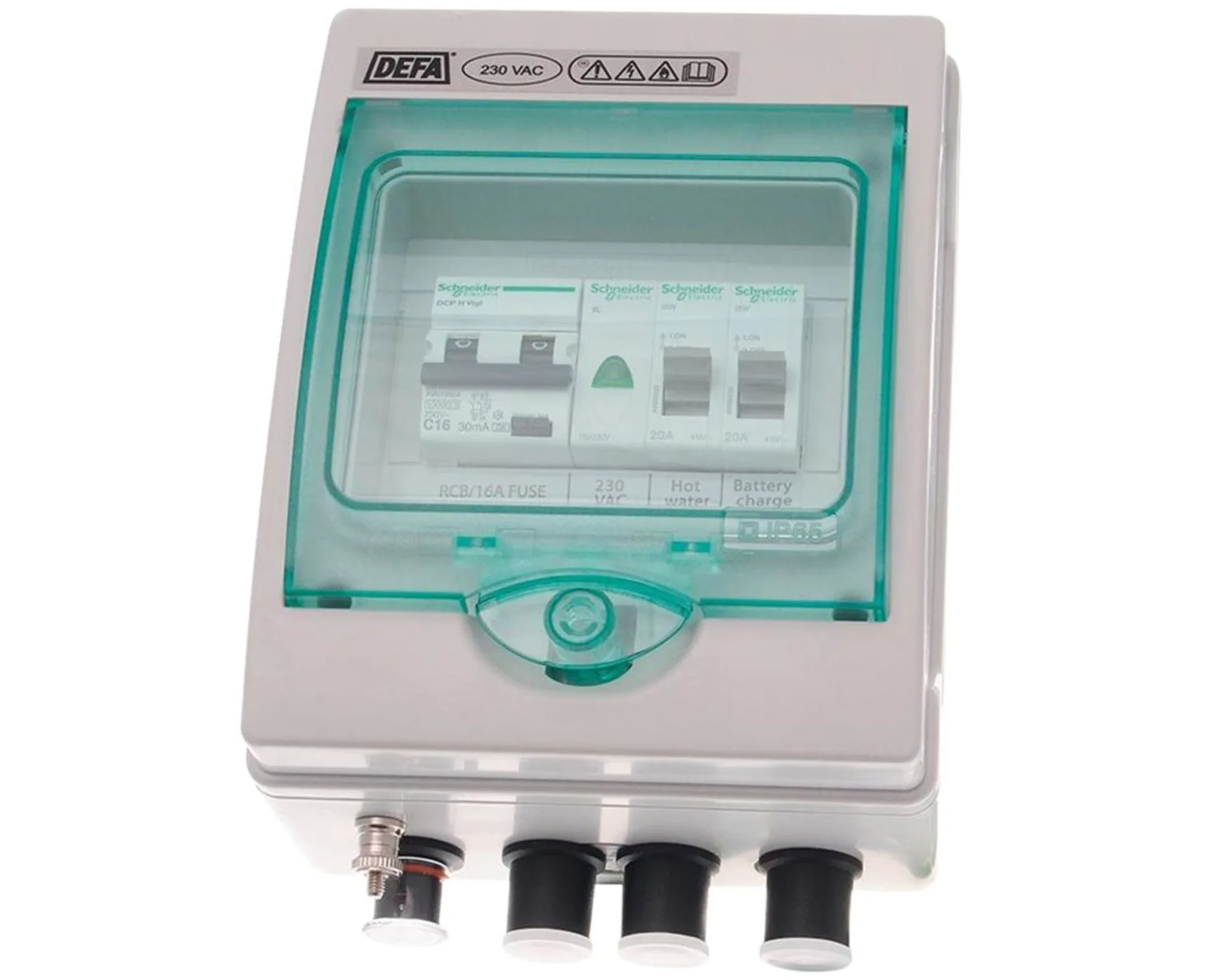 Centrale électrique avec fusibles et disjoncteur différentiel 30 mA. La centrale électrique (230 VAC/16 A, IP44) est équipée de connecteurs DEFA PlugIn. Deux des trois sorties peuvent être commutées séparément. Un zinzinaver intégré à la centrale protège le bateau de la corrosion. Certificats : EN61558-2-4, ISO13297
